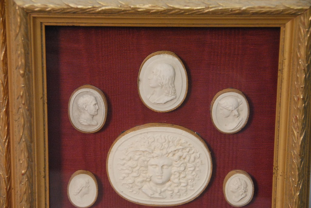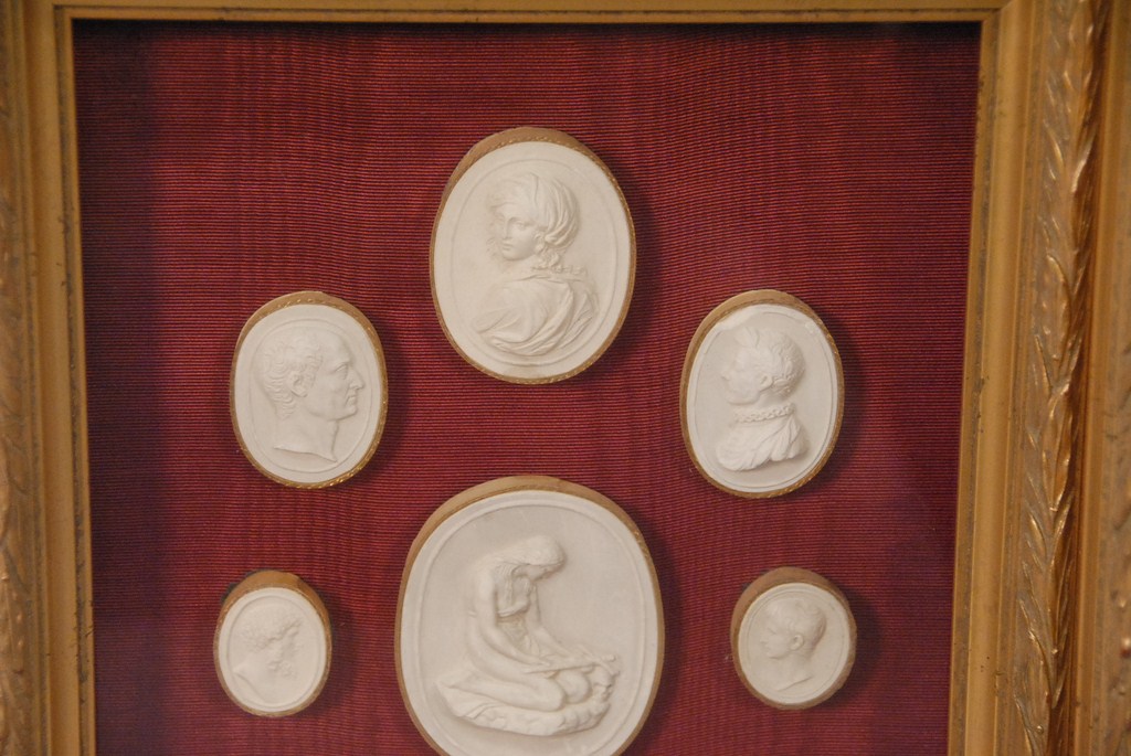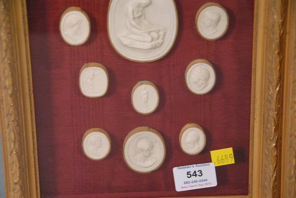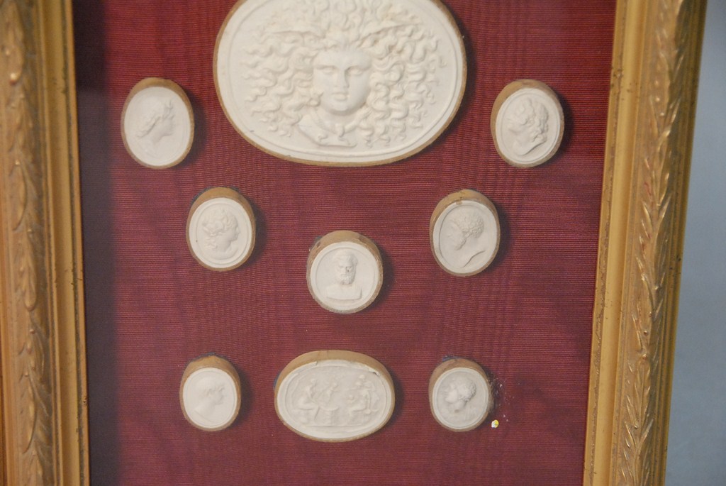 Two sets of twelve souvenir plaster Intaglios Grand Tour plaques of classical figures and mythological deities on red moire, circa 1830. three with chips. Provenance: From prominent Woodbridge, Connecticut family collection.