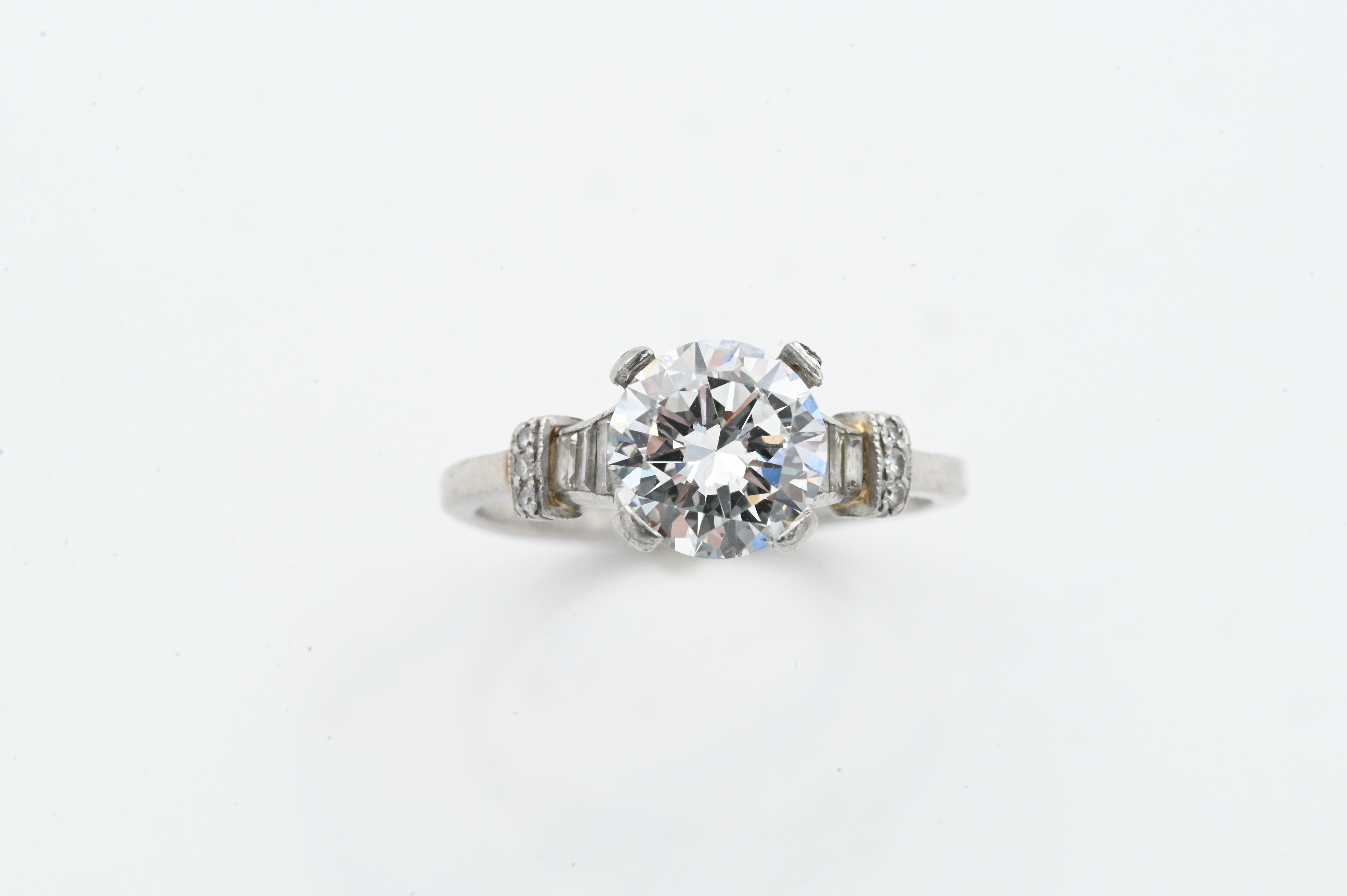 A vintage platinum engagement ring set with a 2.10-carat round center diamond, flanked by tapered baguette diamonds and additional small round diamonds along the shoulders. Classic raised prong setting with narrow platinum shank.