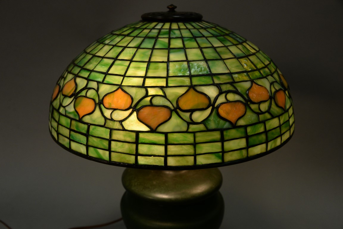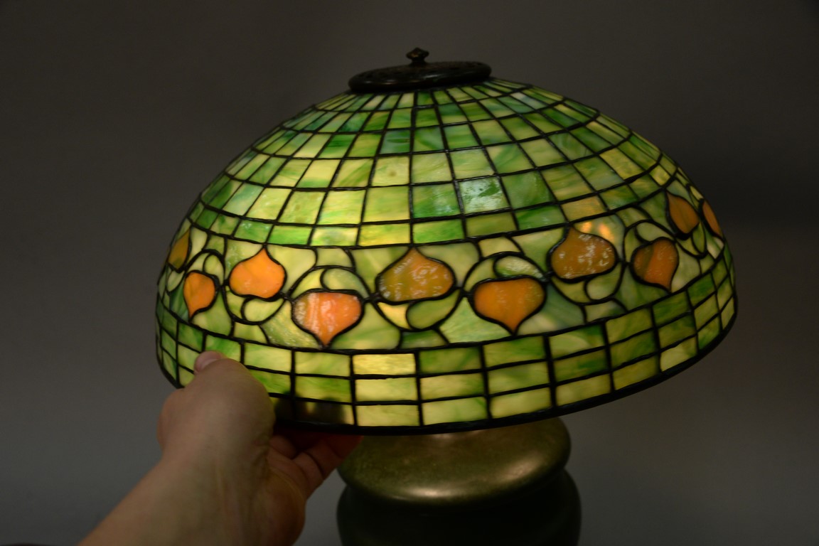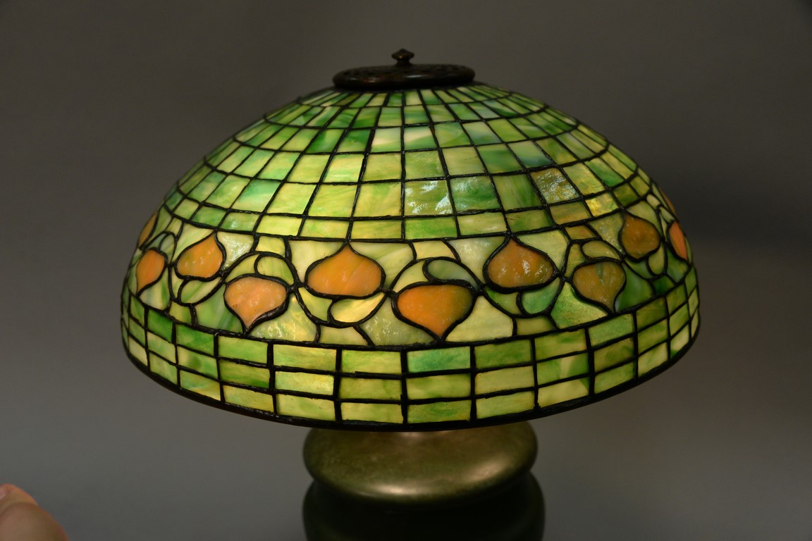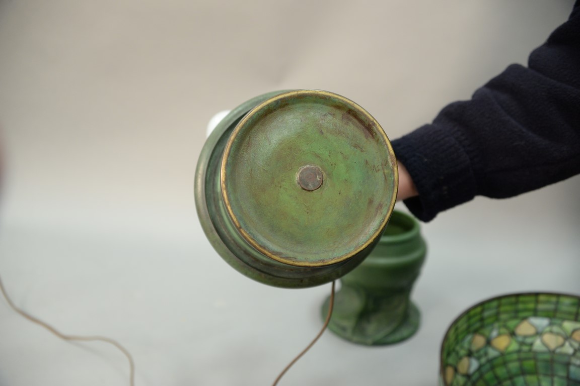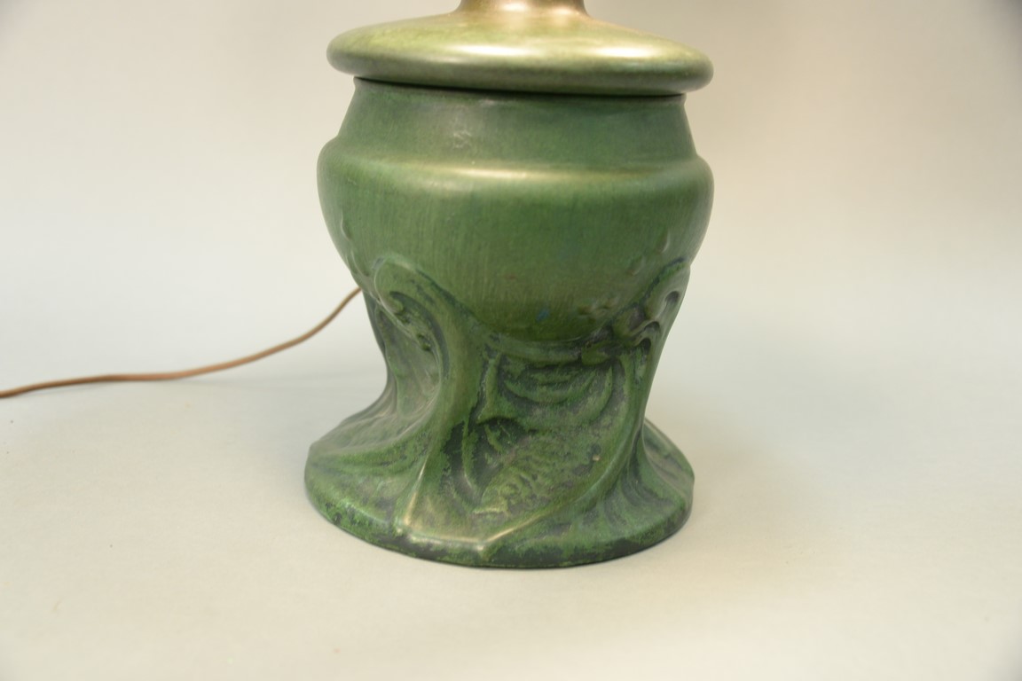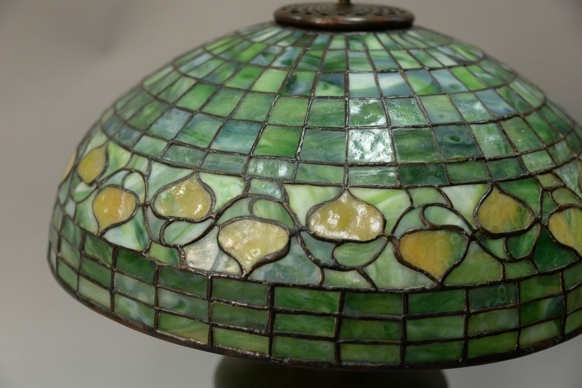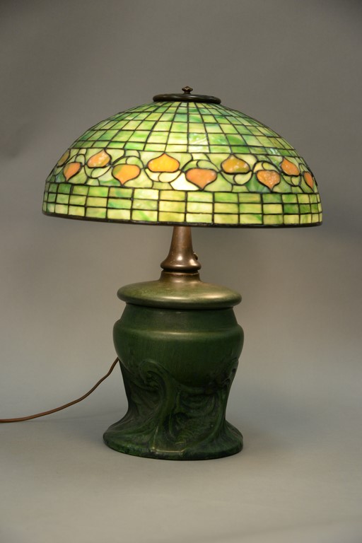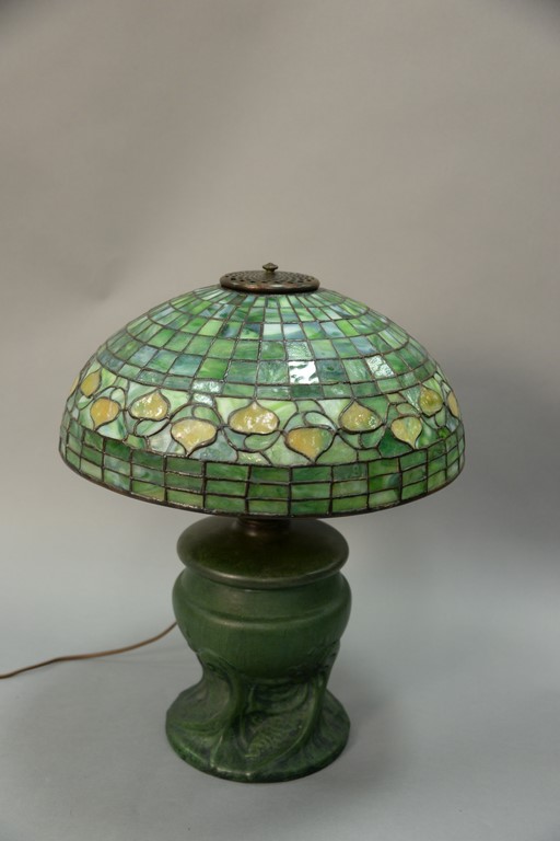 Lot 543A: Tiffany Studios Favrile table lamp with acorn pattern leaded glass shade having overall green with red acorns over Roseville Rozane…