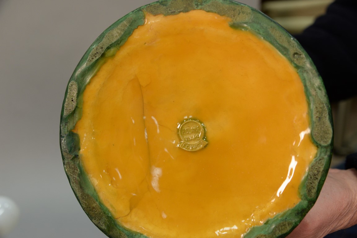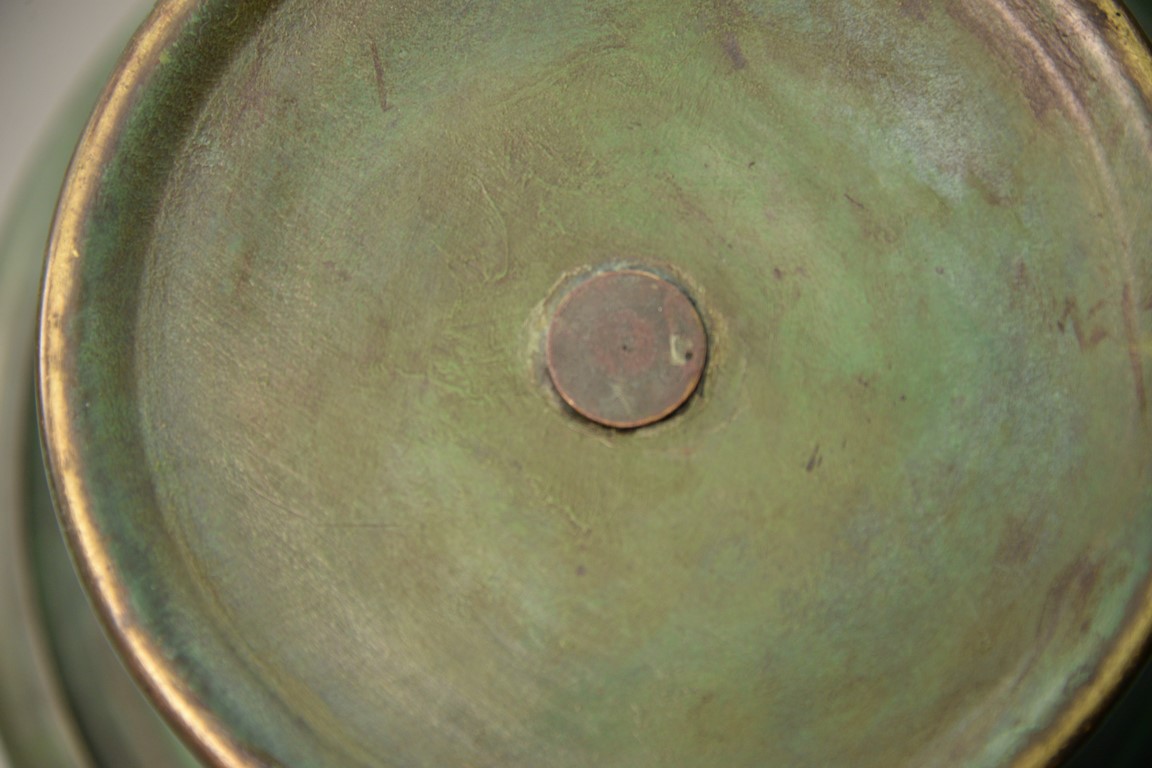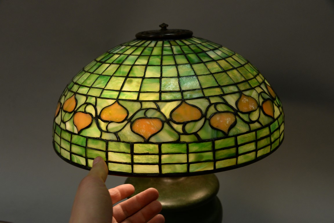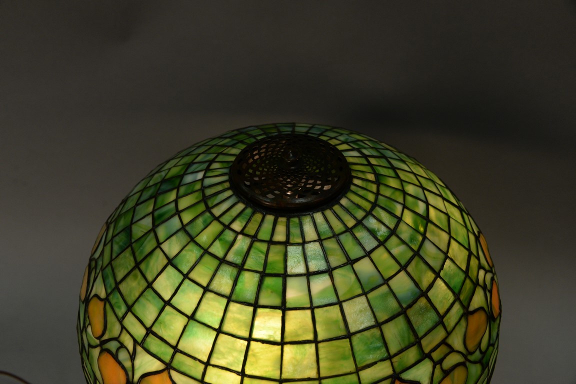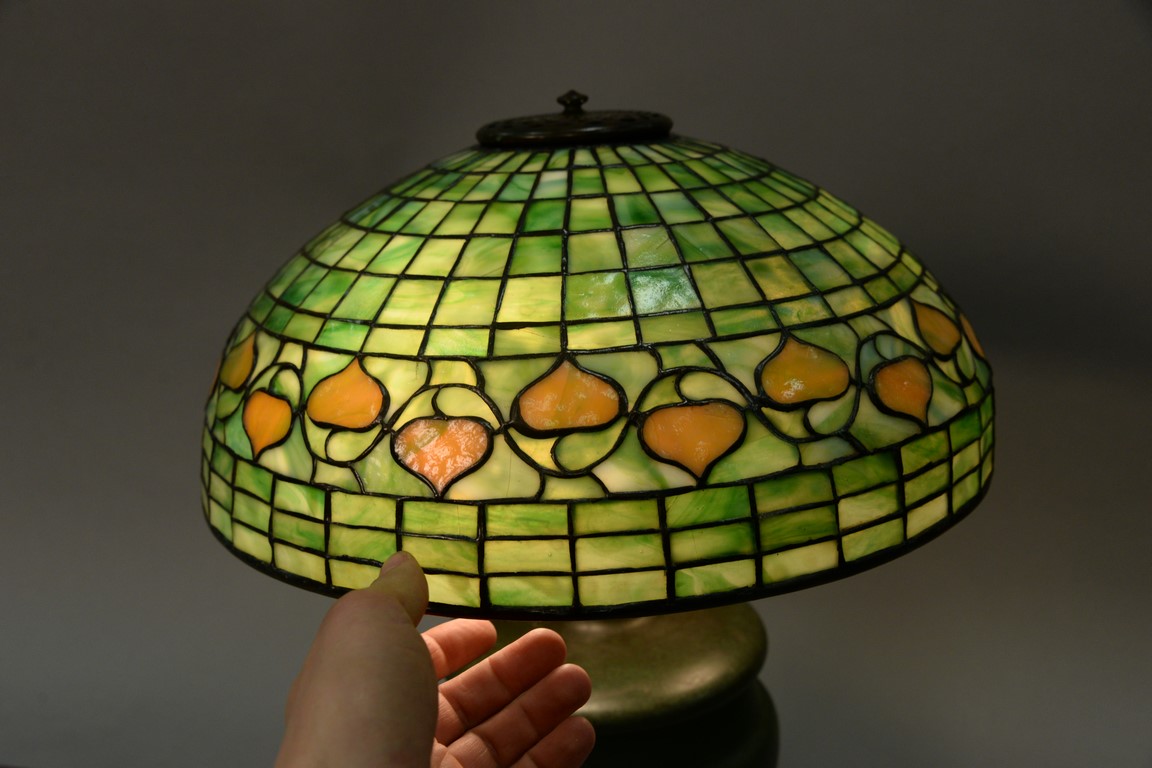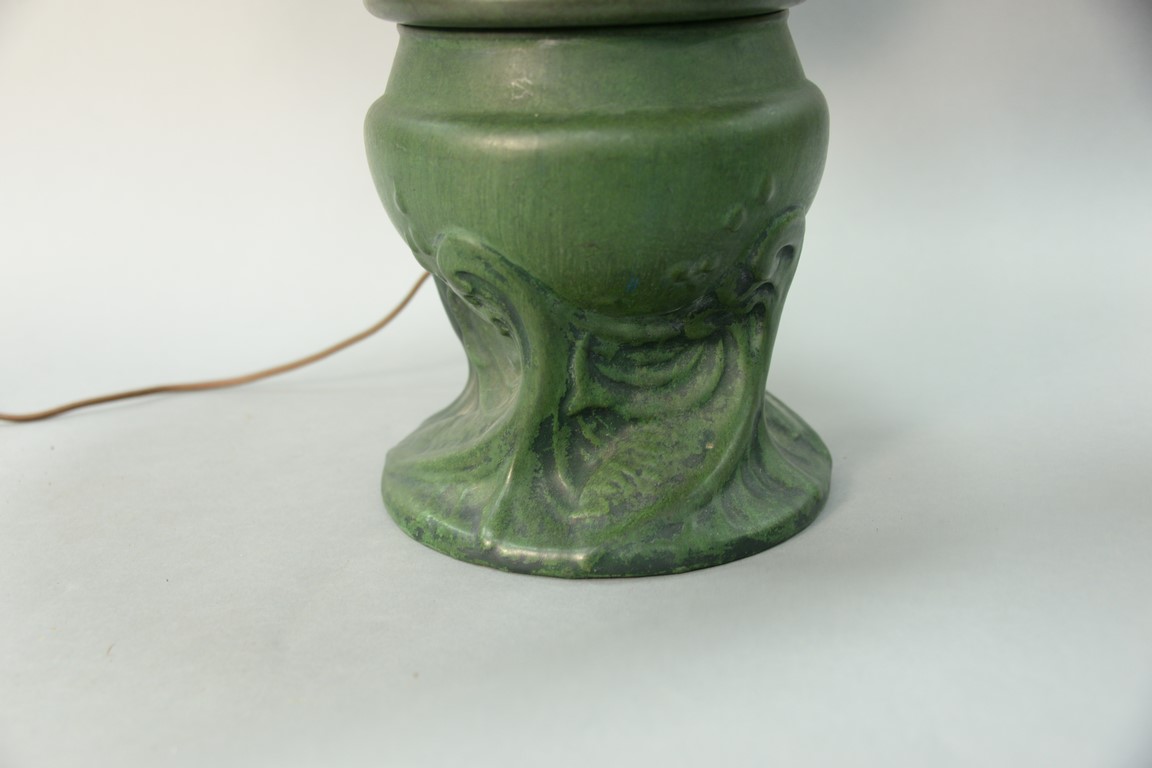Lot 543A: Tiffany Studios Favrile table lamp with acorn pattern leaded glass shade having overall green with red acorns over Roseville Rozane…