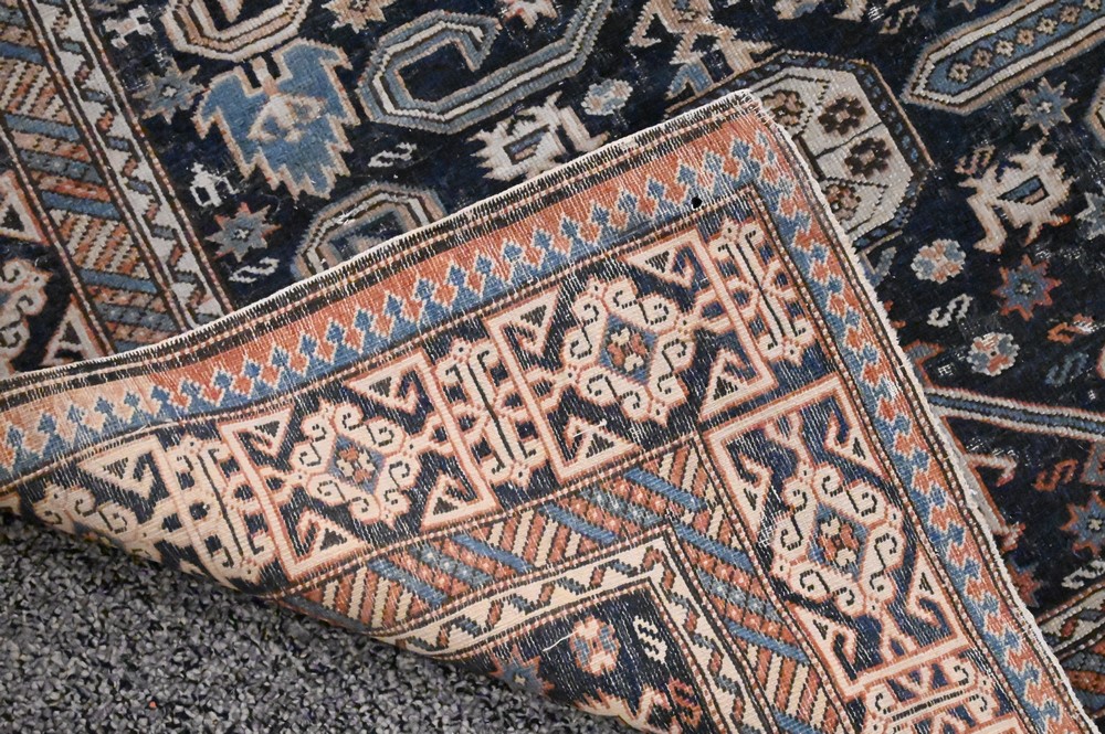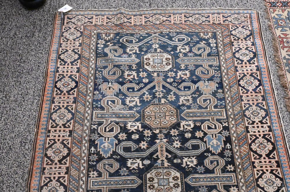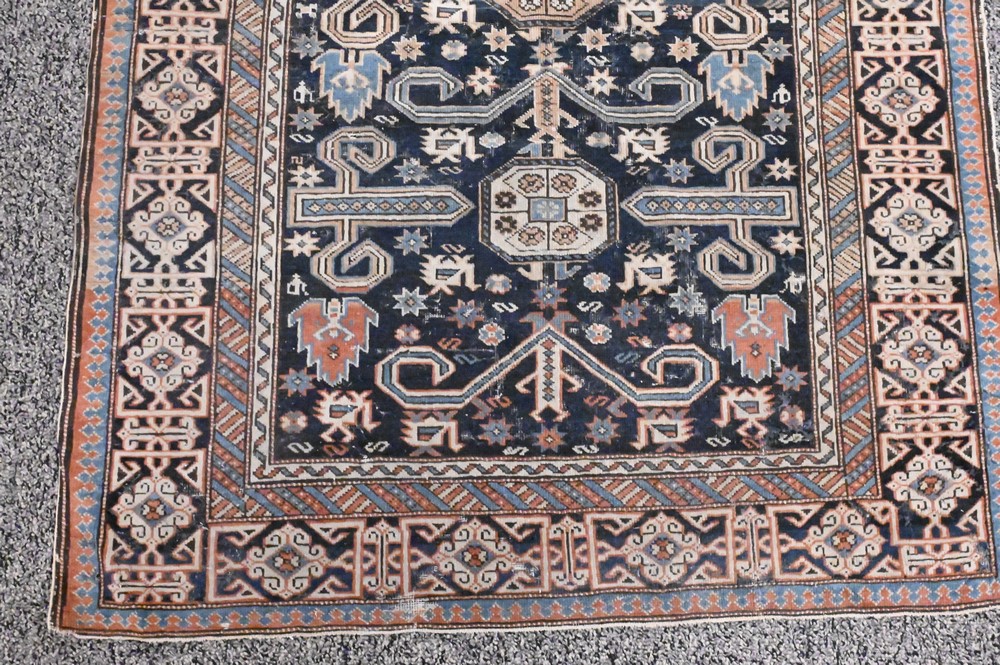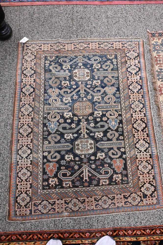 Lot 544: Caucasian Oriental Throw Rug, 3′ x 3′ 10″, (one small hole). Provenance: Estate of Wallace Bradway, New Haven, CT.