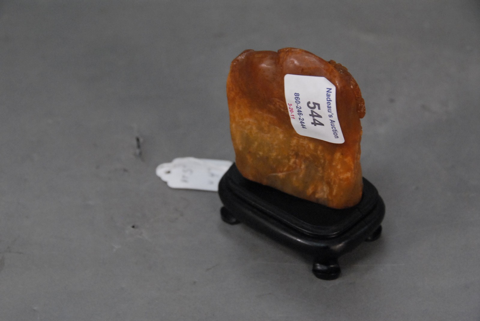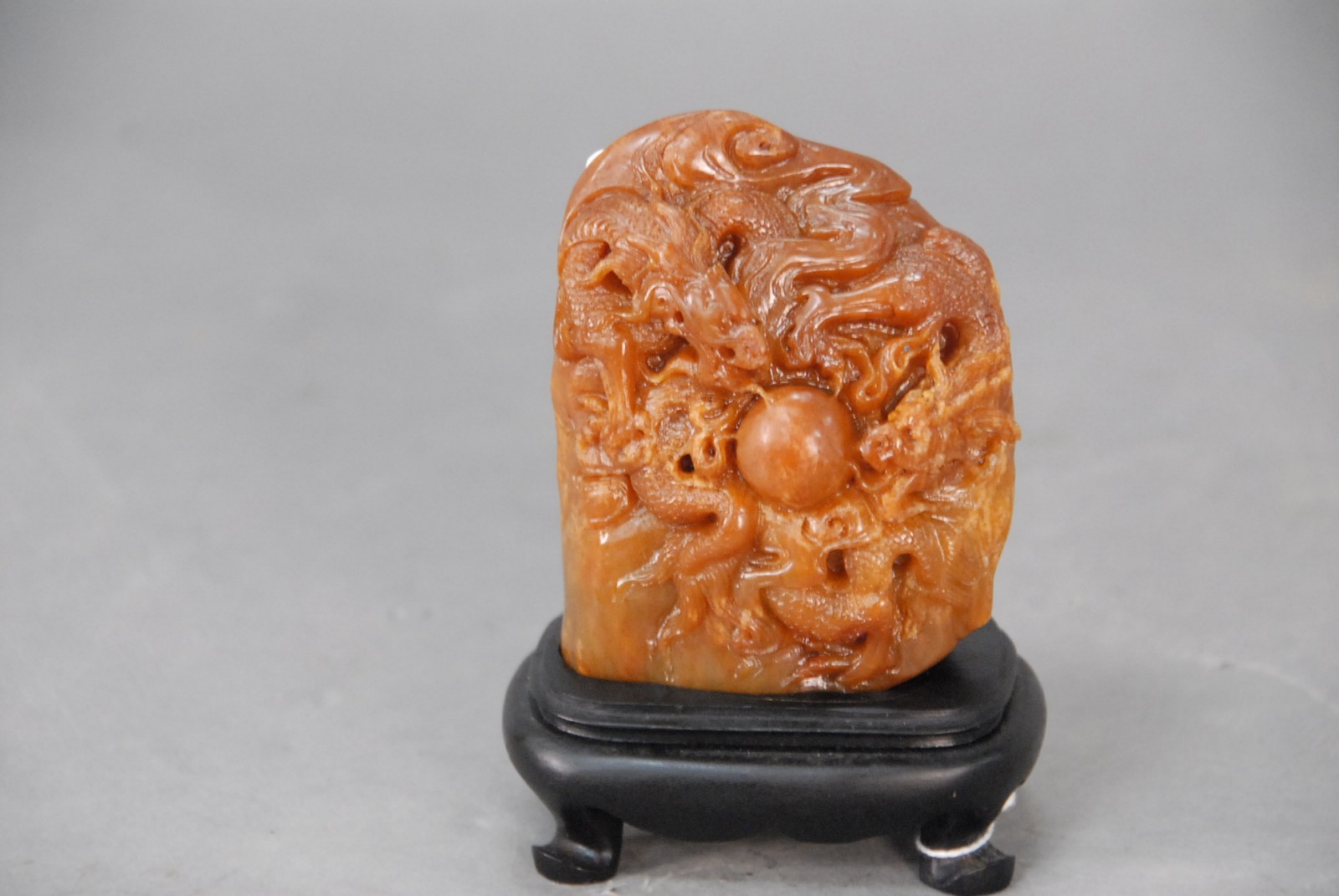 Chinese carved stone figure of a dragon and pearl, with fitted wood stand, 20th century.