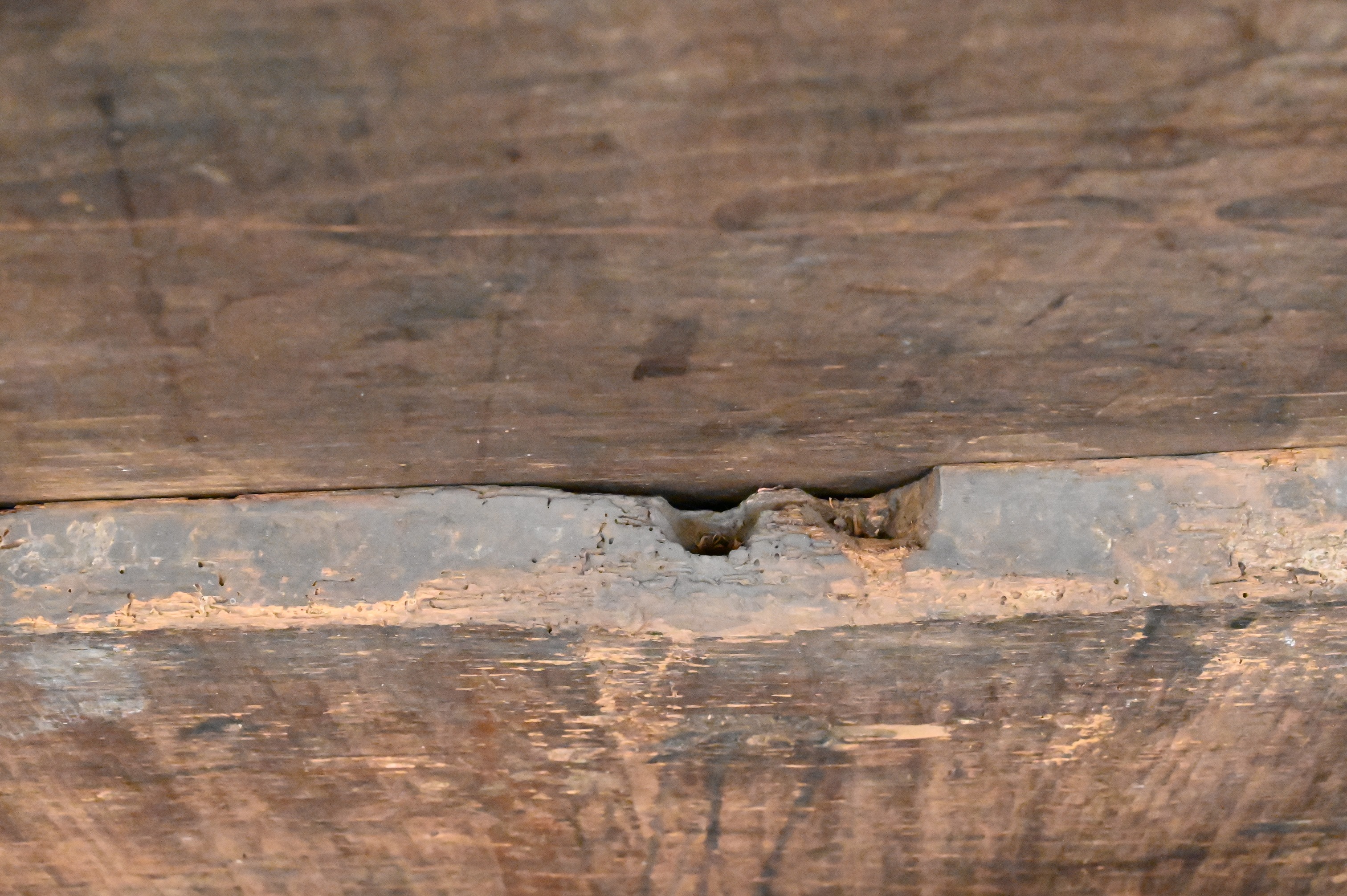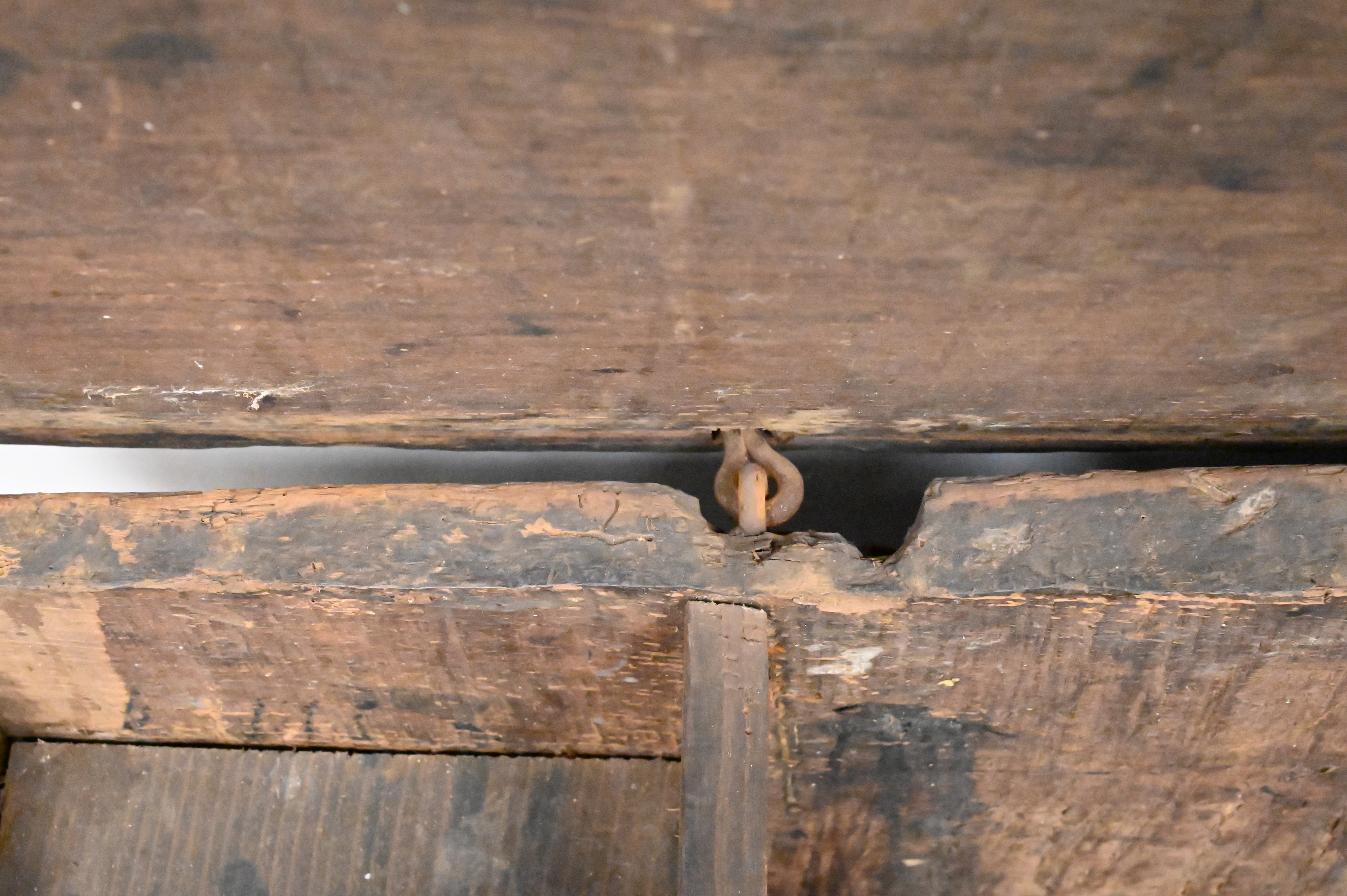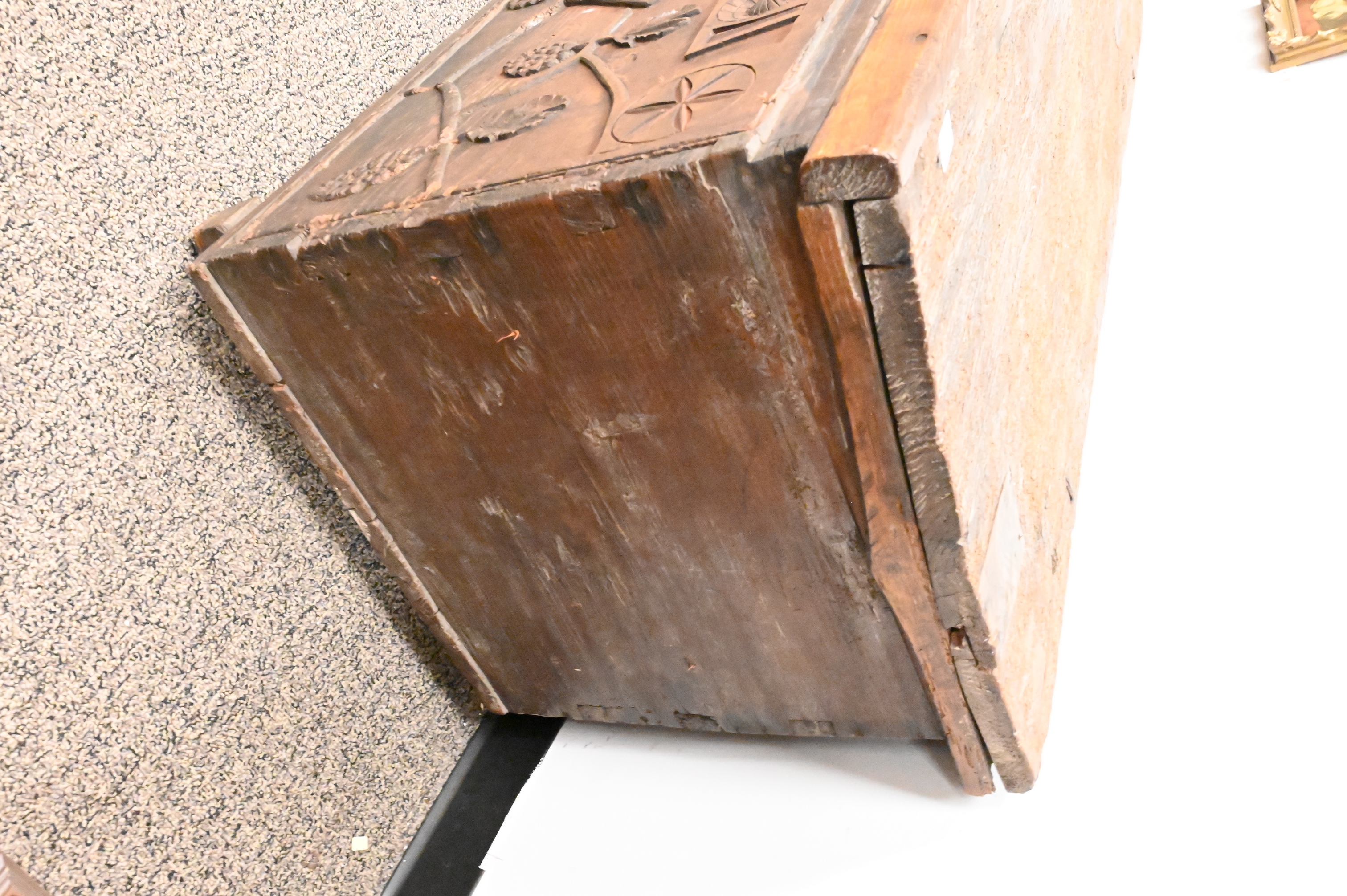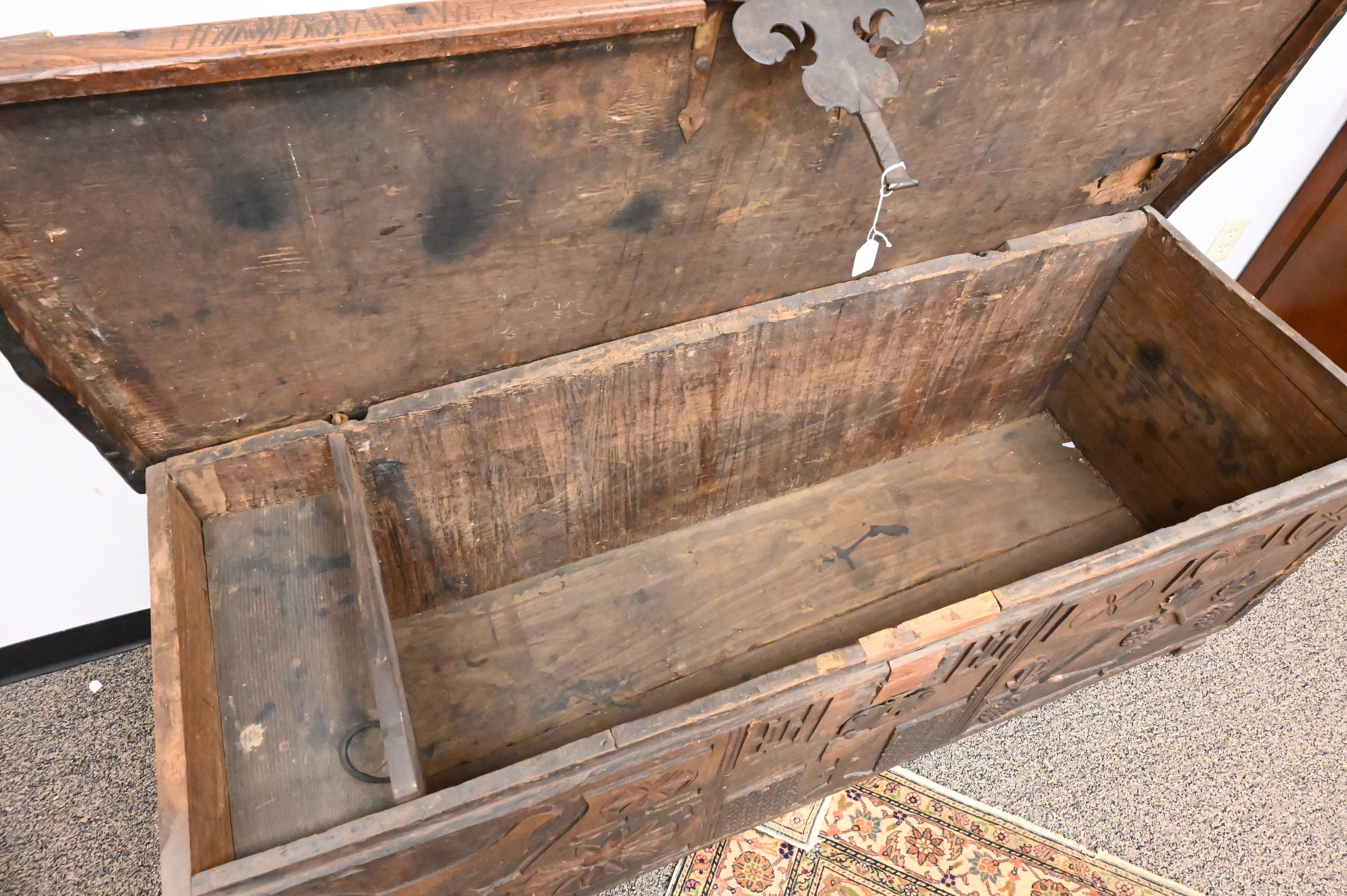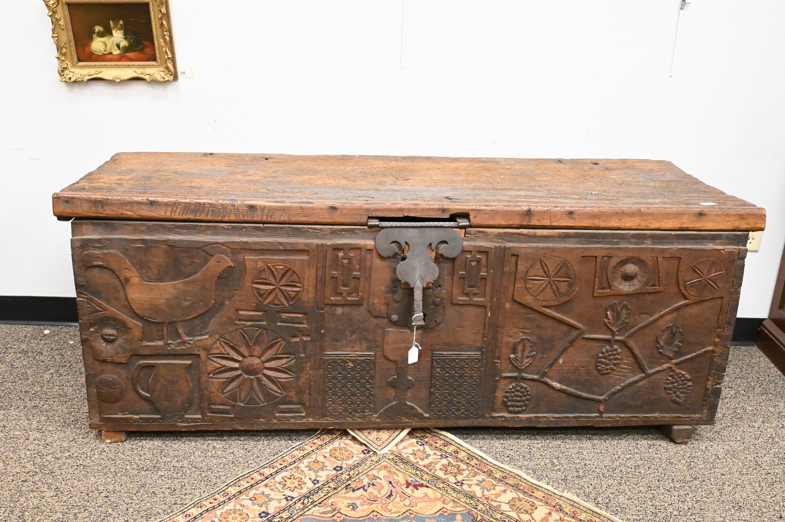 having snipe hinges and front carved with rooster, pinwheels chalice, sun flower, fruit, cross thatching, and pitcher; all raised on plain supports, lock area restored, 17th century or earlier