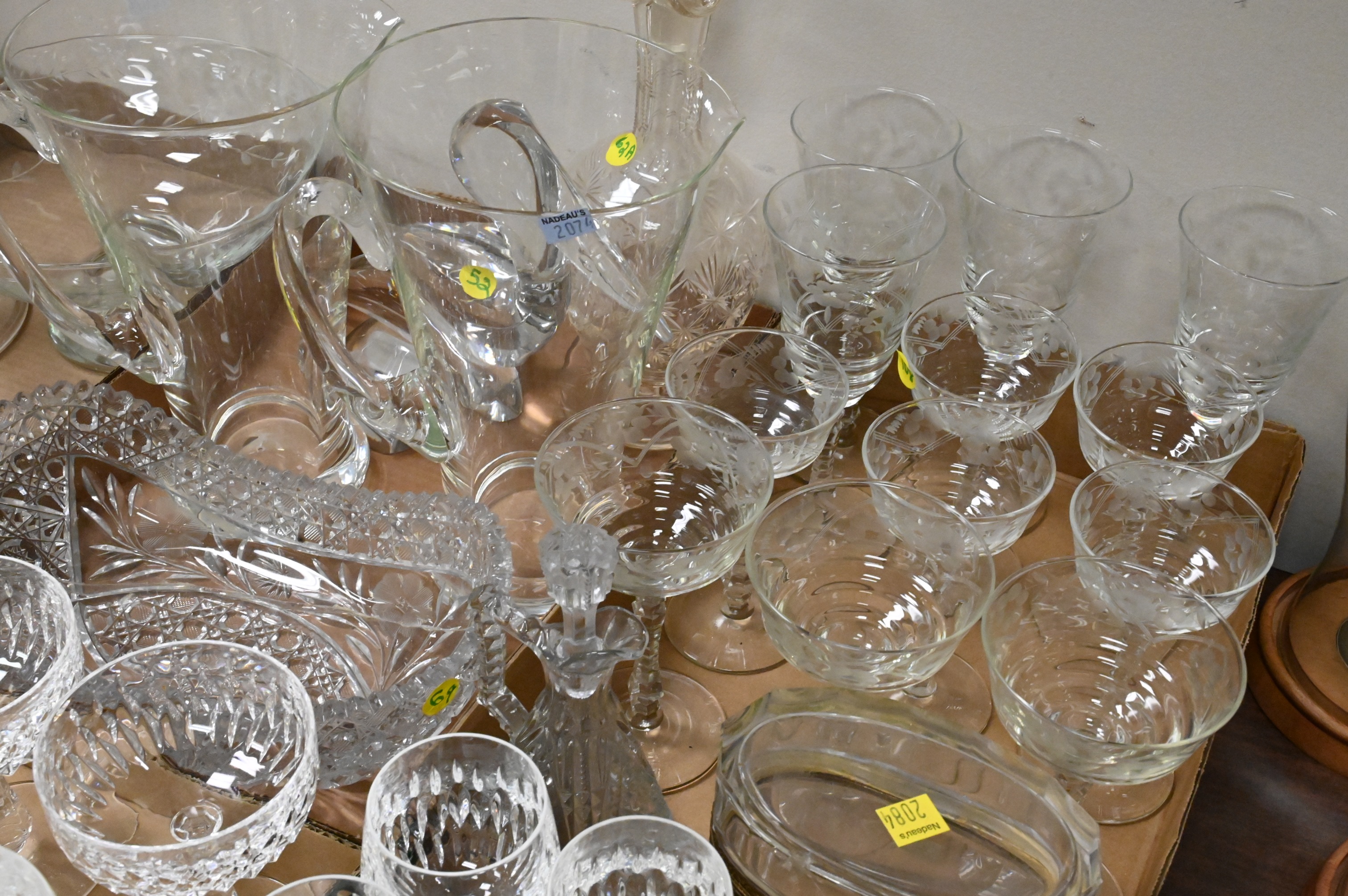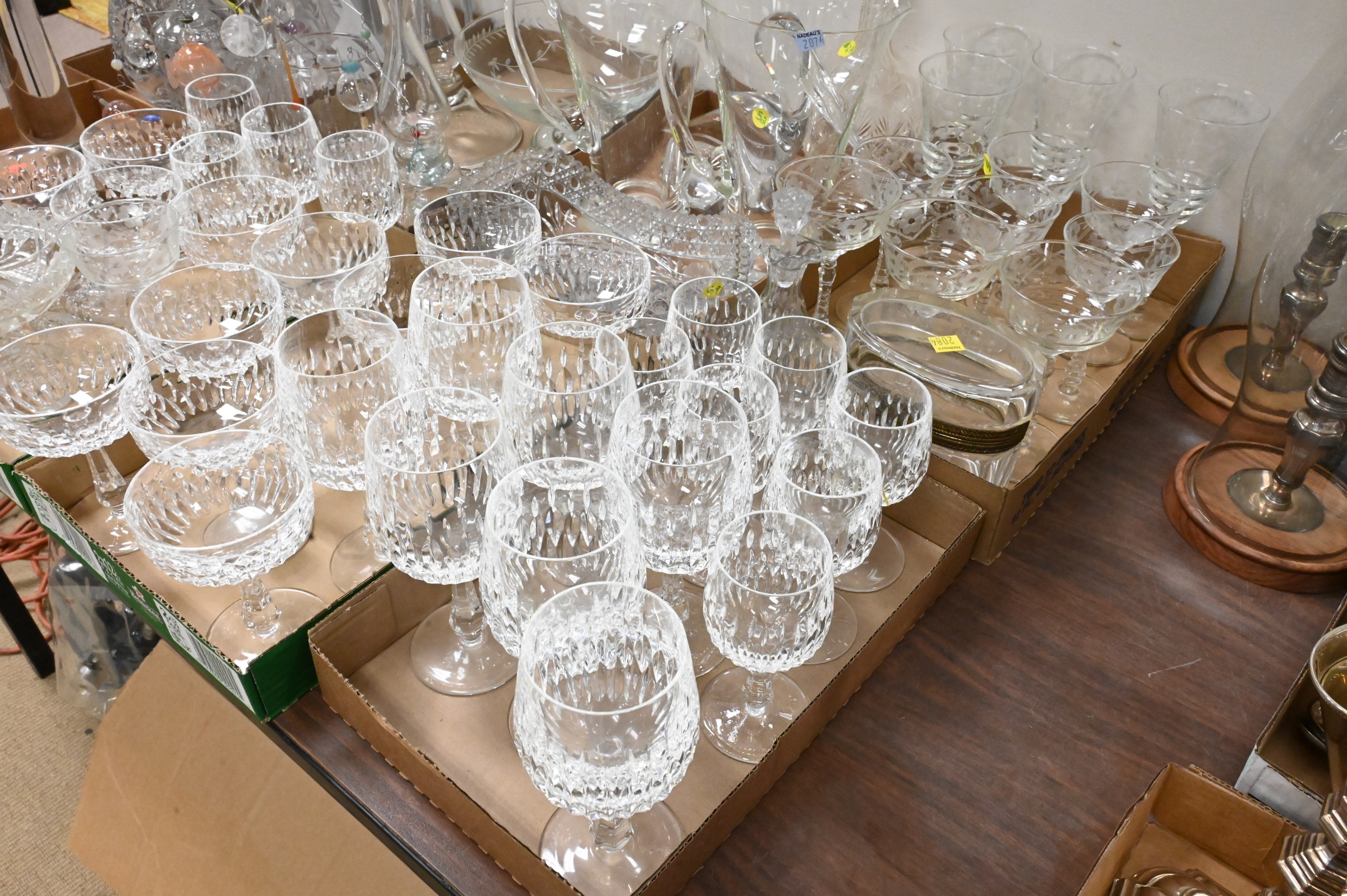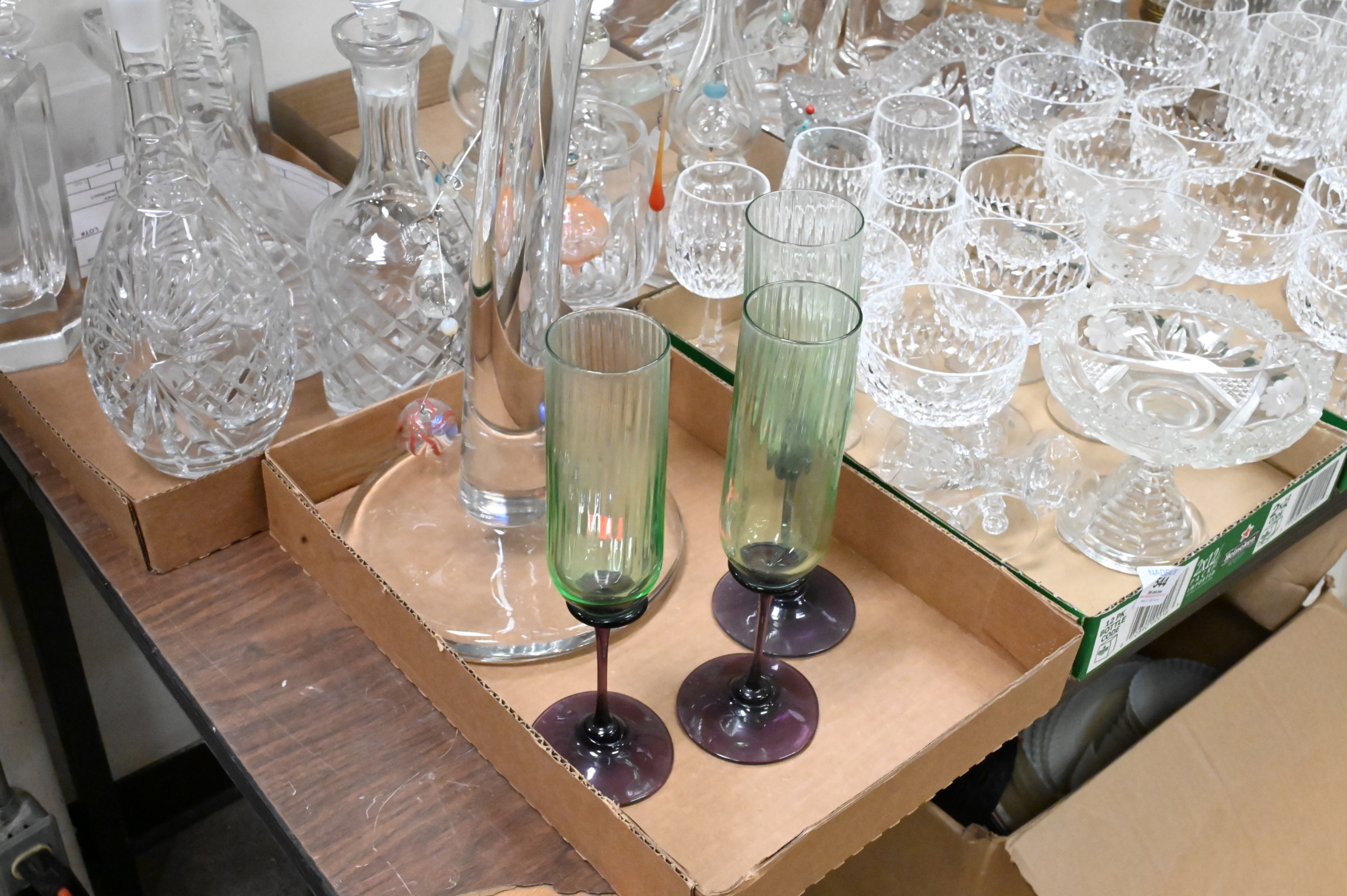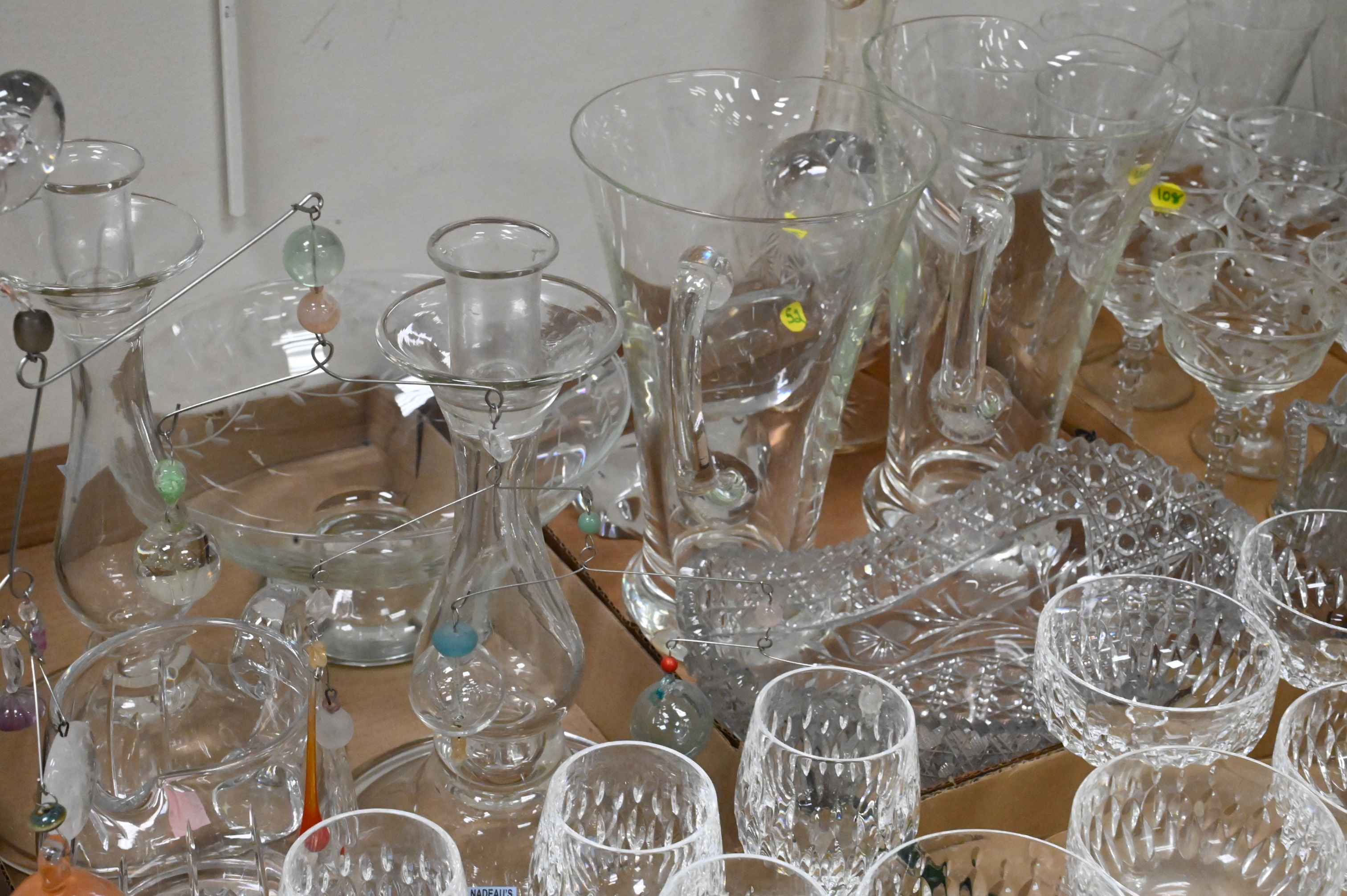 Eight Box Lots of Glass, to include two sets of stemware, candle stick holders; pitchers; Baccarat decanters; mobile; decorative, etc.