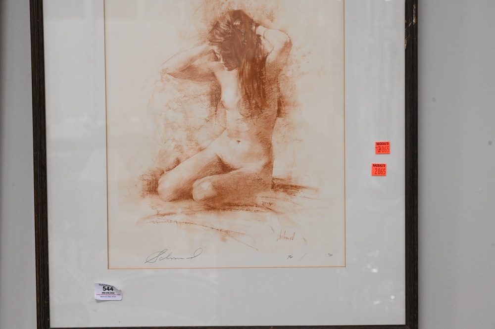 Group of Four Framed Pieces, to include Raoul Dupoux (1906 – 1988), nude woman, watercolor, 22″ x 17″; watercolor of nude woman, signed illegibly; Richard Schmid nude print; along with AA Ogden, watercolor of a woman.