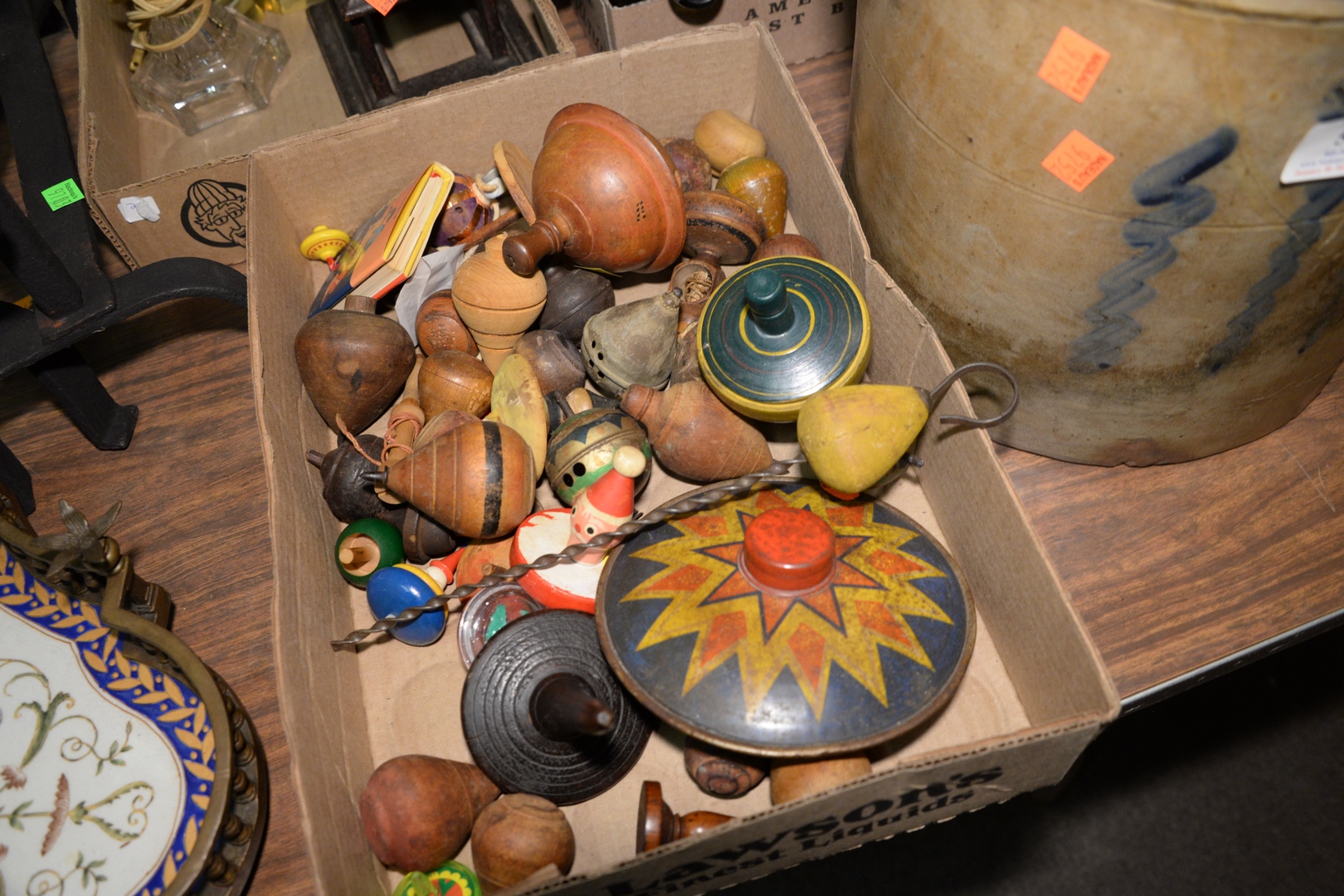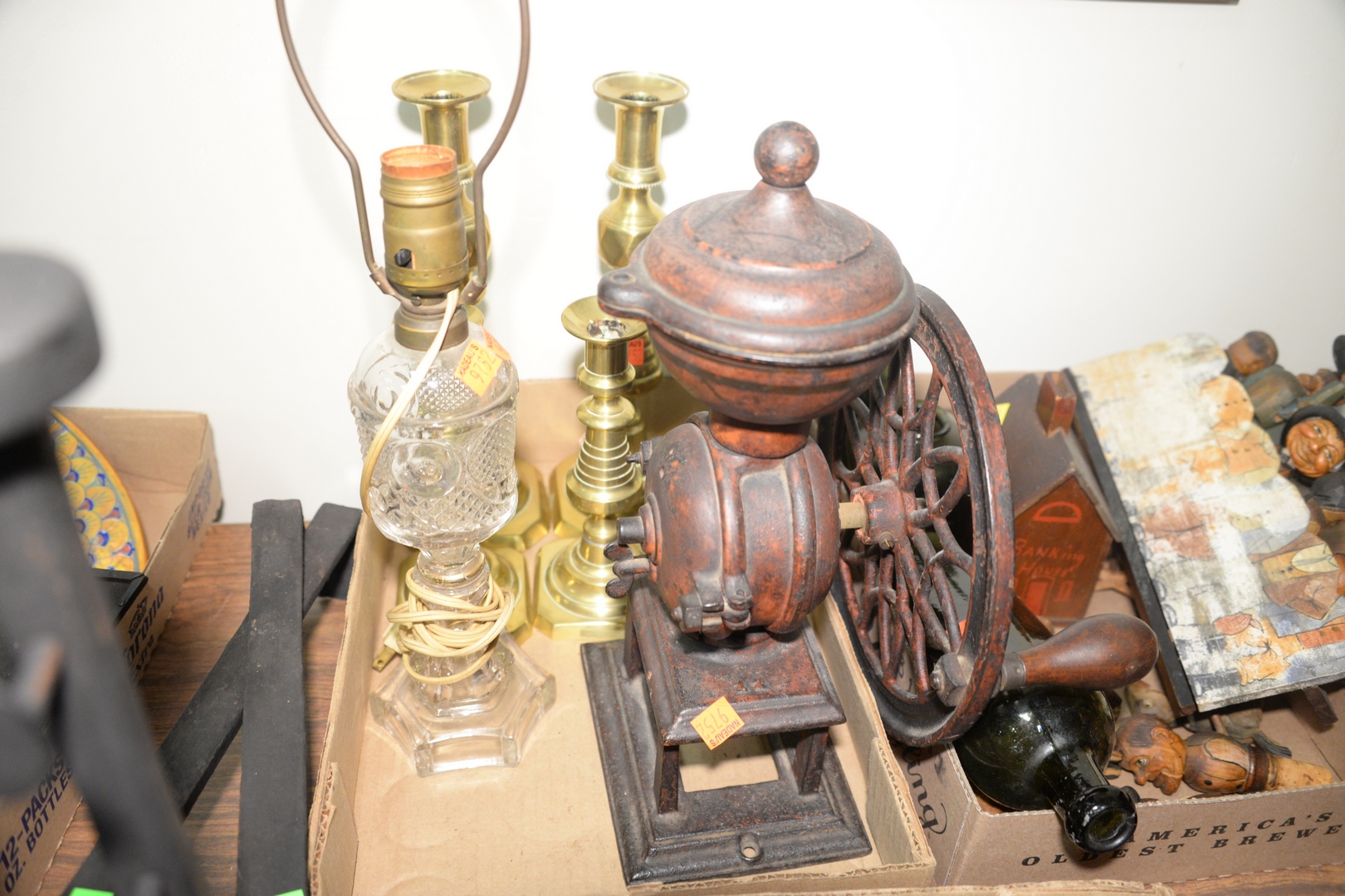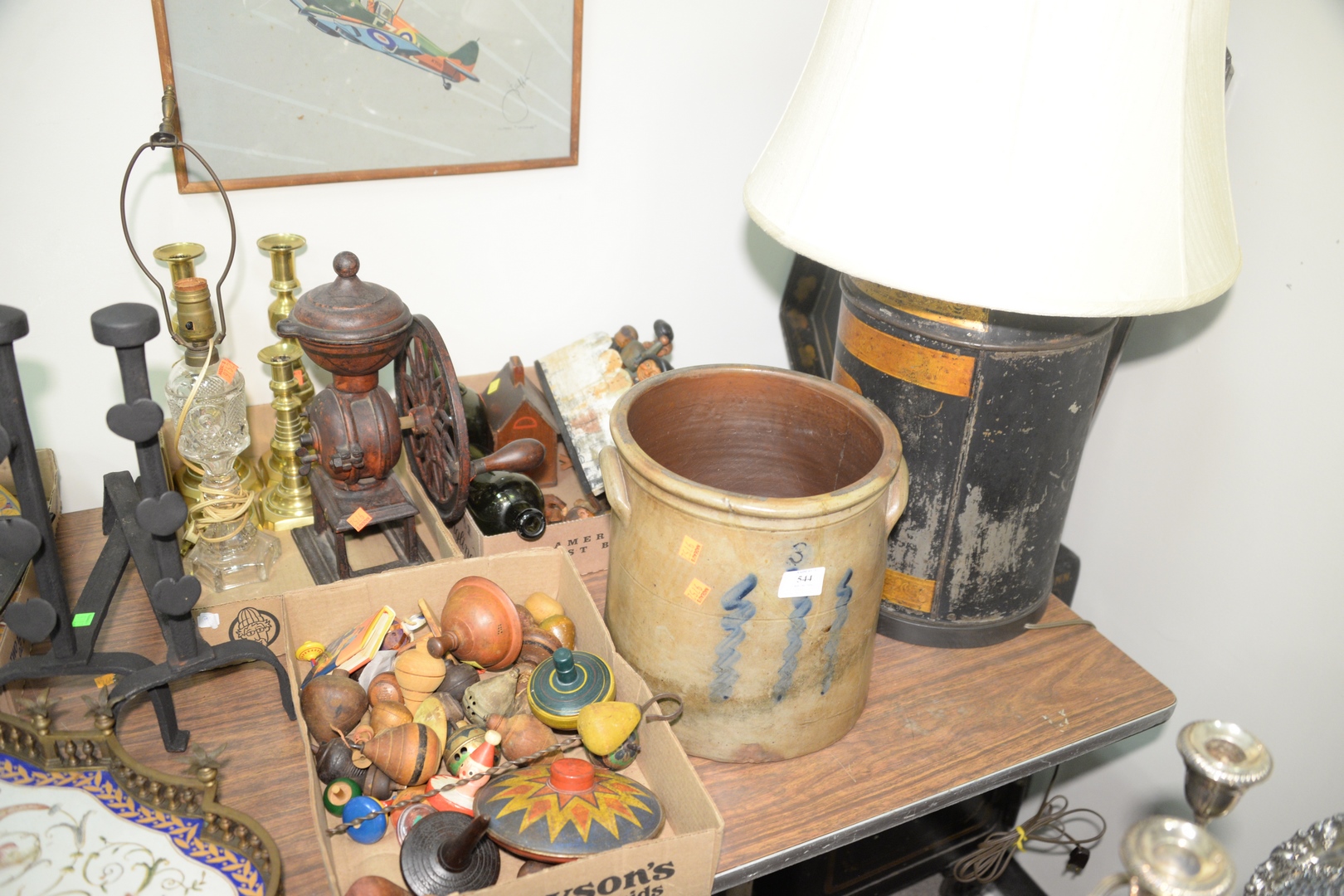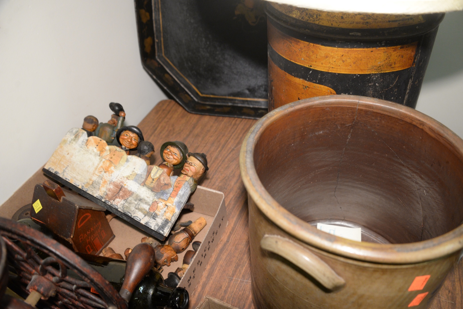 to include figural wood carved corks wooden tops iron coffee grinder tole tray brass candlesticks oil lamp glass bottles stoneware crock painted blue as is