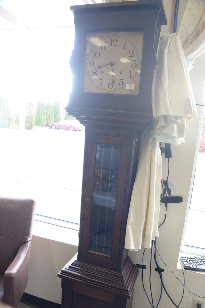 Lot 544: Mahogany Tall Case Clock with weights and pendulum.