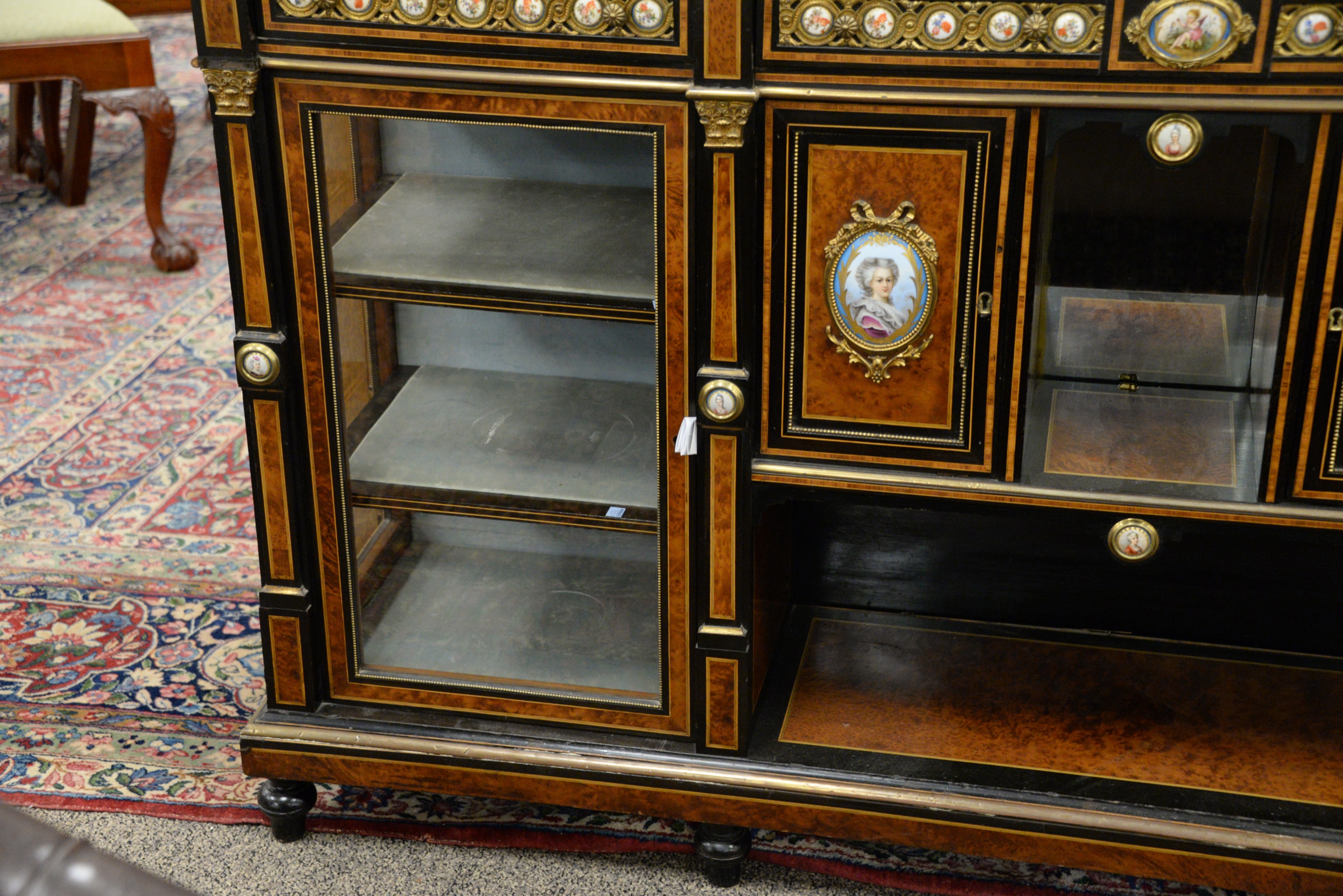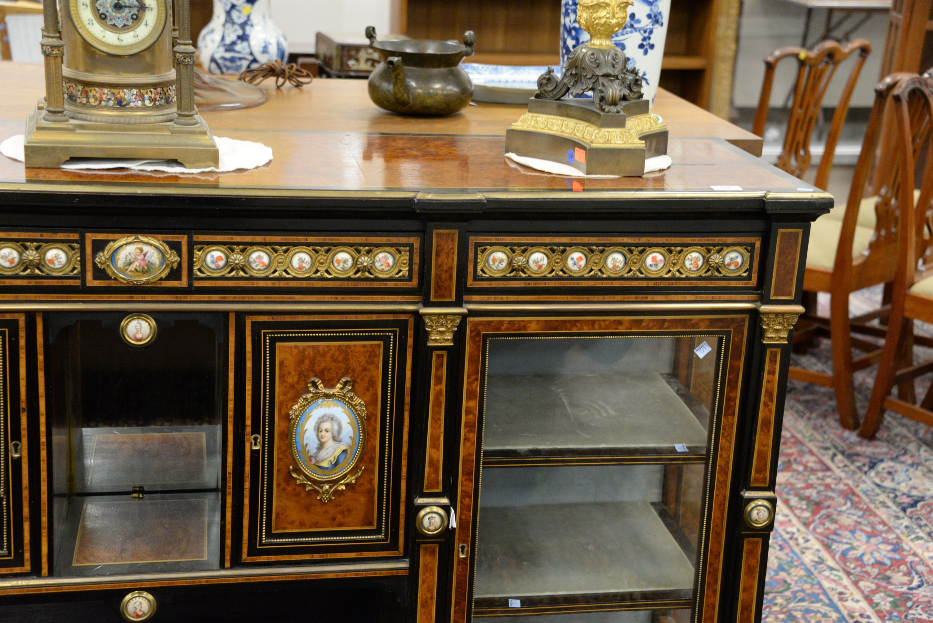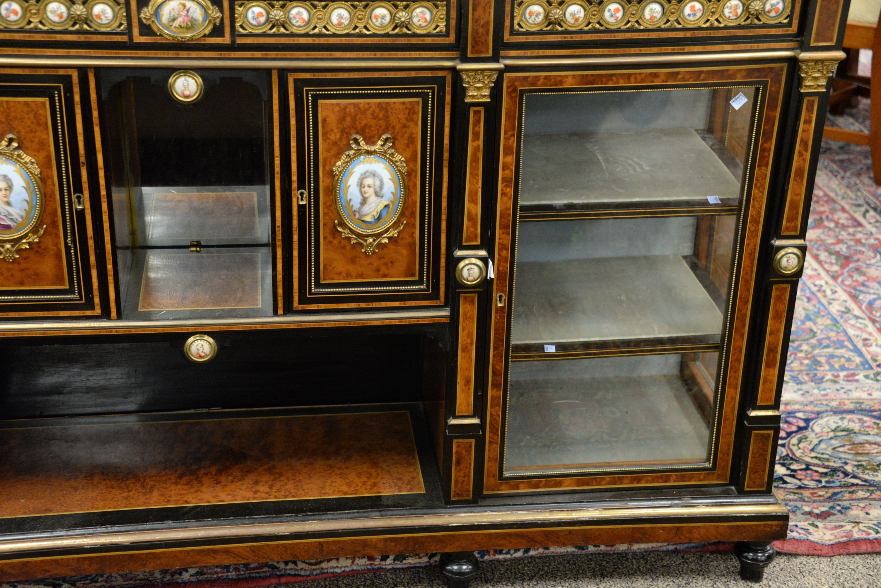 Napoleon III Sideboard/Cabinet, the whole having burlwood and ebonized surrounds with gilt metal mounted porcelain panels, including oval hand painted panels of Marie Antoinette and Marie Elisabeth on each side of curio cabinets, all set on turned legs, top with two cracks, height 40 3/4 inches, length 71 inches, width 17 inches, top 17″x71″.