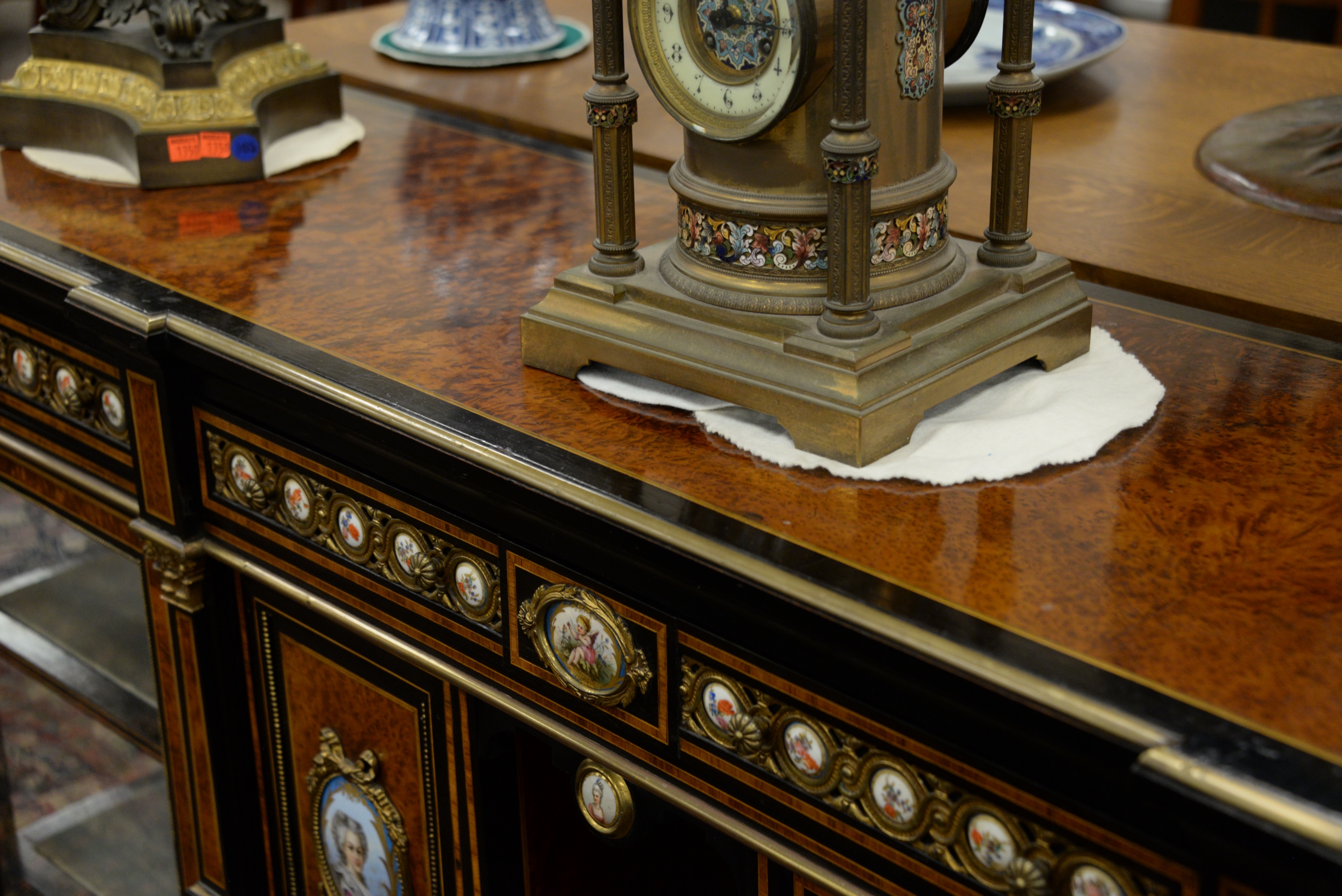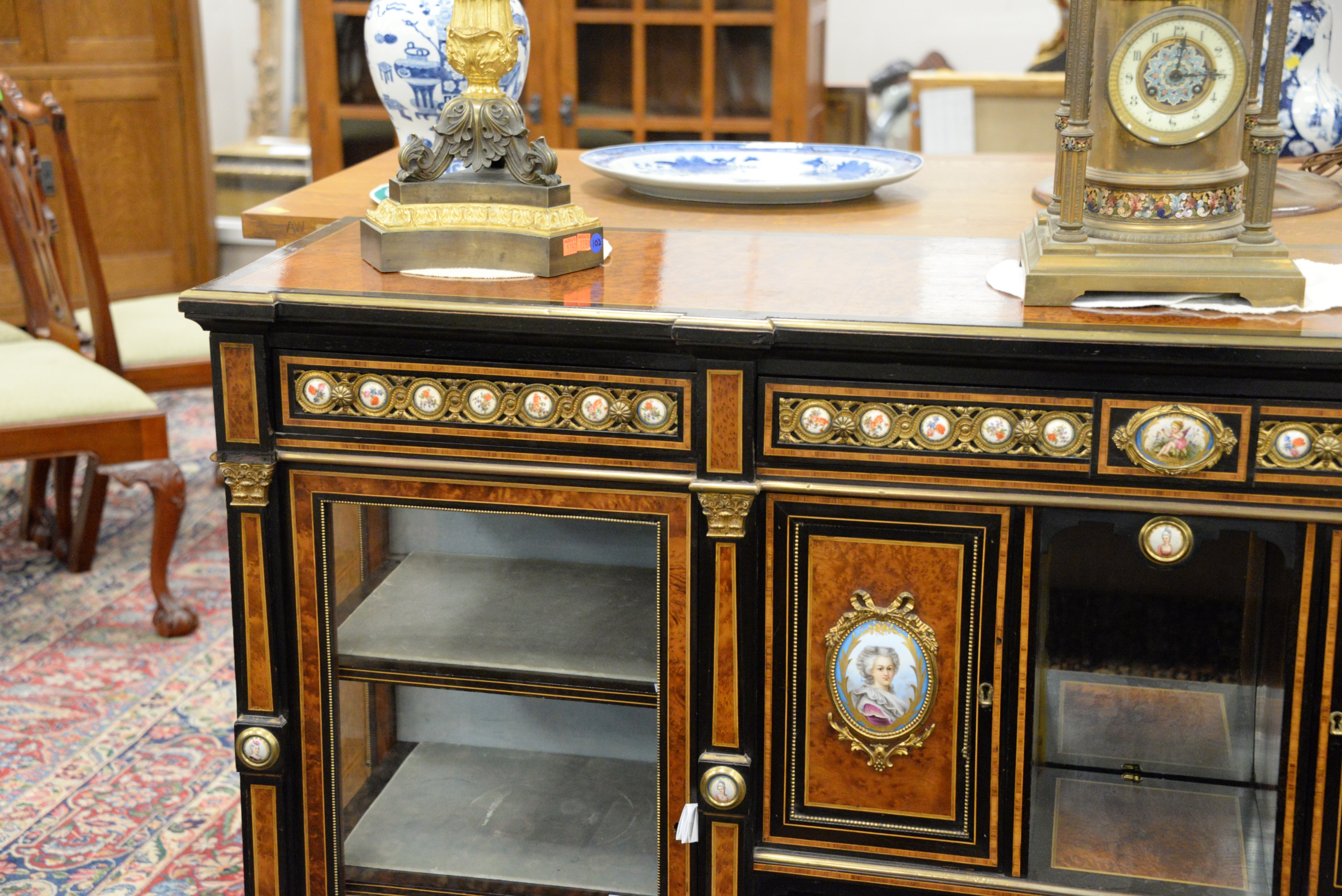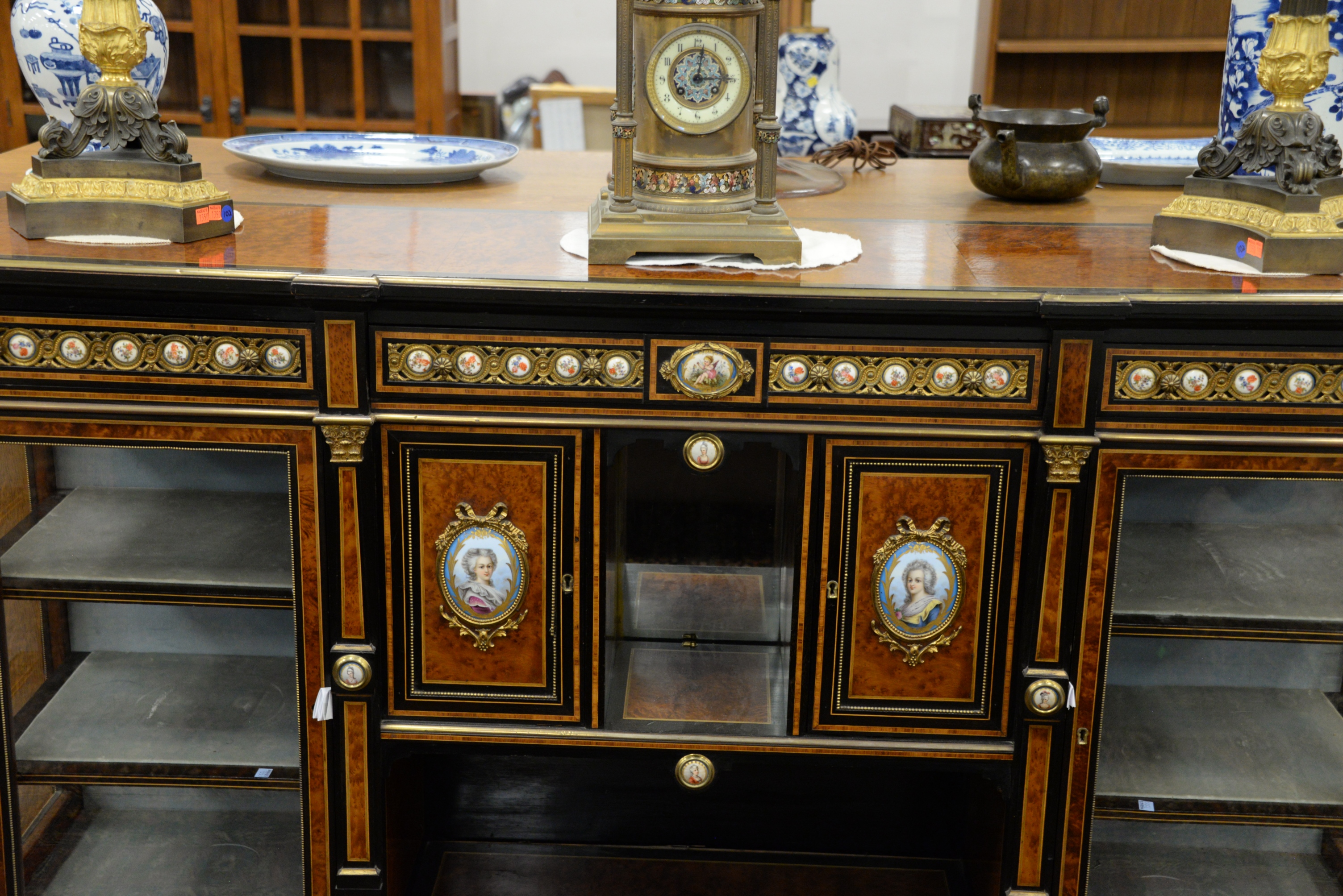 Napoleon III Sideboard/Cabinet, the whole having burlwood and ebonized surrounds with gilt metal mounted porcelain panels, including oval hand painted panels of Marie Antoinette and Marie Elisabeth on each side of curio cabinets, all set on turned legs, top with two cracks, height 40 3/4 inches, length 71 inches, width 17 inches, top 17″x71″.