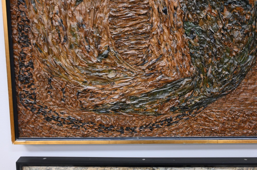 Lot 544: Two Maria Martel, Abstract #79 and unmarked, mixed media rolled paper collage, El Punto stamp, both signed, 48″ x 24″ and 18″ x 24″.