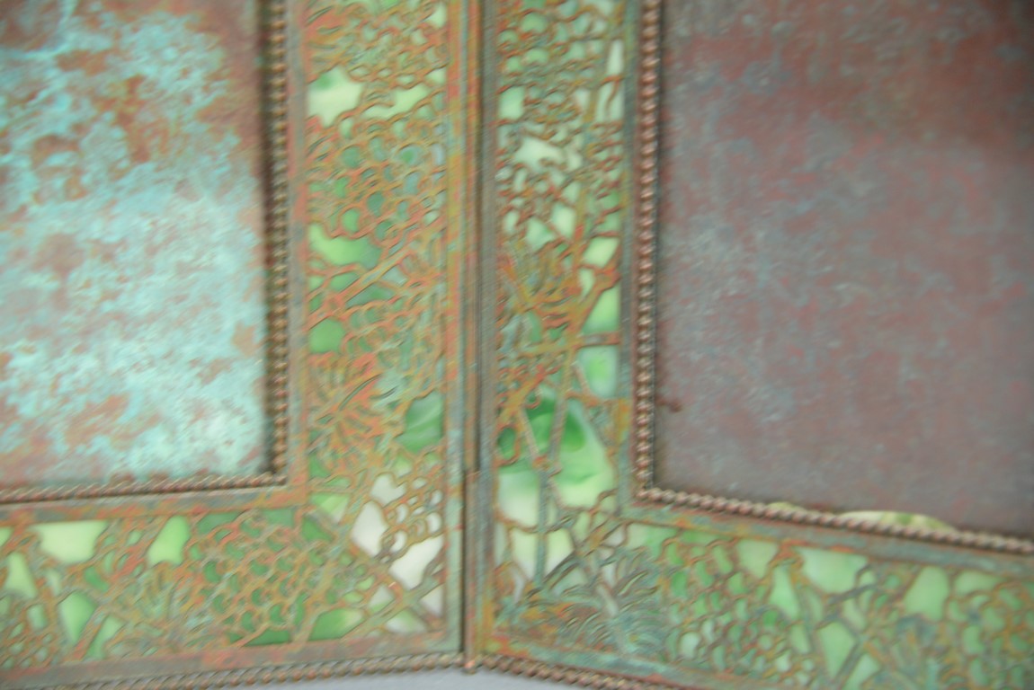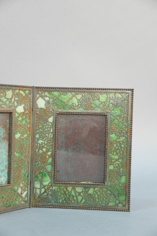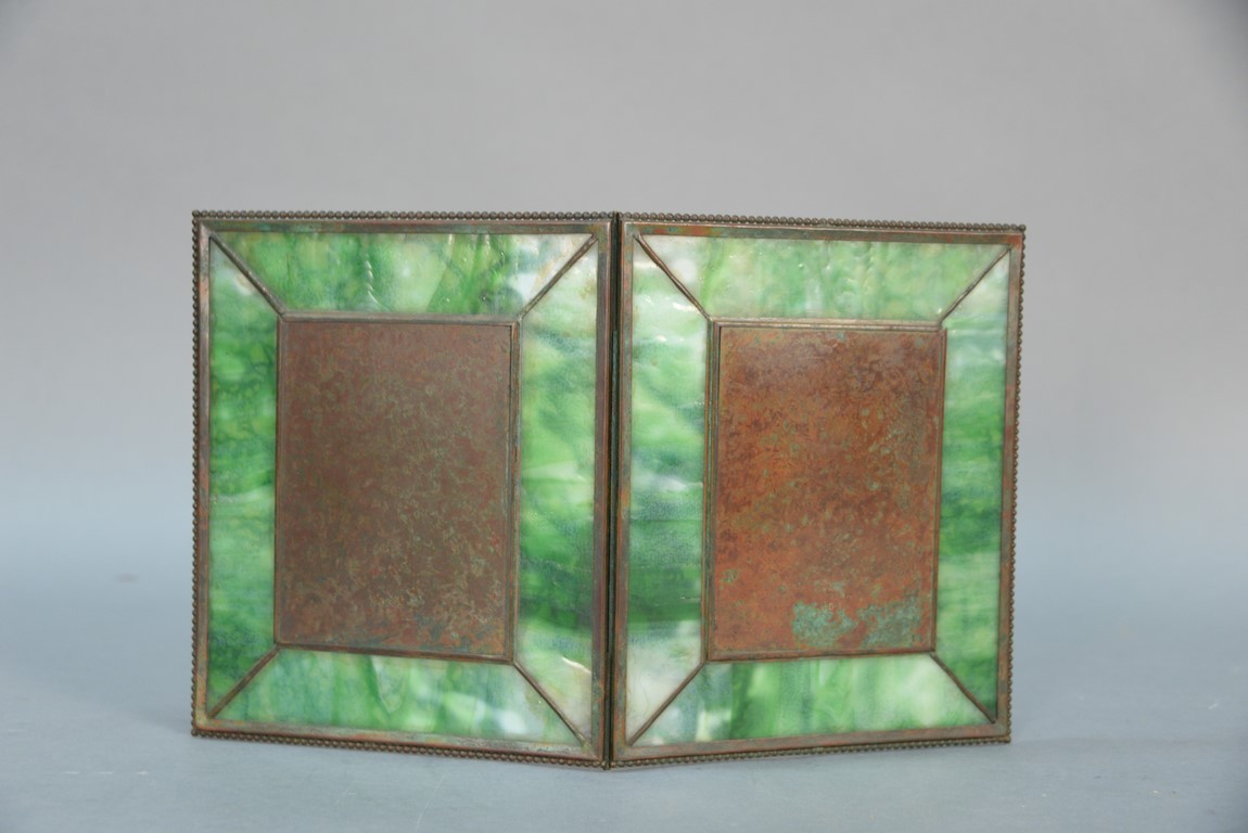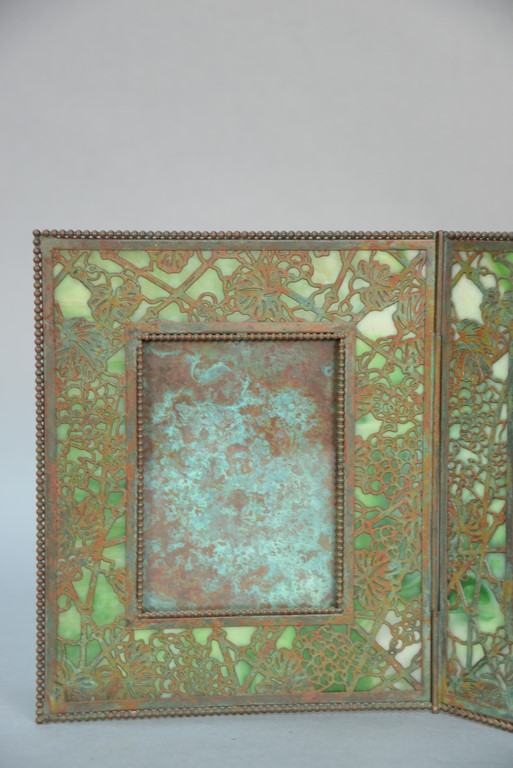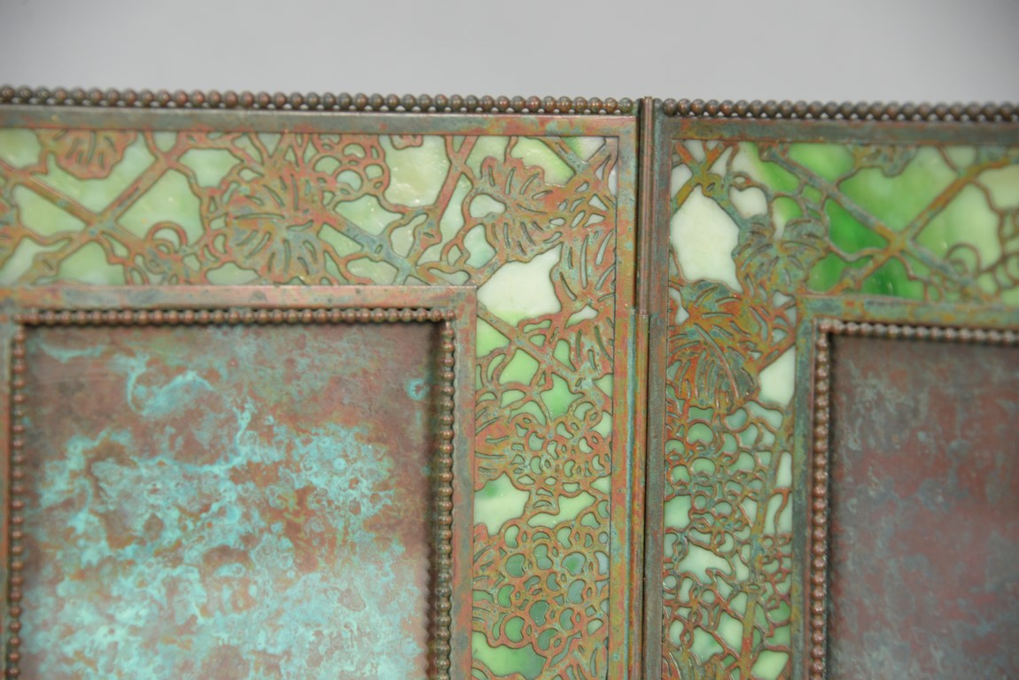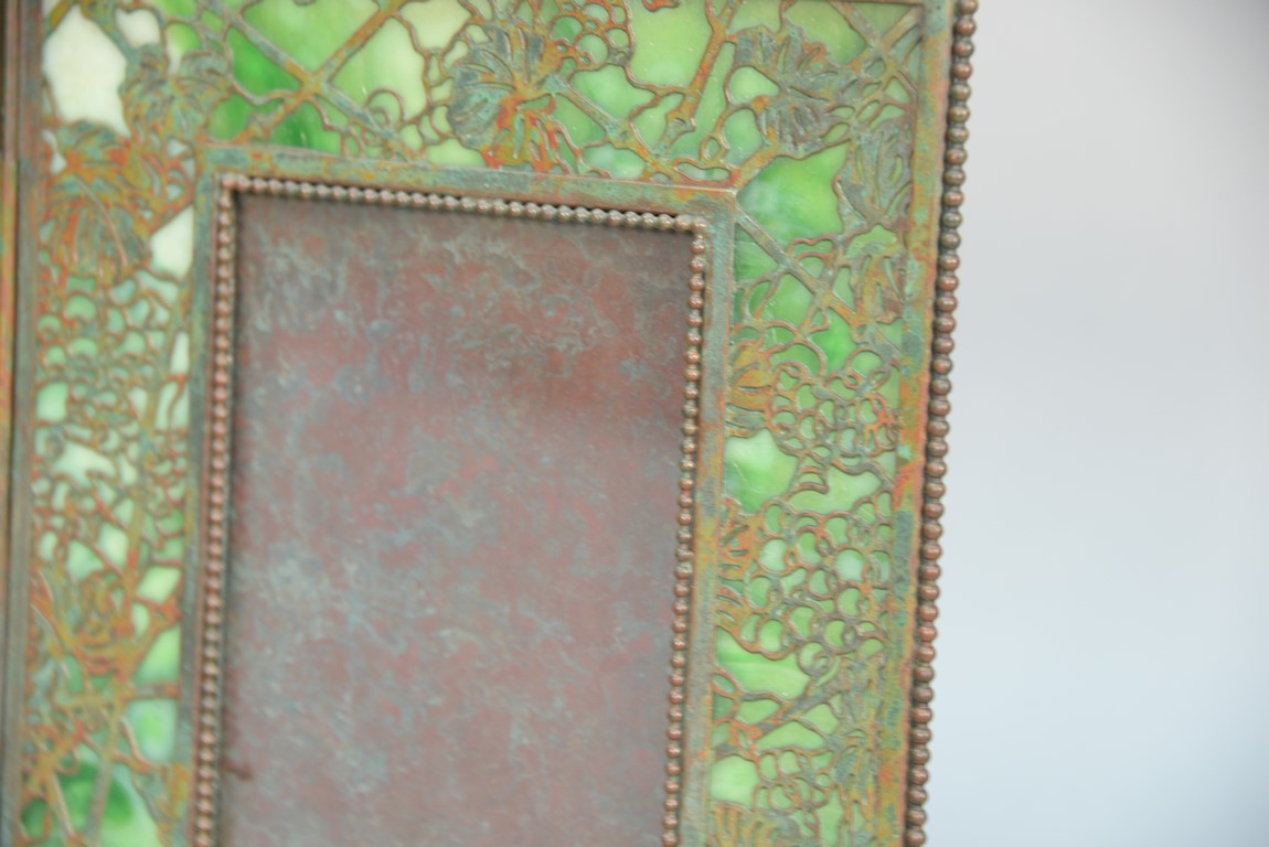 Lot 544A: Tiffany Studios Grapevine double picture frame having bronze etched grapevine pattern Tiffany green slag glass backging, each frame…