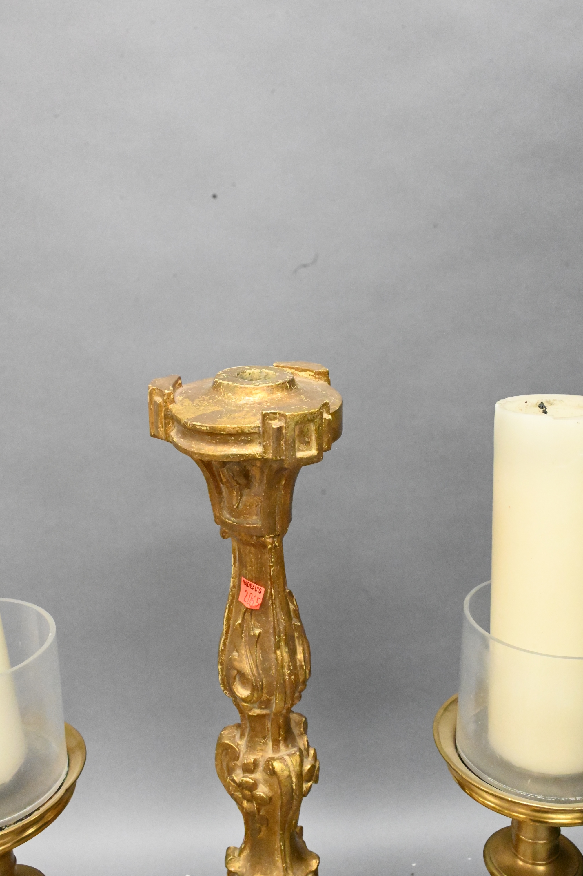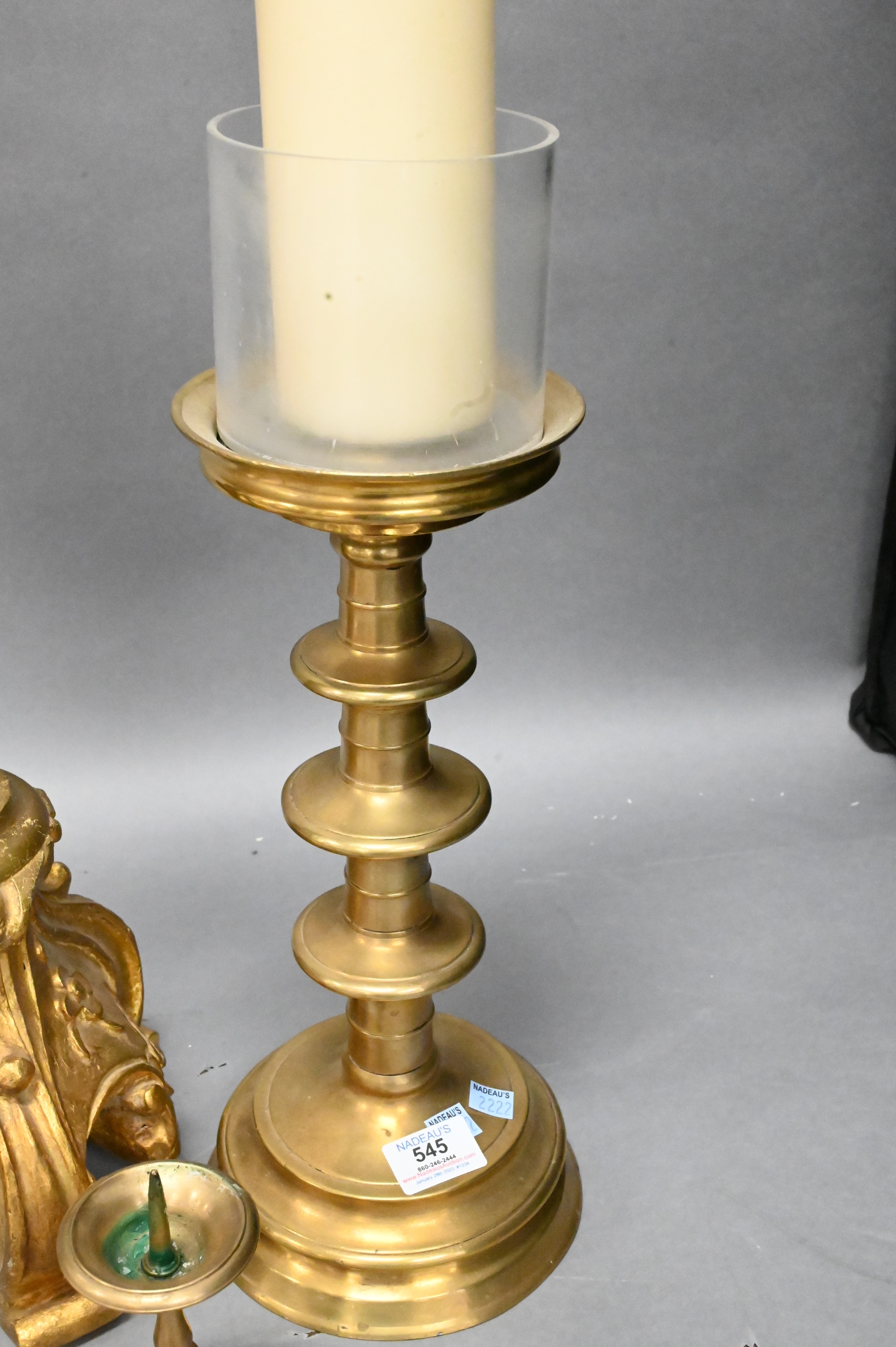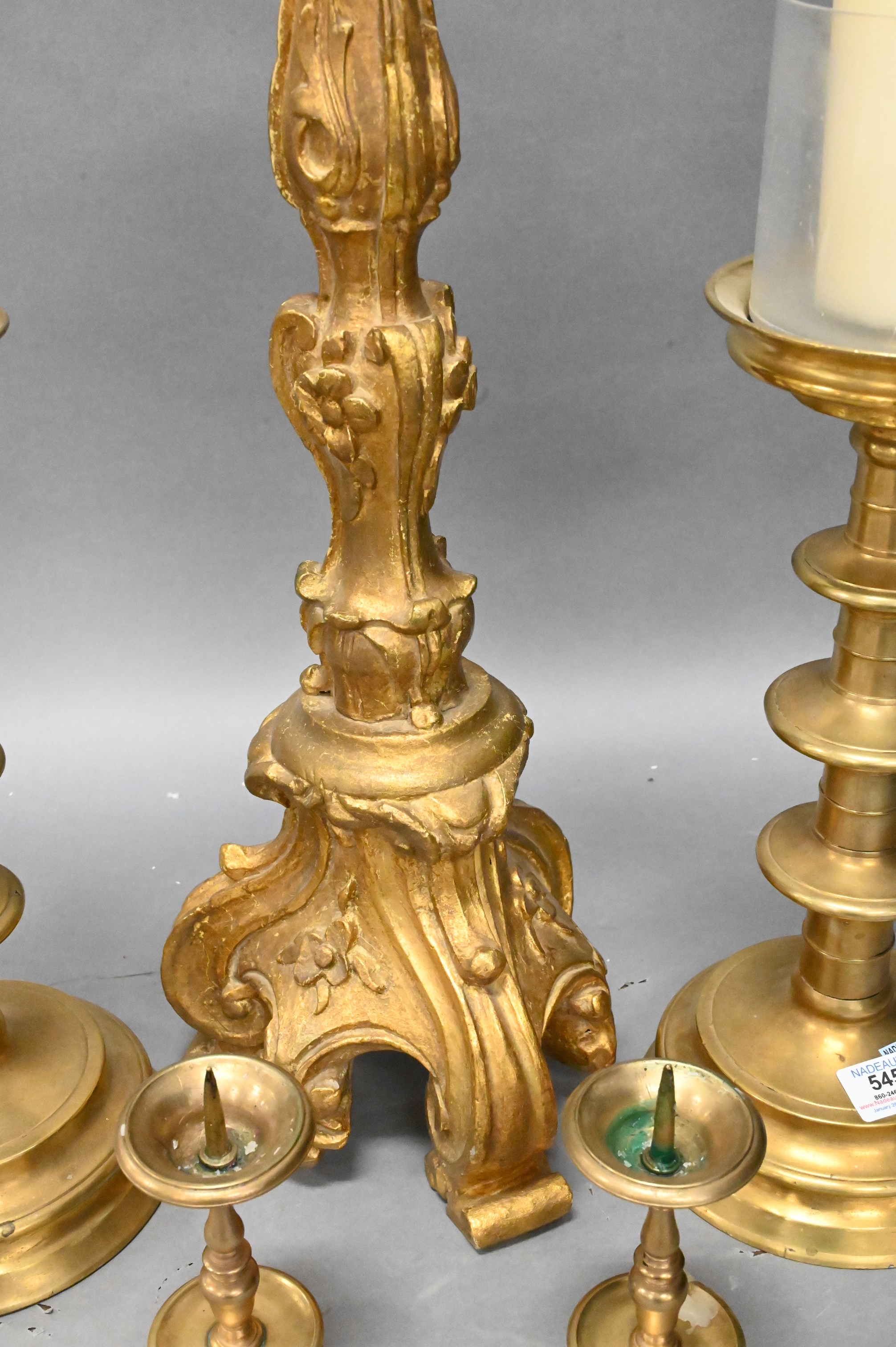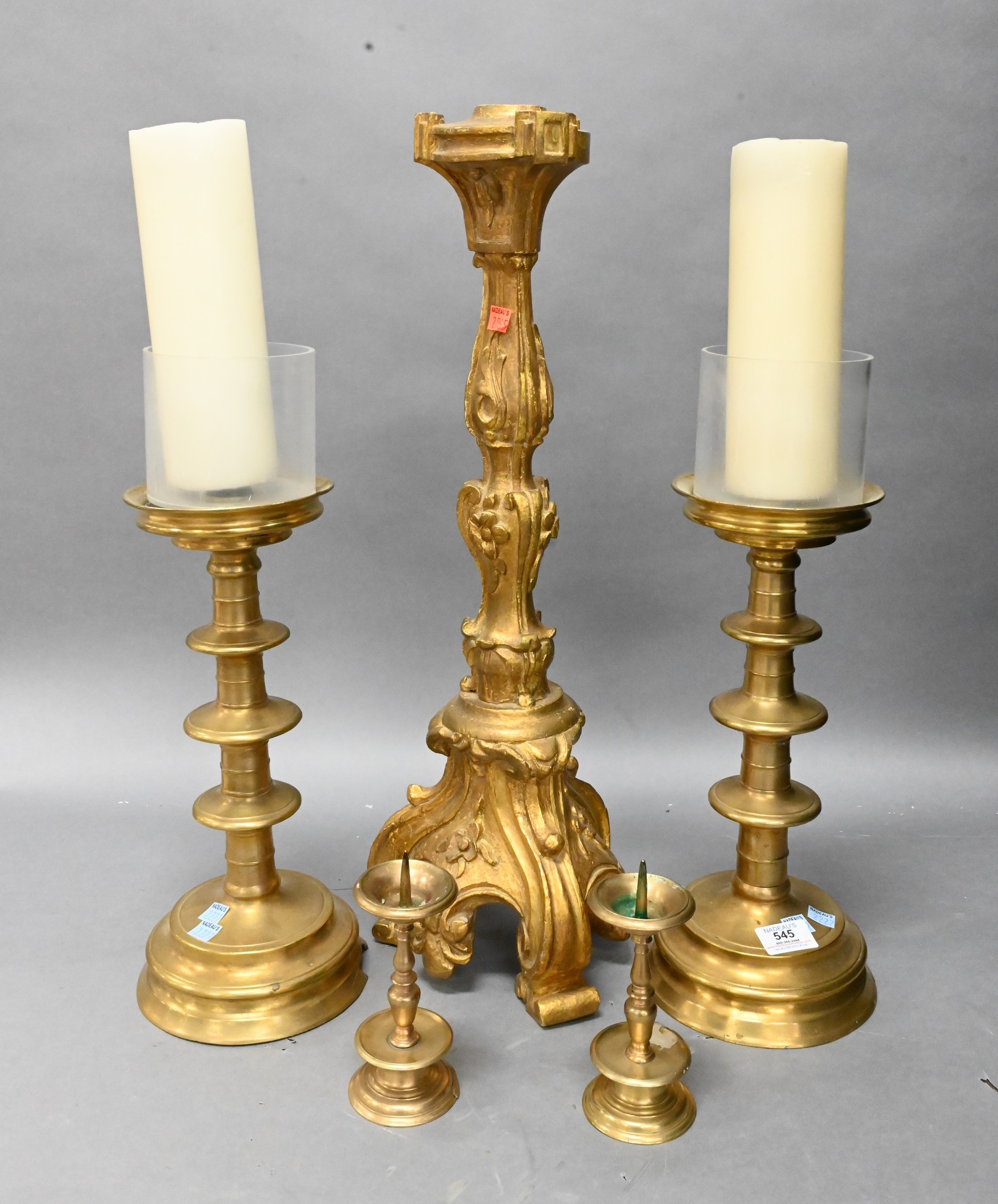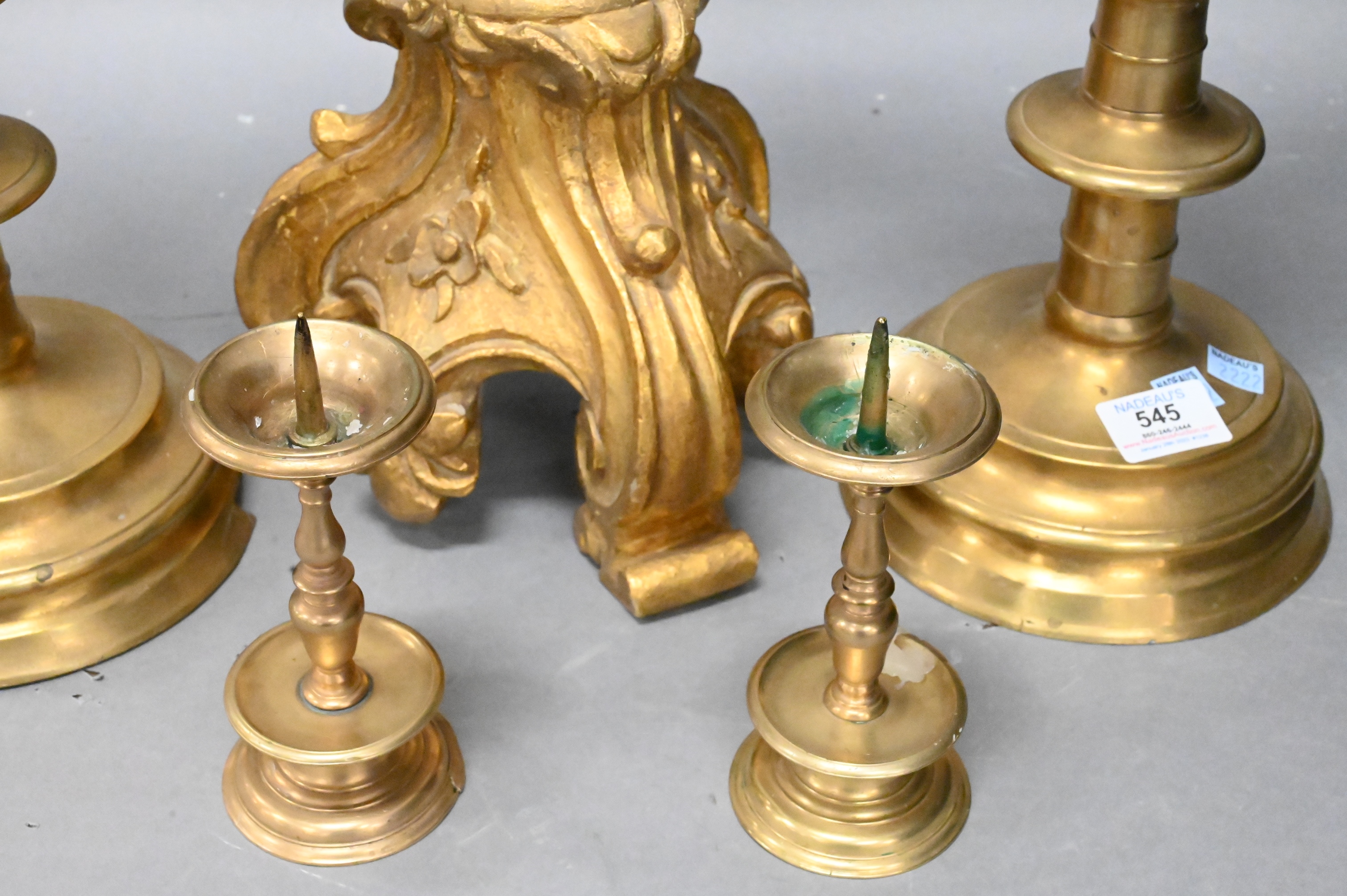 Assorted Group of Items, to include a pair of large brass candle prickets, a pair of small brass candle prickets, a tall carved French style wood pricket; along with a bundle of iron “Kissi Pennies” or Guinze, Liberia, late 19th/early 20th century, various heights to 22 inches. Provenance: Estate of Dr. Vallo Benjamin E 57th St New York