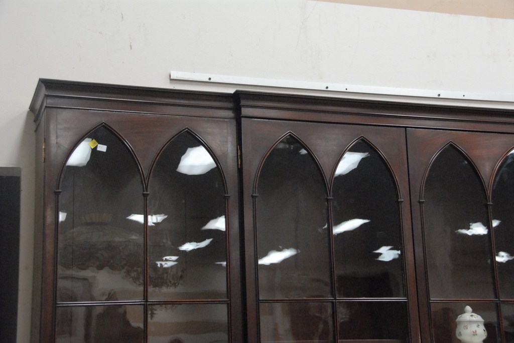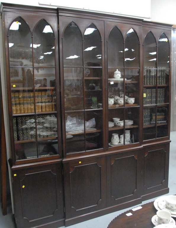 Lot 545: Gothic style mahogany bookcase in two parts with small cornice molding over four glazed doors with arch top glass over four wooden d…