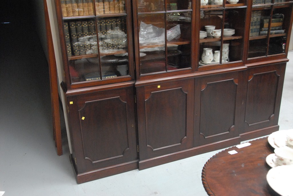 Gothic style mahogany bookcase in two parts with small cornice molding over four glazed doors with arch top glass over four wooden doors on plain base, interior with multiple adjustable shelves. ht. 91in. wd. 85in. dp. 11in.