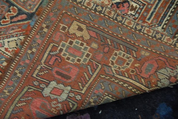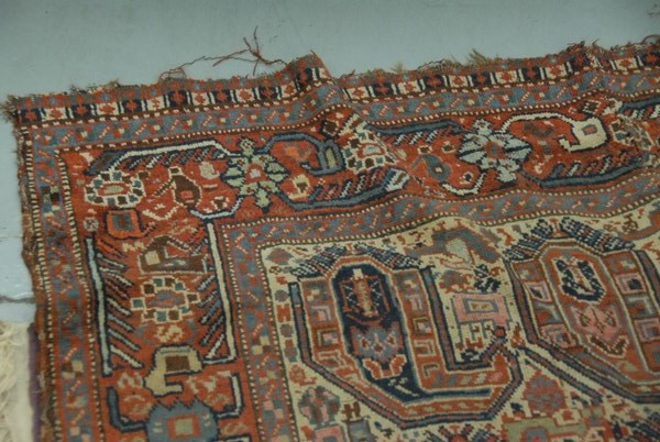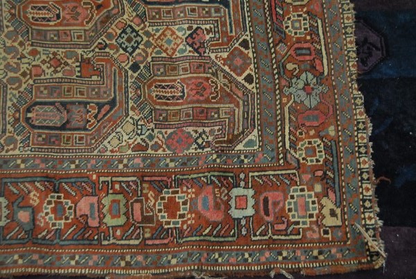 Khamseh Southwest Persian Oriental rug, worn and cut. 4′ 5 x 5′