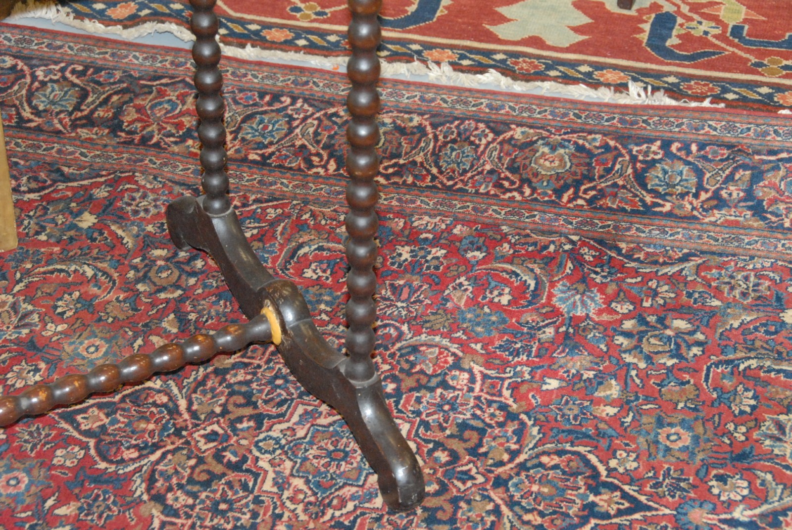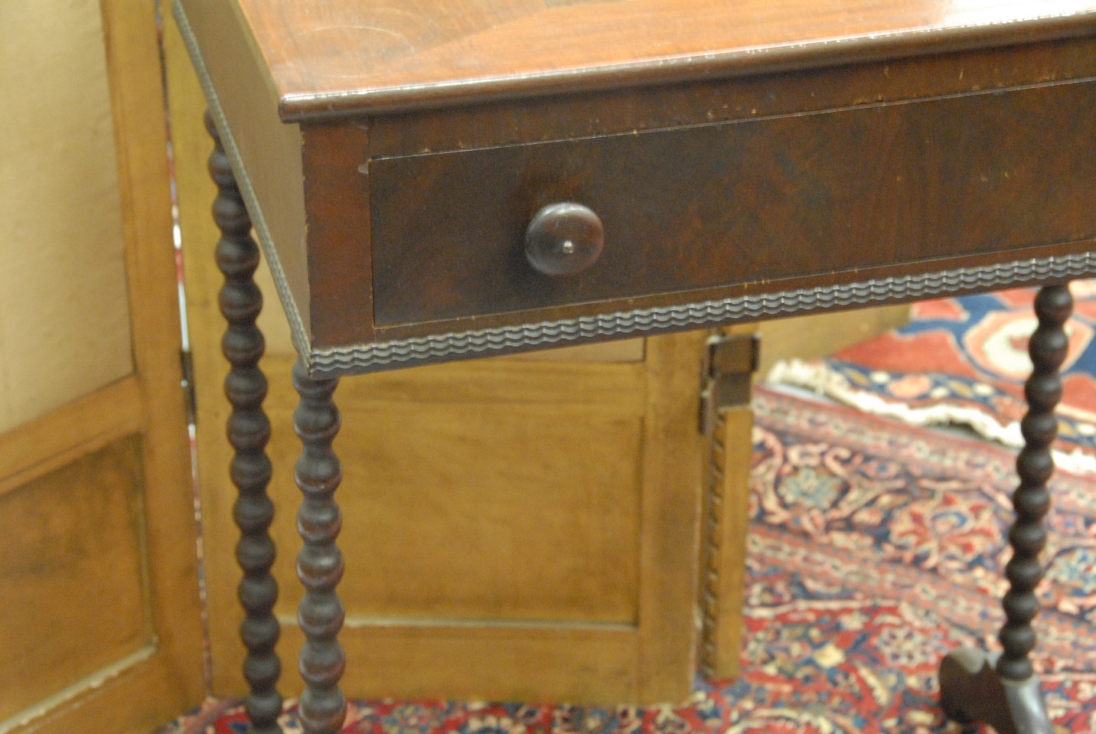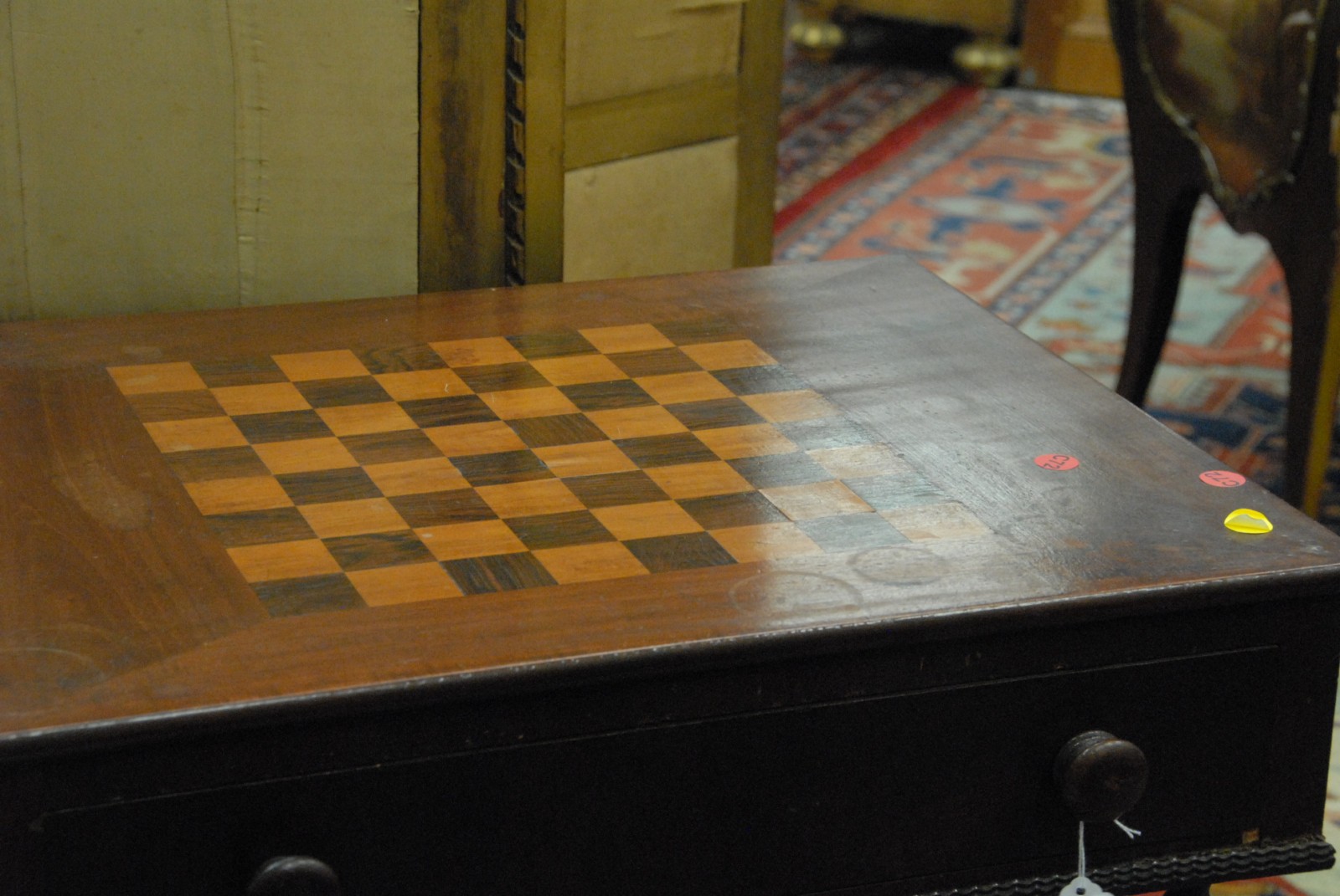 Mahogany gaming table with inlaid checkerboard top and one drawer on spool legs.