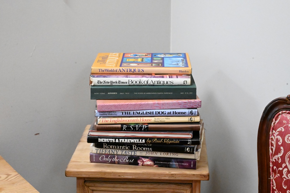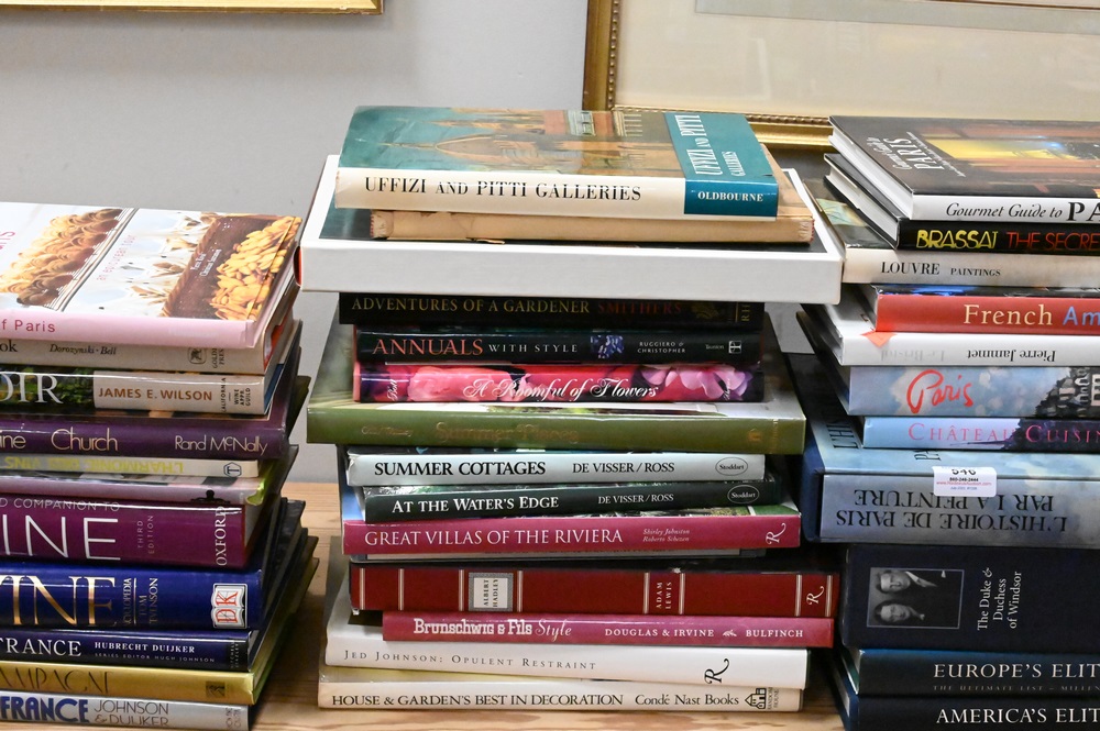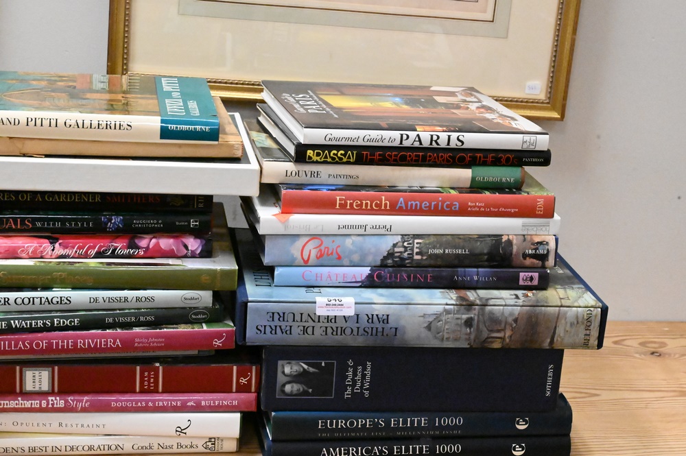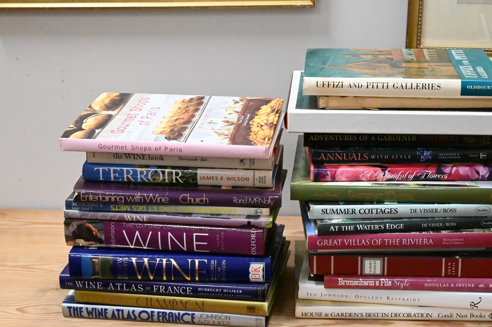 Approximately 47 Various Coffee Table Books, topics include wine, France, antiques, along with home decor.