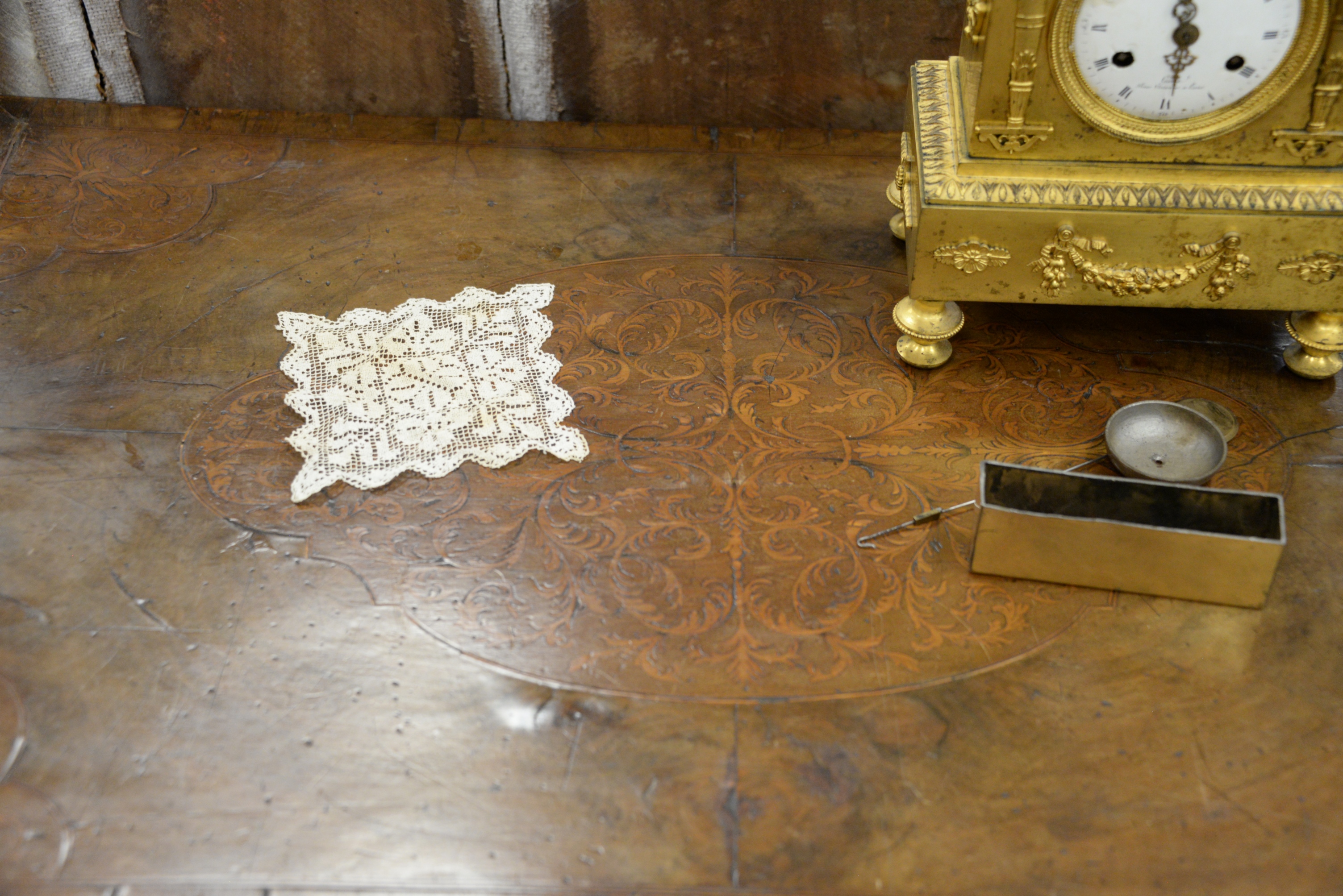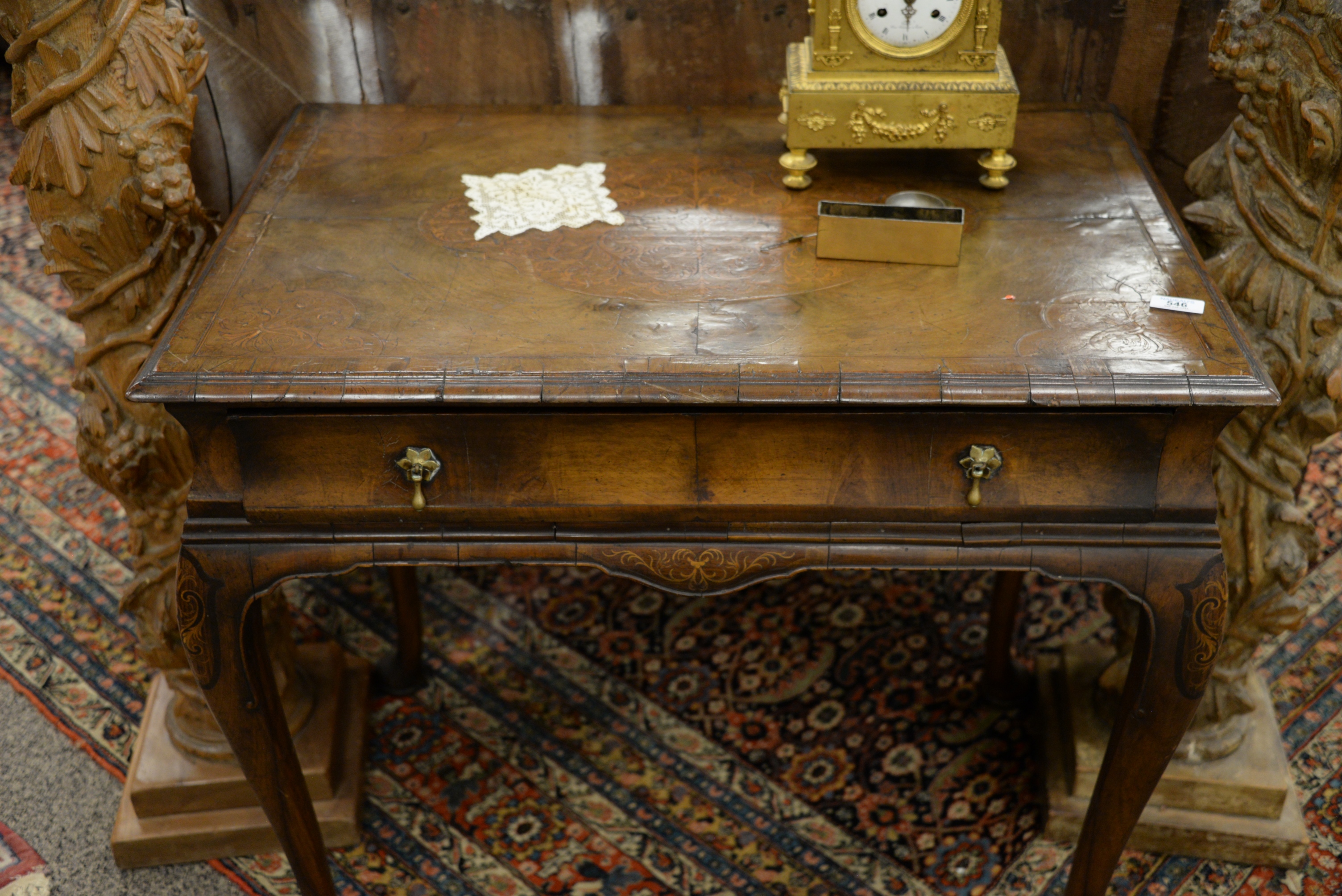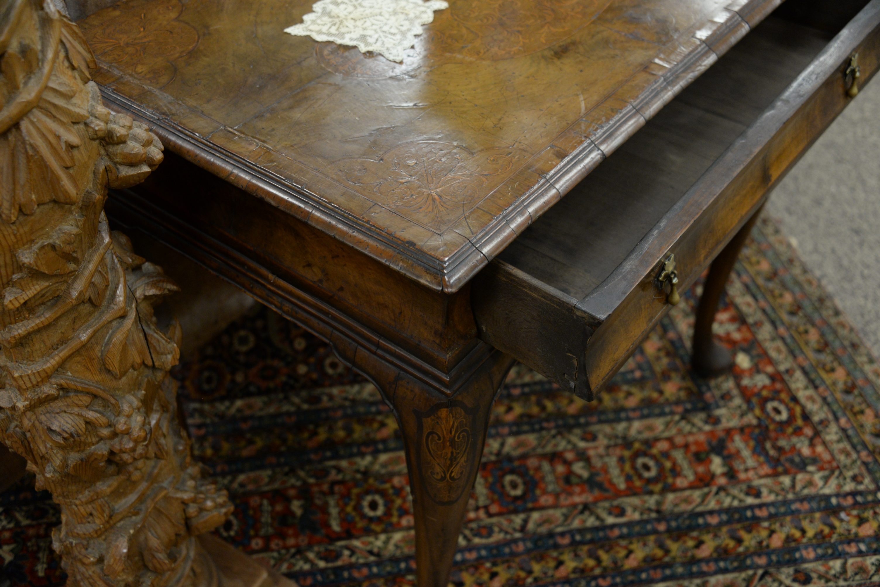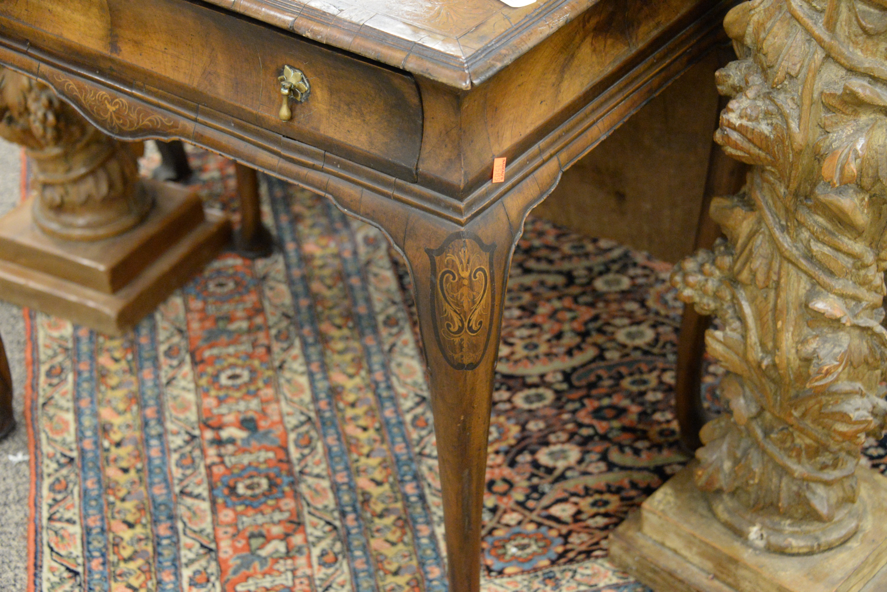 George II Style Walnut Dressing Table, having marquetry inlaid paneled top over concave drawer, all on cabriole legs ending in pad feet, partially made up of old elements, height 30 1/2 inches, top 22″ x 32 1/2″.