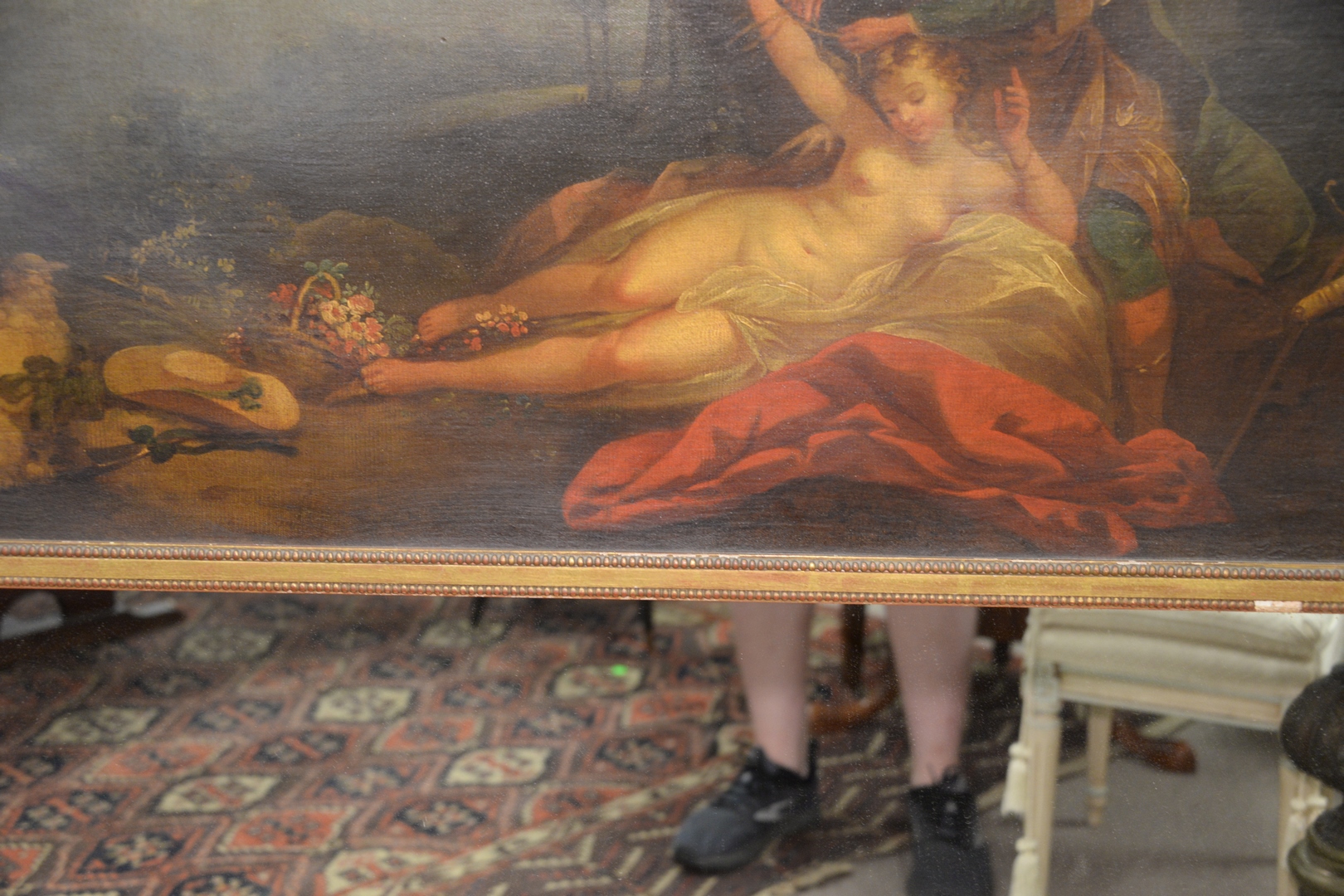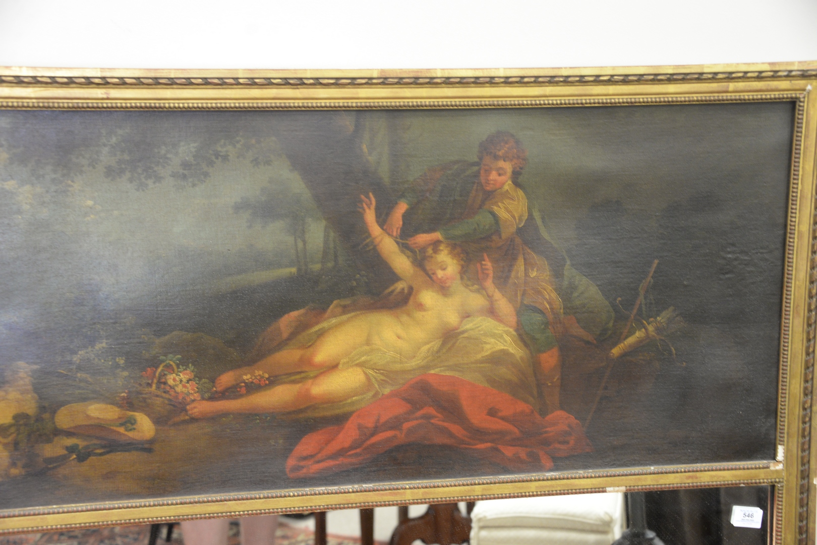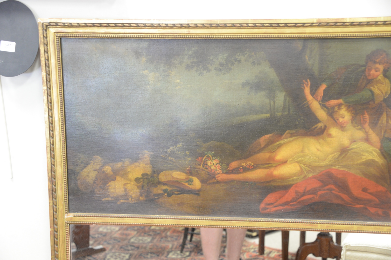 Lot 546: Large Trumeau Mirror, having oil on canvas top with painted classical scene having two figures and sheep, over rectangle mirror, 54 1/2″ x 51″.