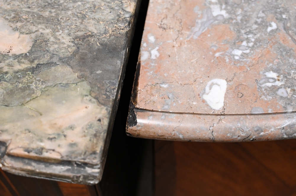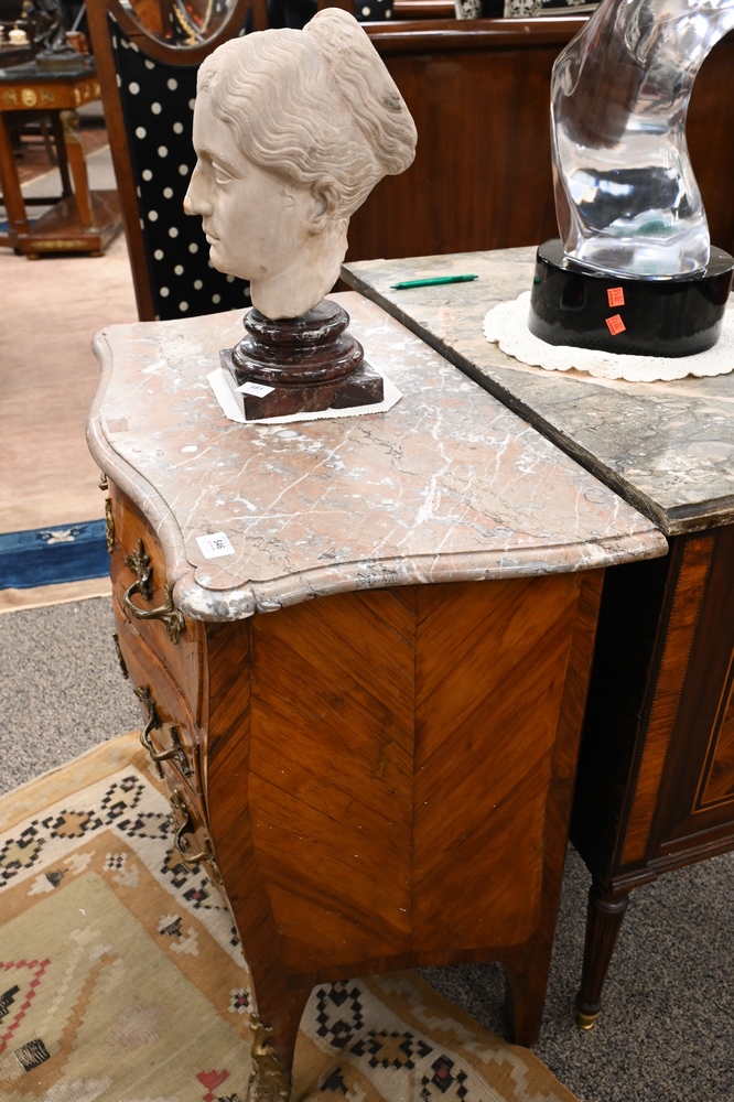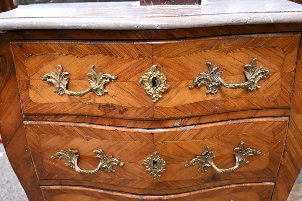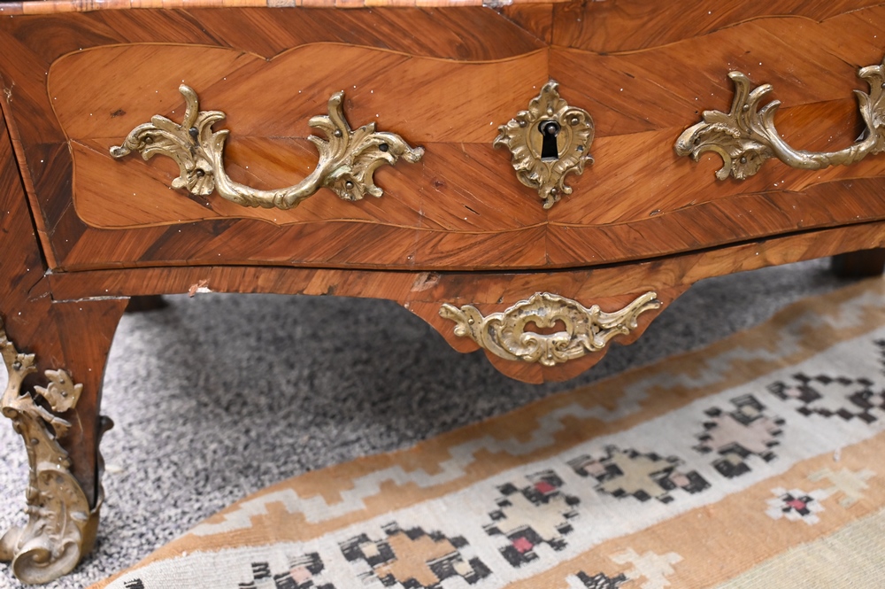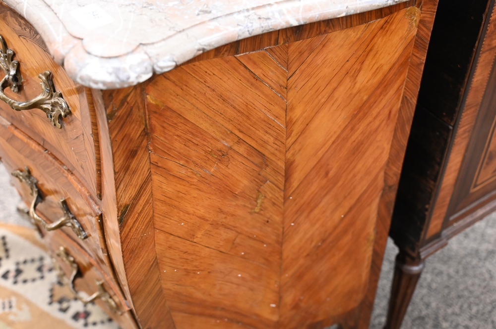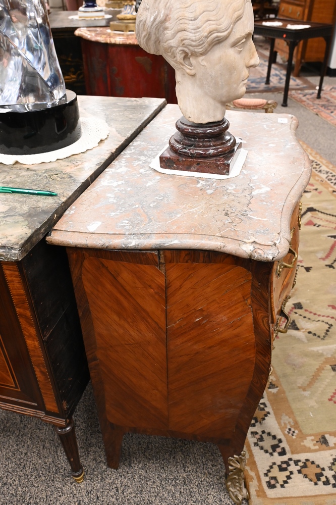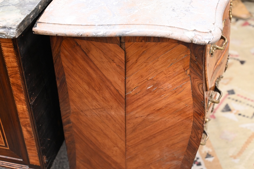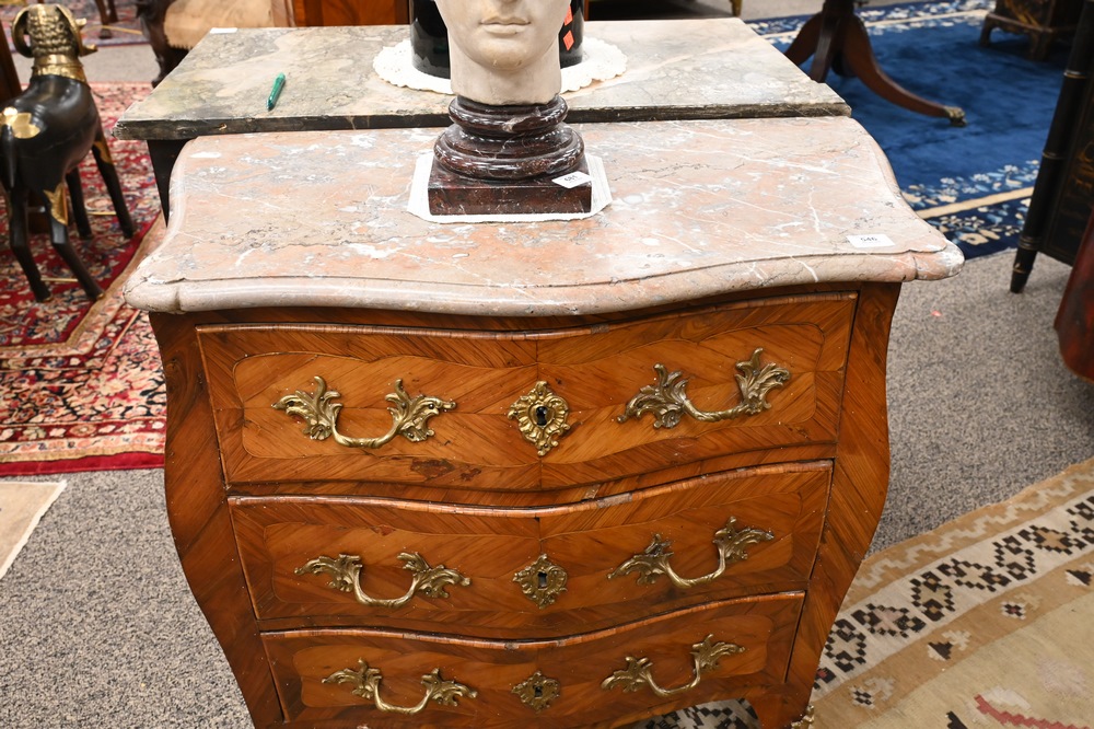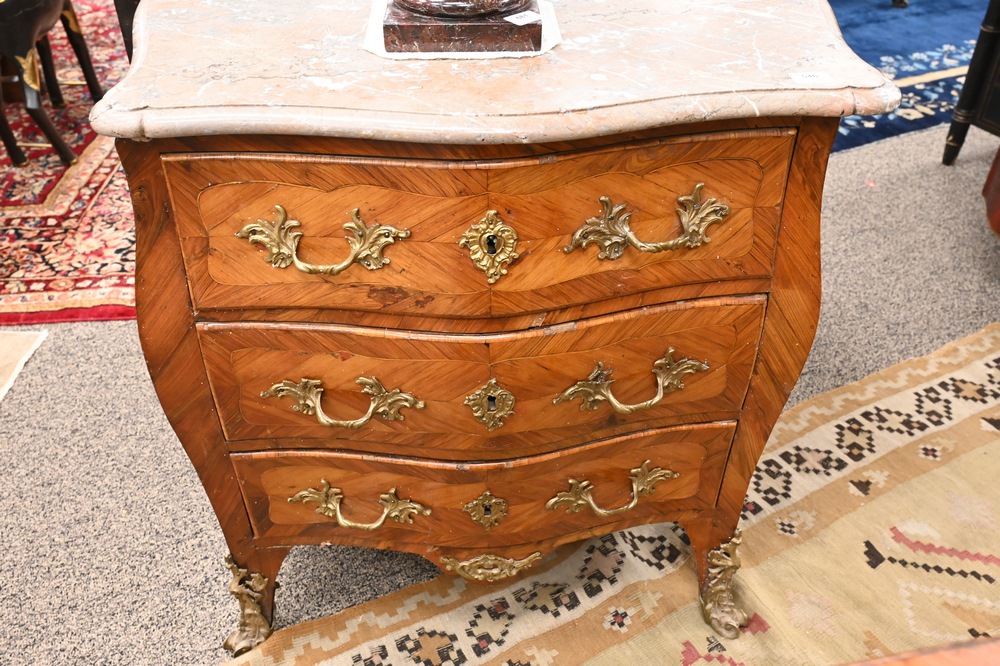 Lot 546: Louis XV Style Commode, having shaped marble top over three drawers, signed Coulon impressed twice (splits and veneer damage), heigh…