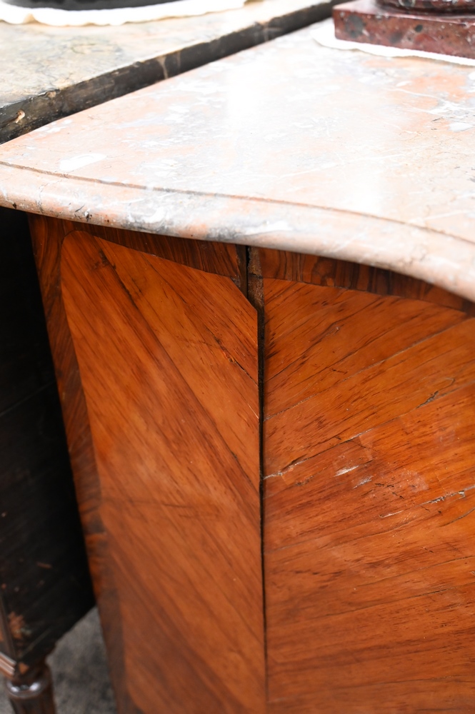 Louis XV Style Commode, having shaped marble top over three drawers, signed Coulon impressed twice (splits and veneer damage), height 32 inches, top 18″ x 33″.