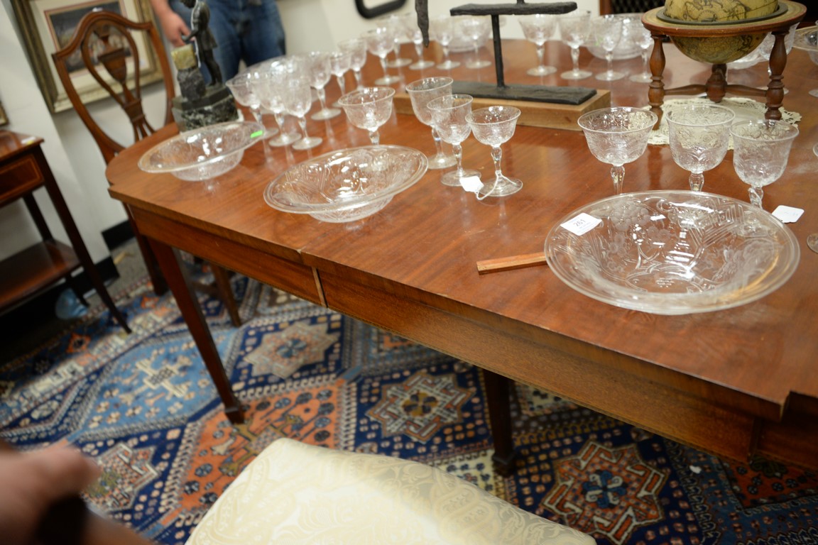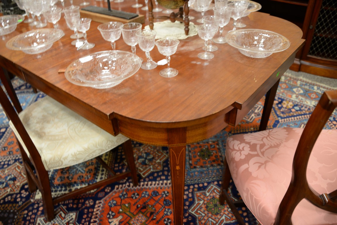 Lot 546: Margolis Federal style dining table with D shaped ends on square tapered legs with two 12inch leaves. top finish as is. ht. 30in….