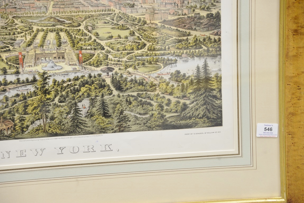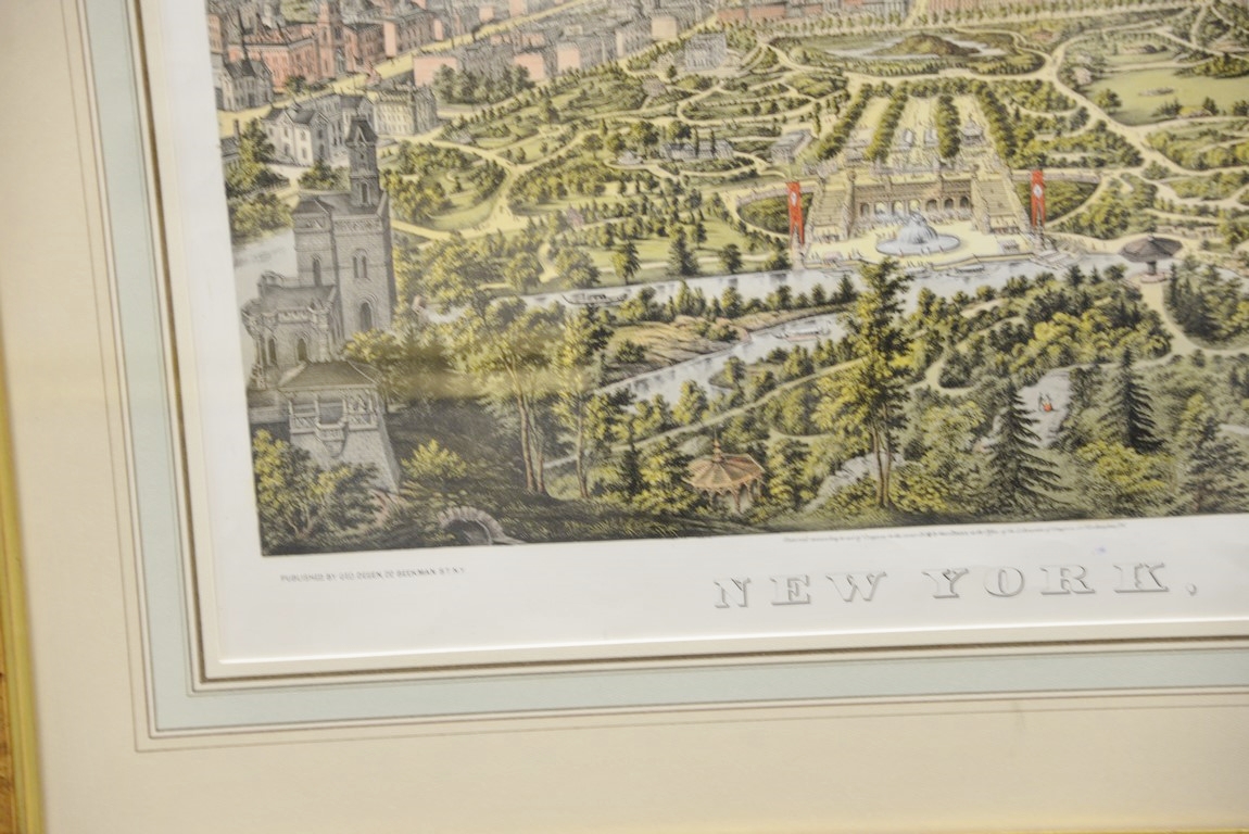 Lot 546: New York hand colored lithograph taken from Central Park 1874 marked lower left: published by Geo. Degen, 22 Beekman St., N….