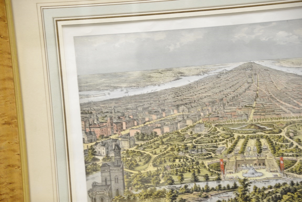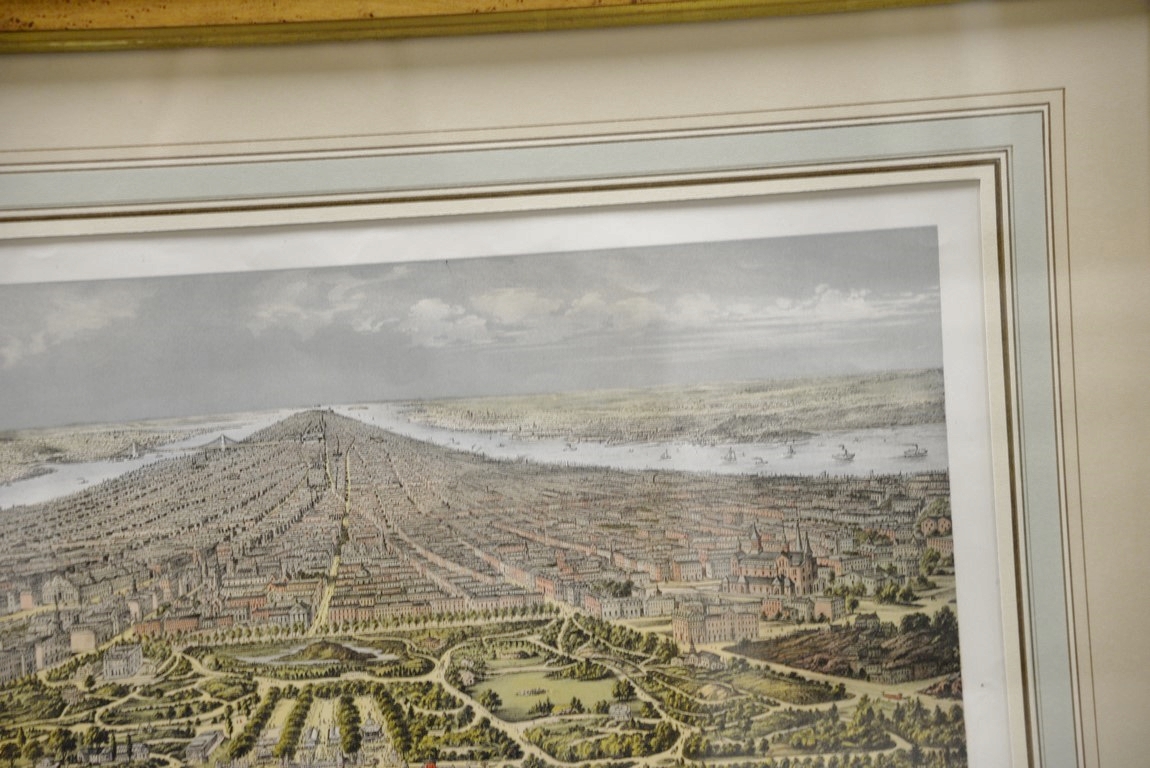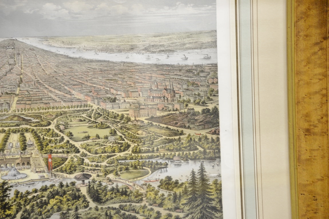 New York hand colored lithograph taken from Central Park 1874 marked lower left: published by Geo. Degen, 22 Beekman St., N.Y. marked lower right: Print by G. Shlegel, 97 William St., N.Y. Wesley Allen Framemakers sight size 18 x 25 Provenance: Property from Credit Suisse’s Americana Collection