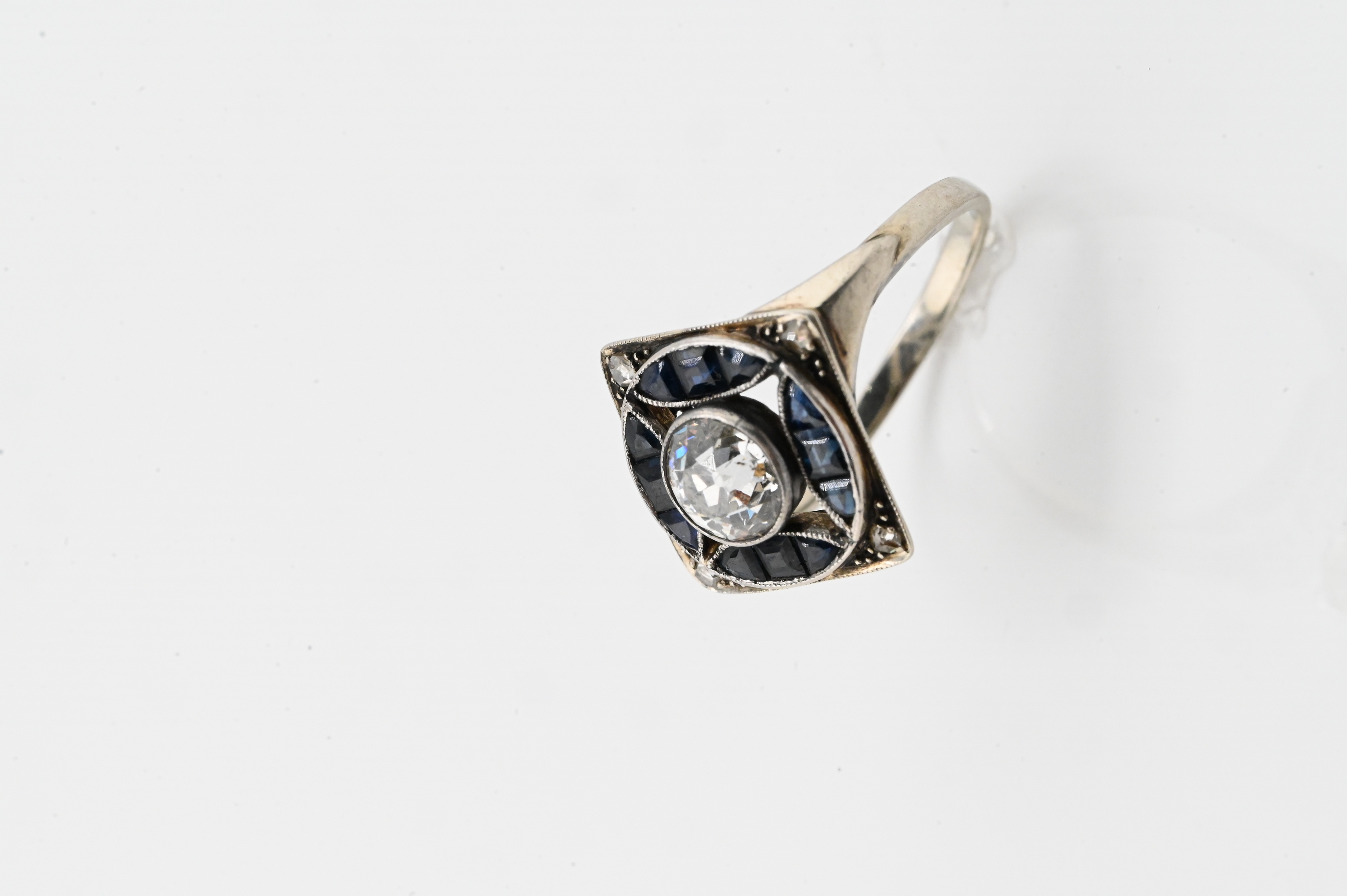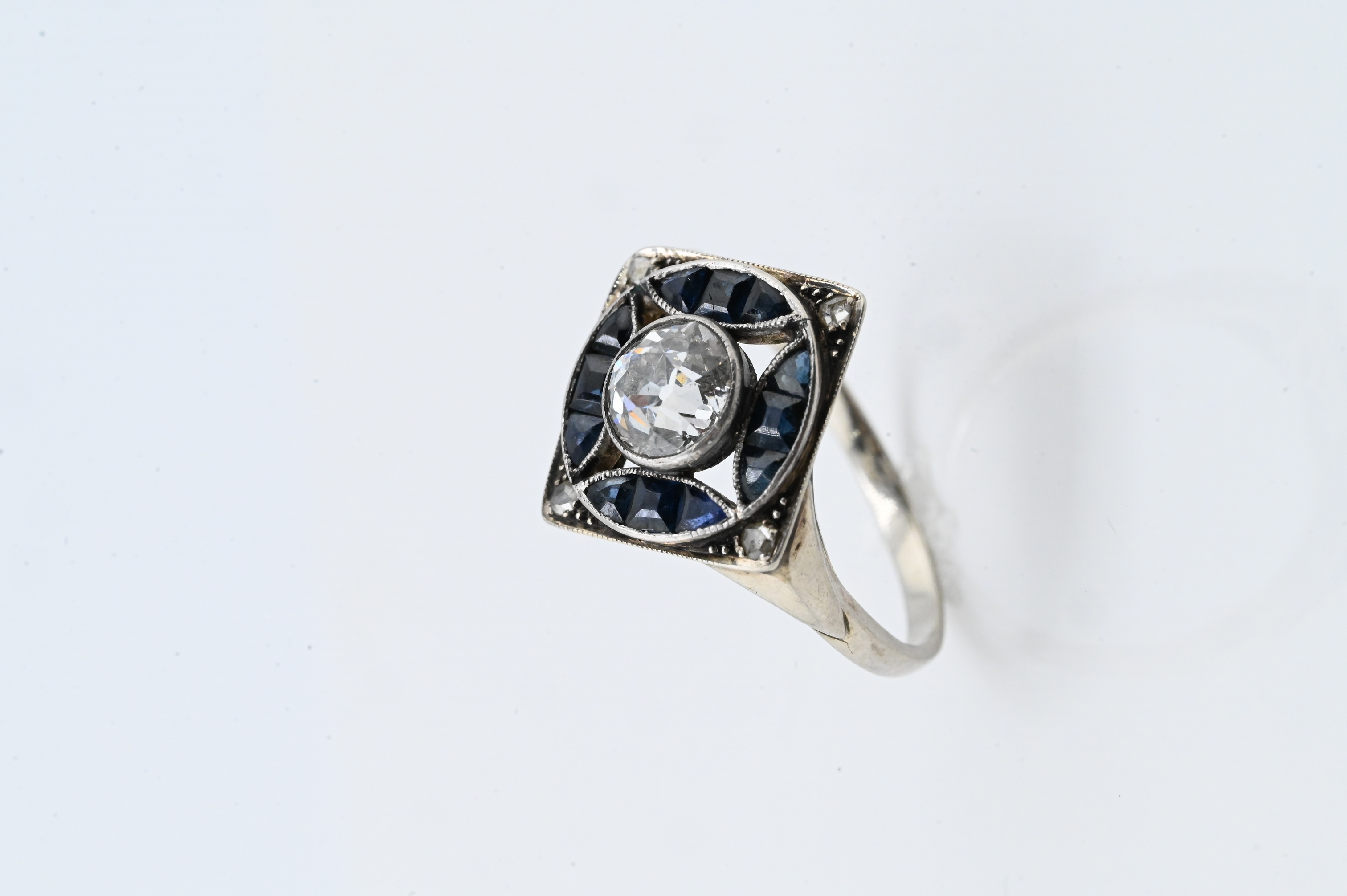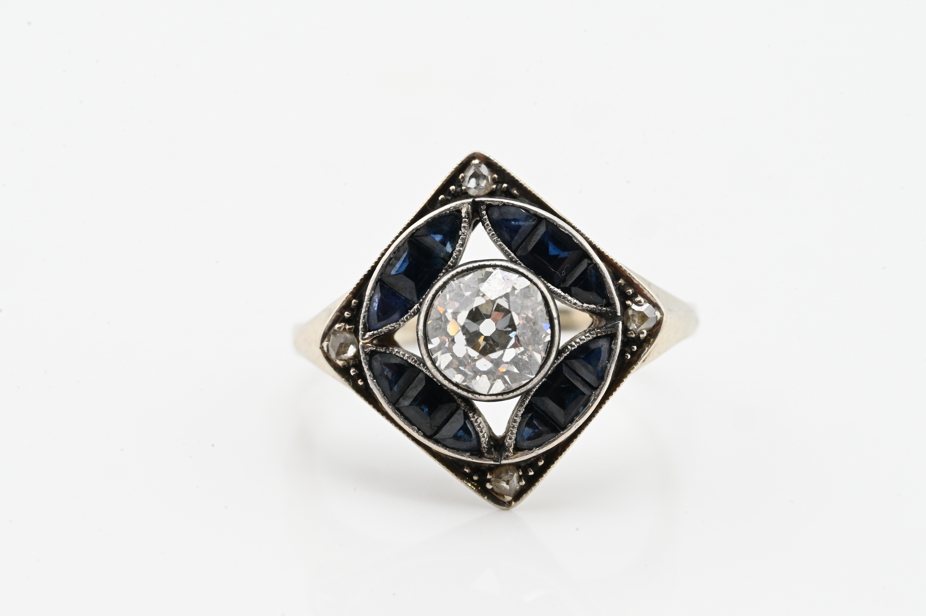 Set with a brilliant-cut round diamond measuring approx. 6mm (approx. 0.75 carat) centered within a square plaque accented by calibre-cut blue sapphires at the cardinal points, with small accent diamonds at the corners; elegant pierced gallery and tapering shank.