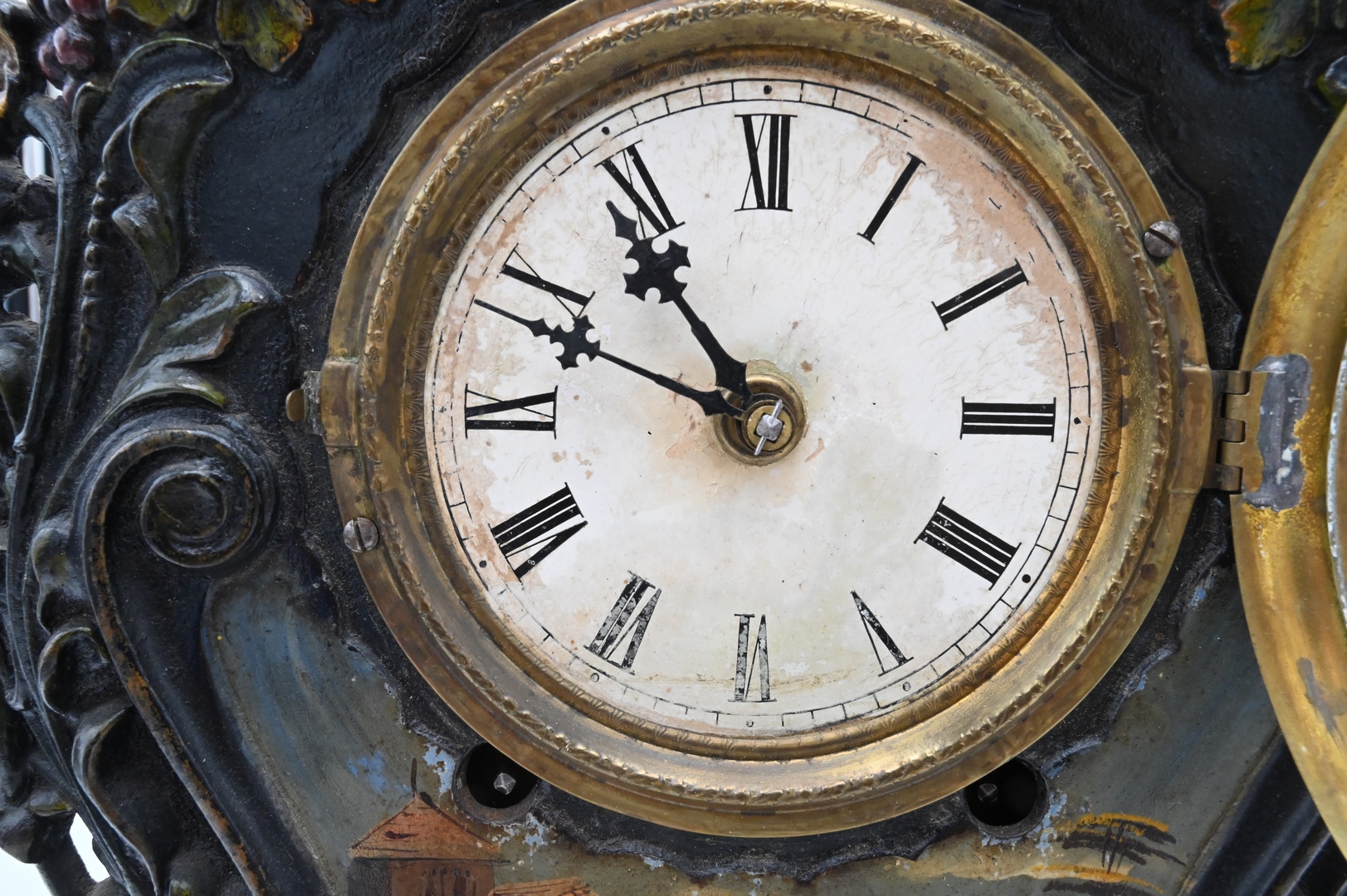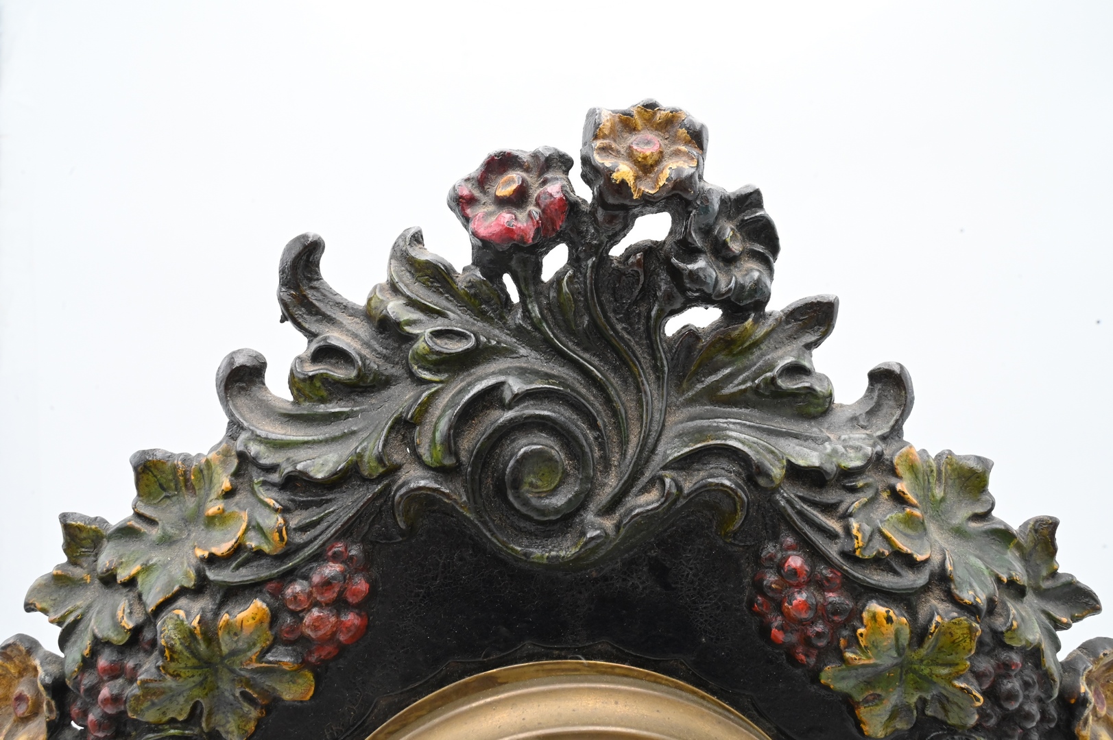 Cast Iron Mantle Clock, having painted flowers, landscape scene with mother of pearl inlay, height 19 3/4 inches. Provenance: Estate of Peter Tillou, Litchfield, Connecticut.