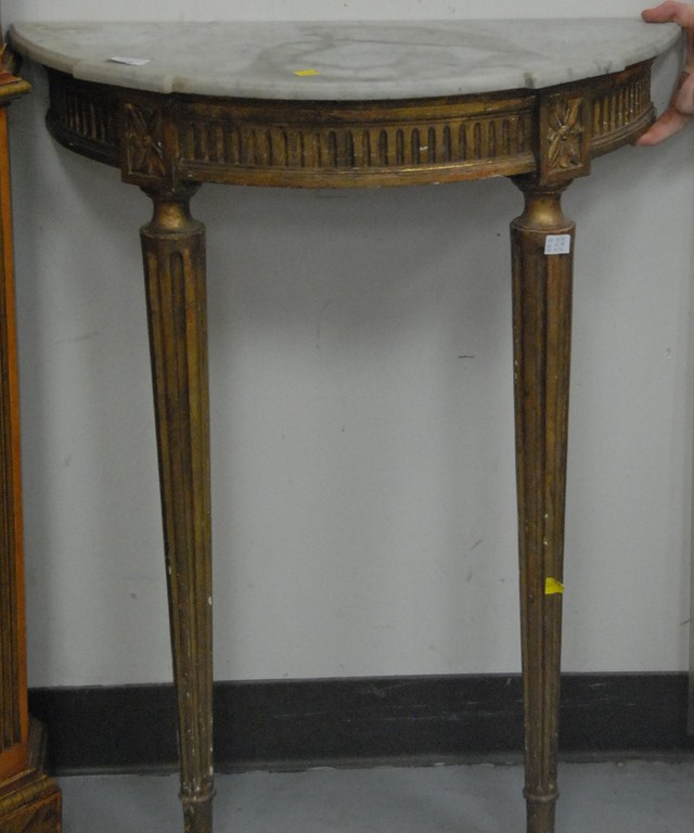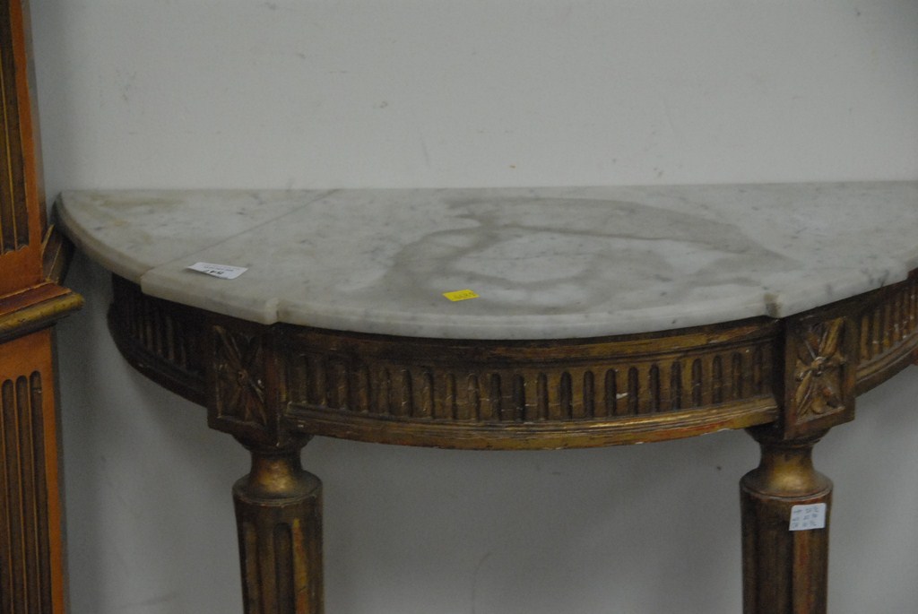 Lot 547: Louis XVI half round console table with marble top on gilt frame and round fluted tapered legs, 19th century. ht. 32 1/2in. Proven…..