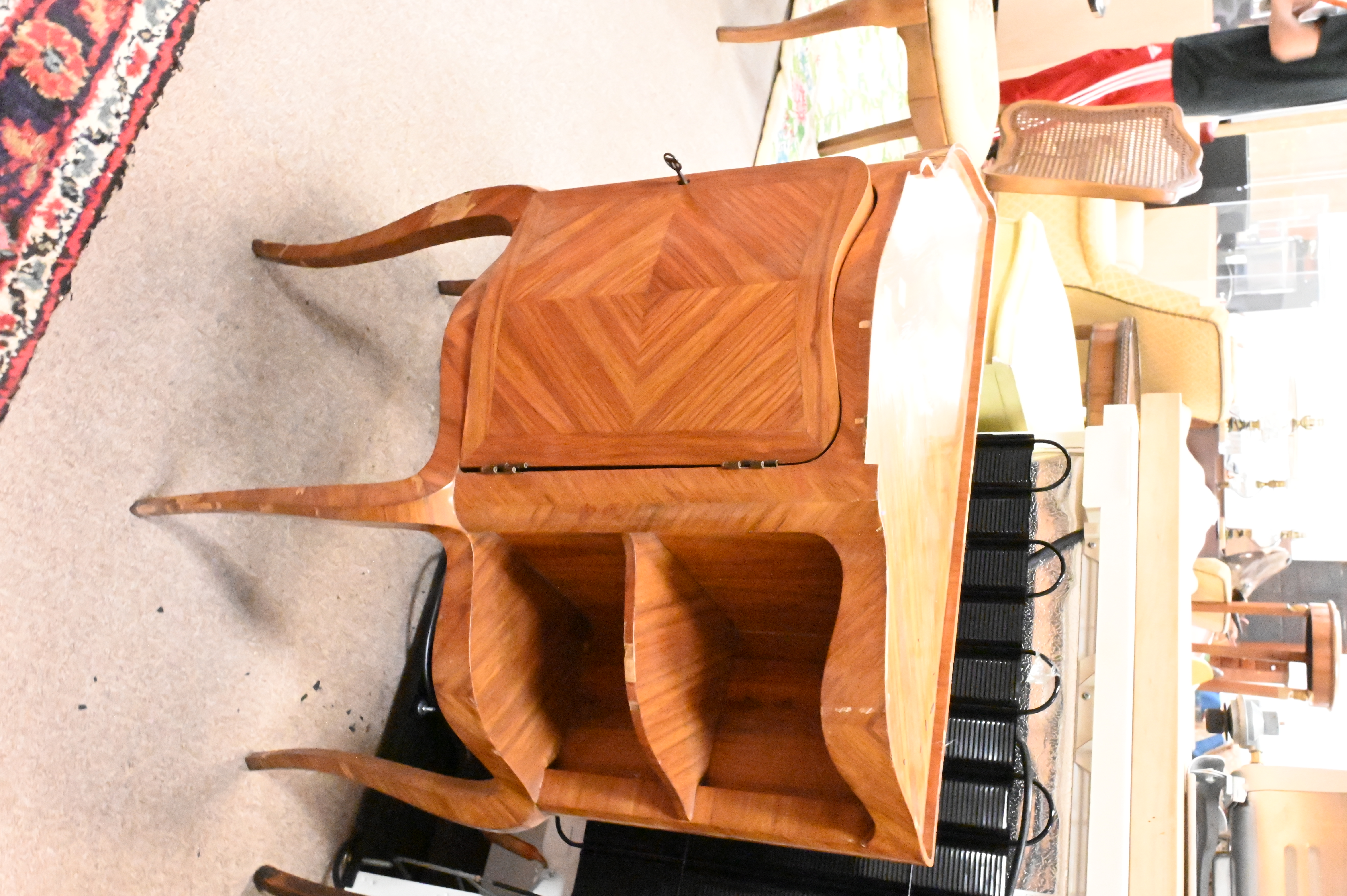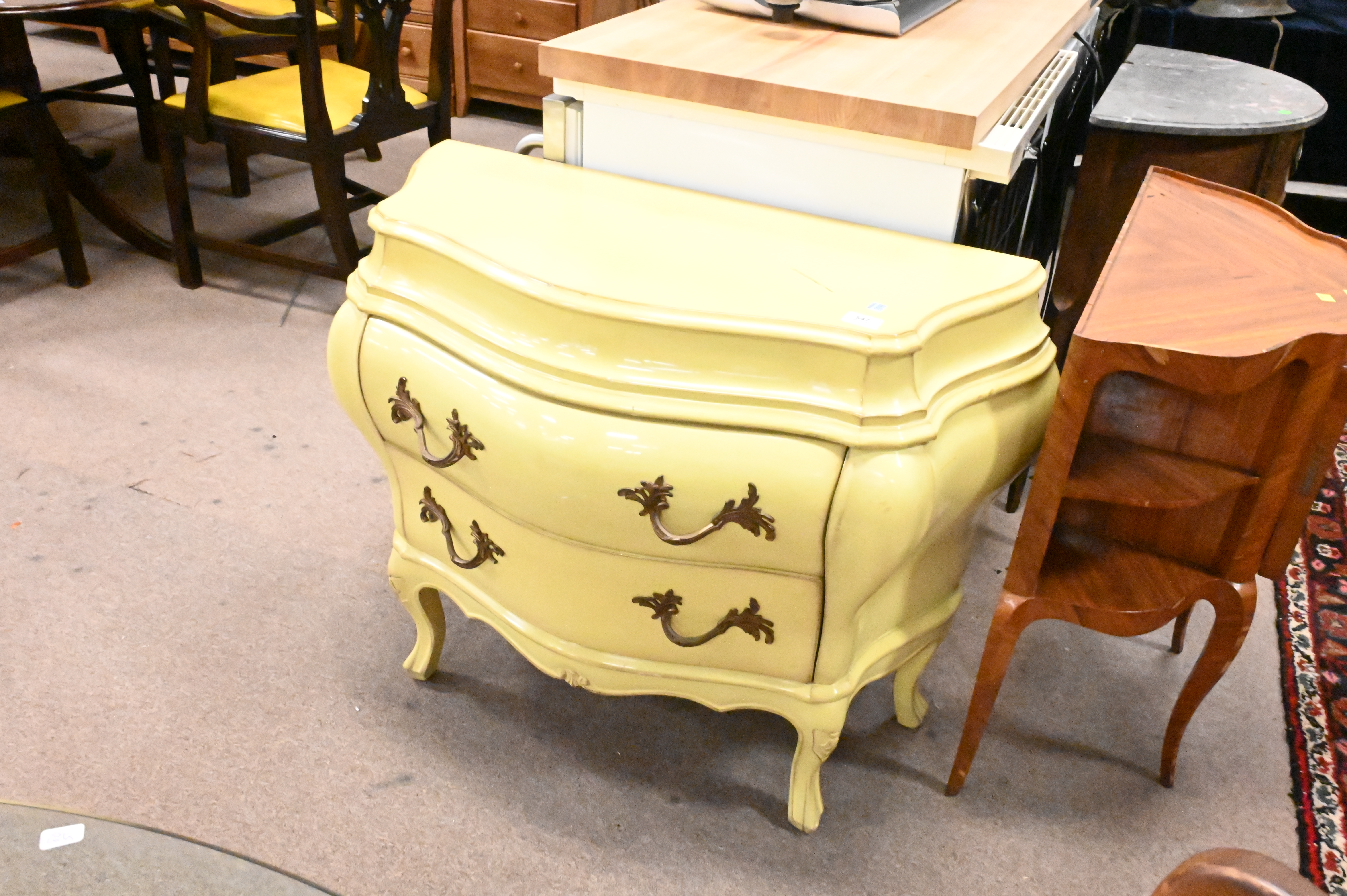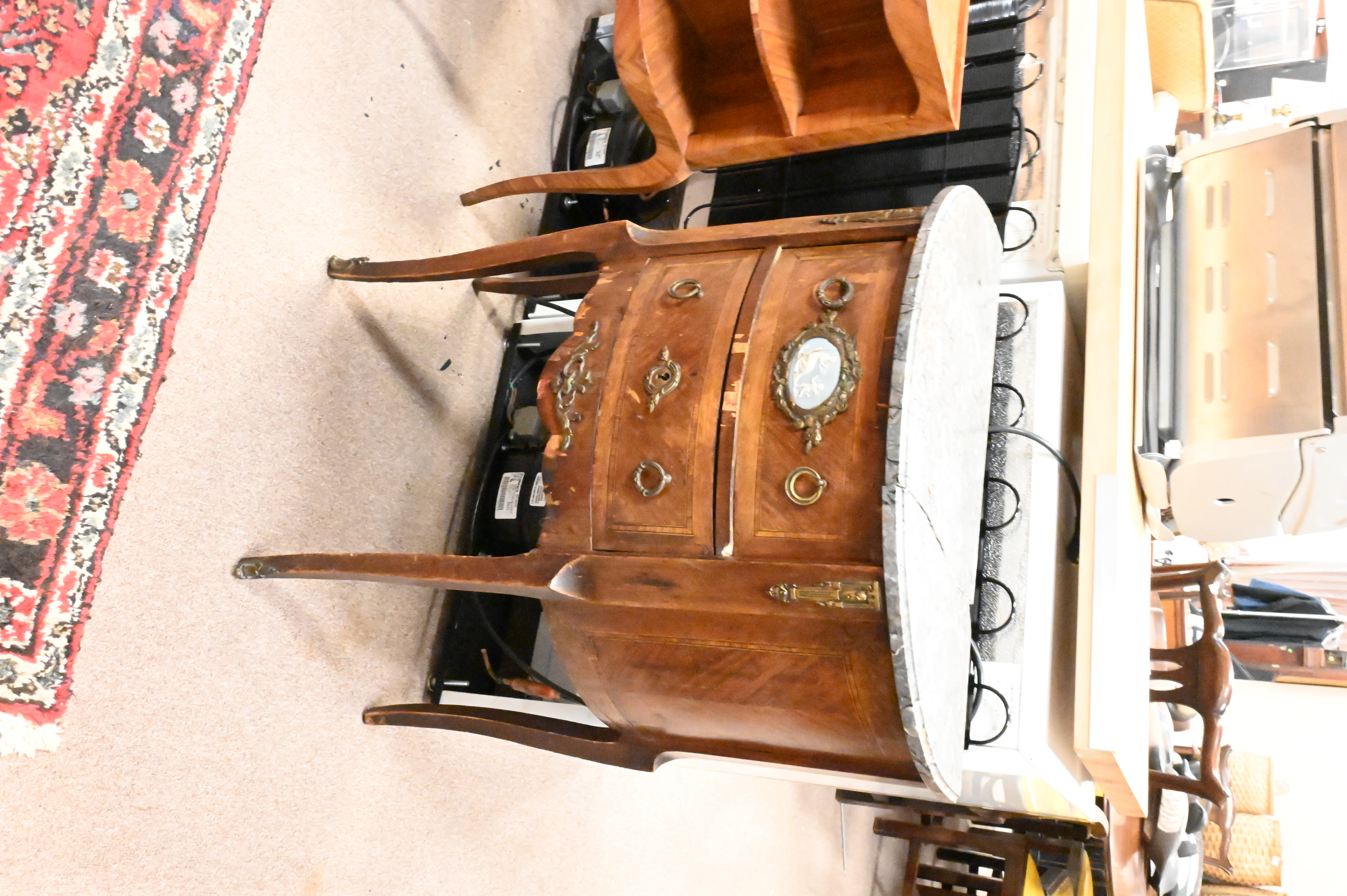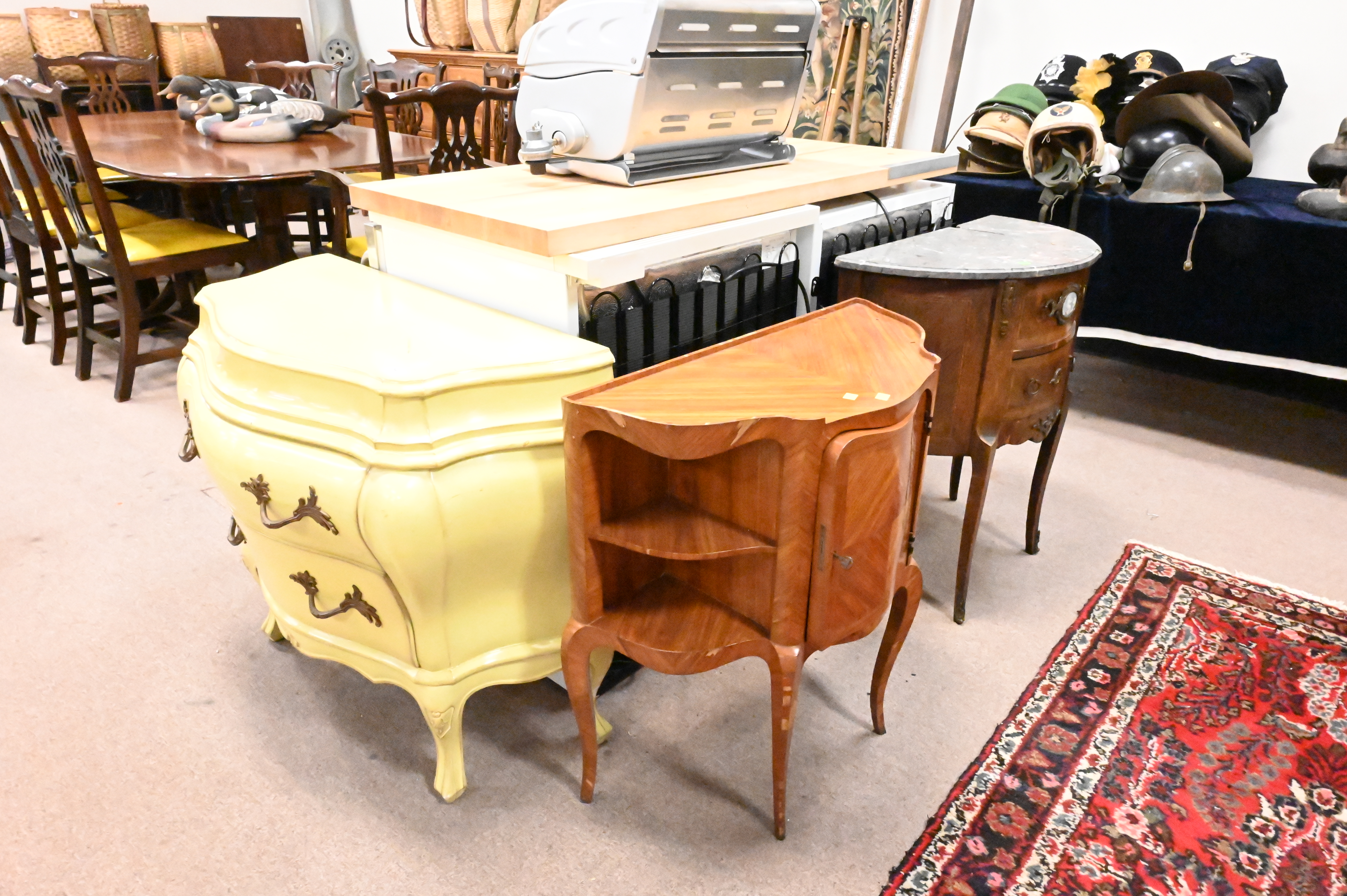 Three Piece French Lot, to include a painted commode, a shaped top table, along with a demilune cabinet with marble top (as is), tallest height 30 inches.