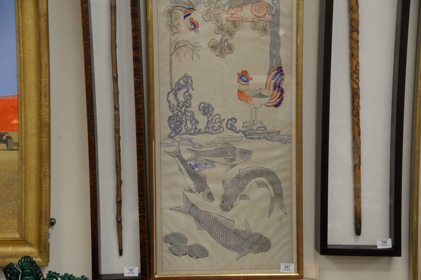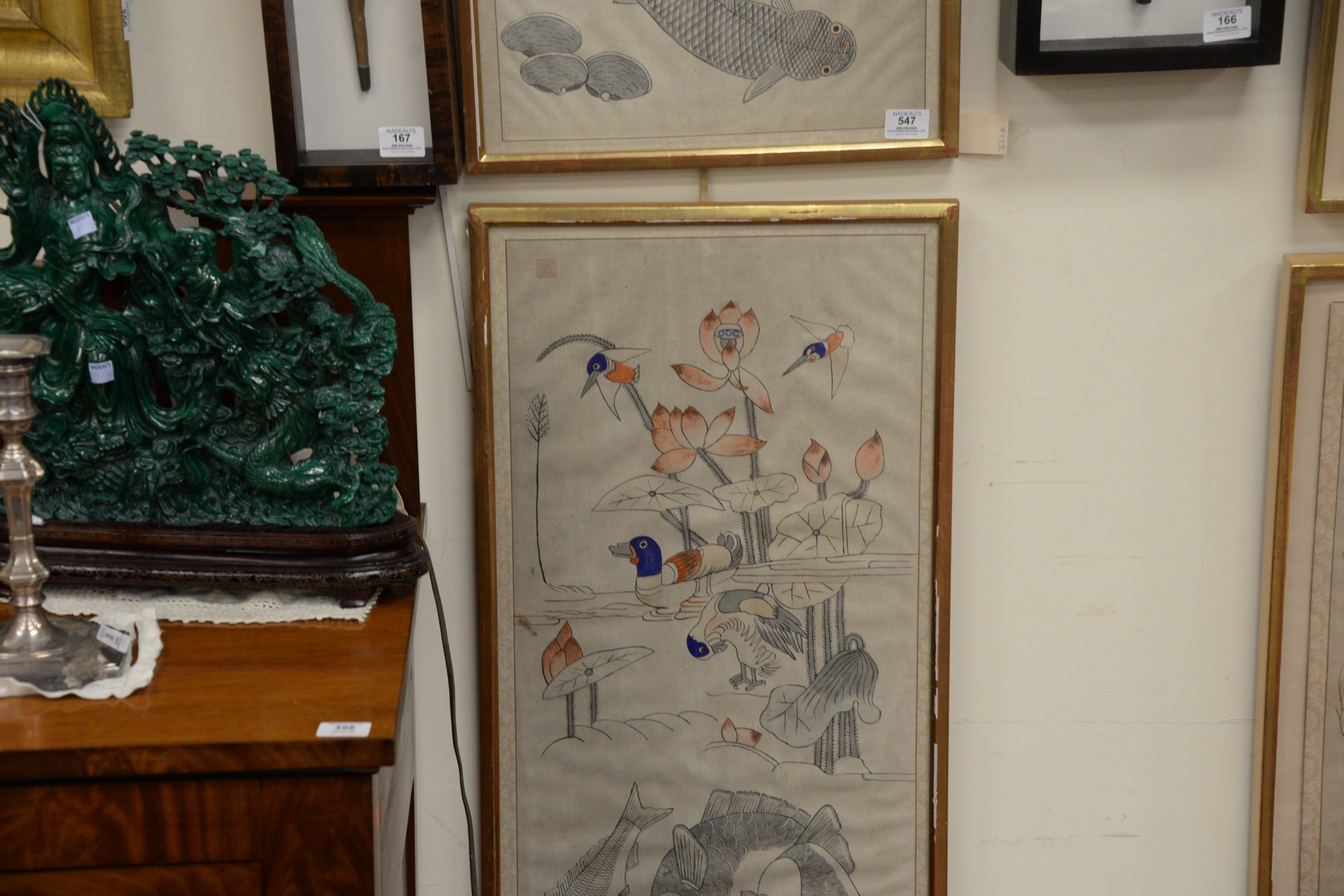 Lot 547: Two Korean Oil on Linen Wedding Scrolls, one with ducks and hummingbirds one with fighting roosters, image size of each: 35 1/4 x 14 1/2.