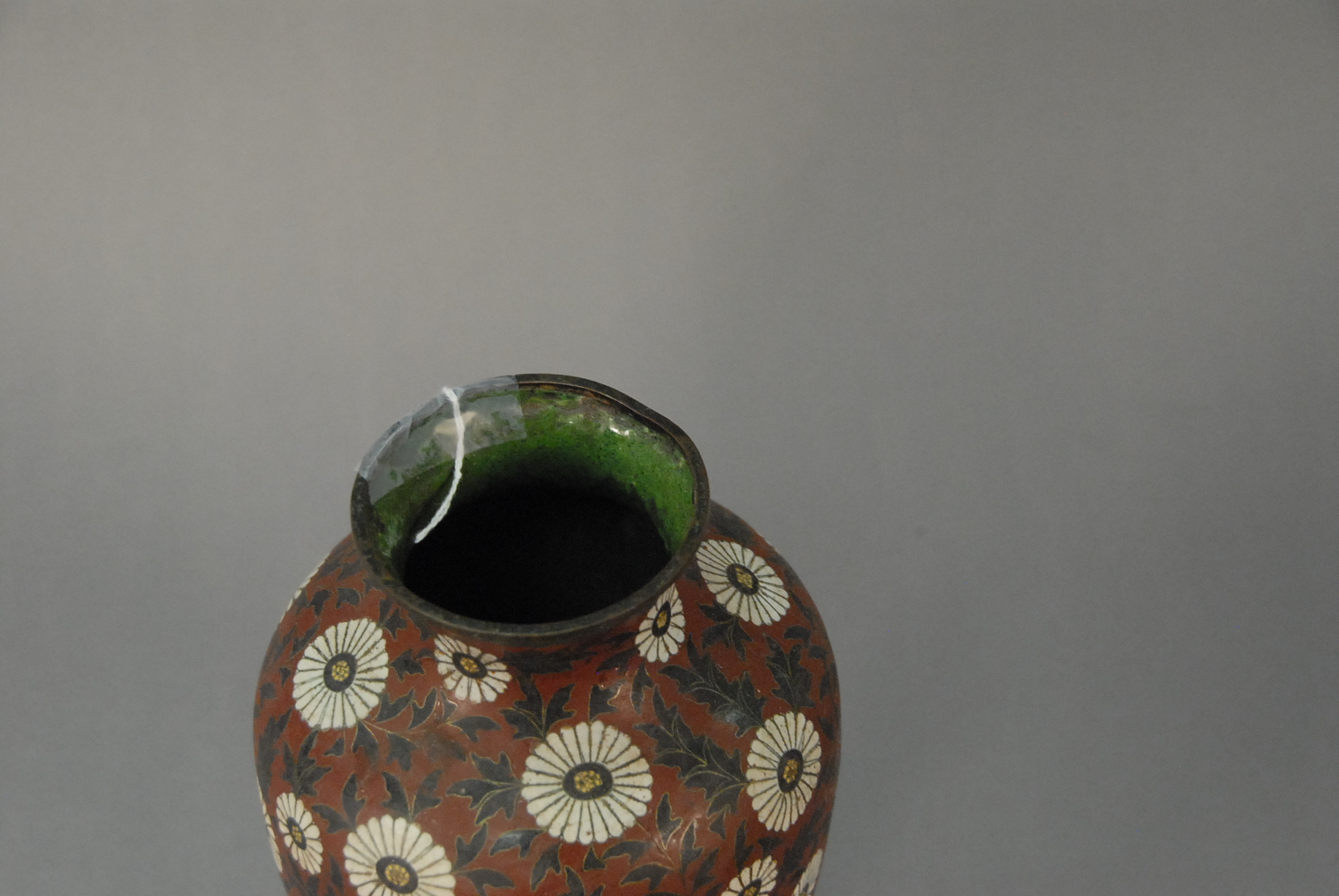 Lot 547: Unusual cloisonn baluster vase with white chrysanthemums on reddish brown background, marked, China, 19th century dent to mouth rim. ht. 12 1/2in.
