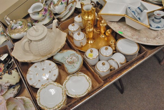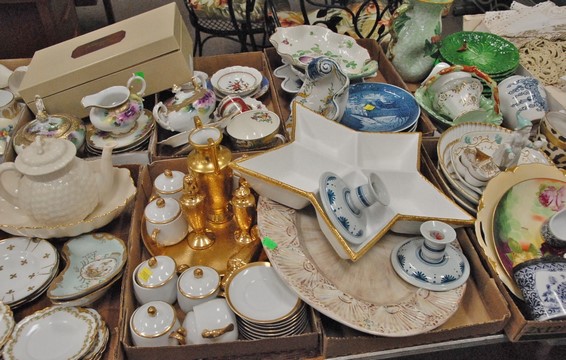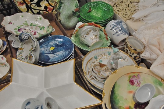 Eight box lots including Mottahedeh design shell dishes, fruit dishes, leopard print, Ancora dish, Vietri cabbage dishes, Blue Danube, Wililamsburg, Delft, Lenox, serving dishes, etc.