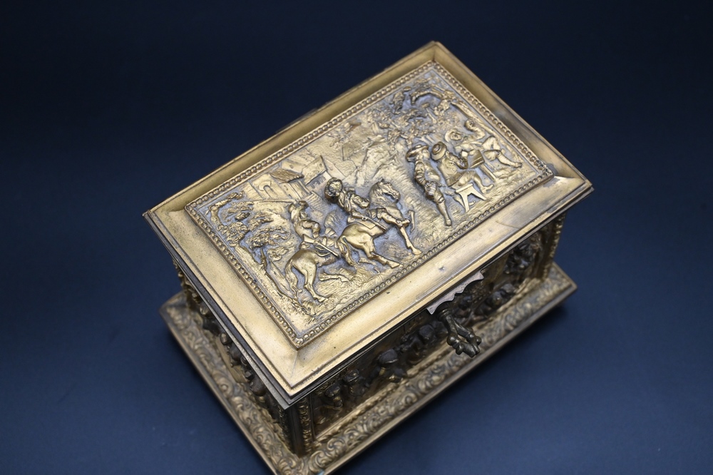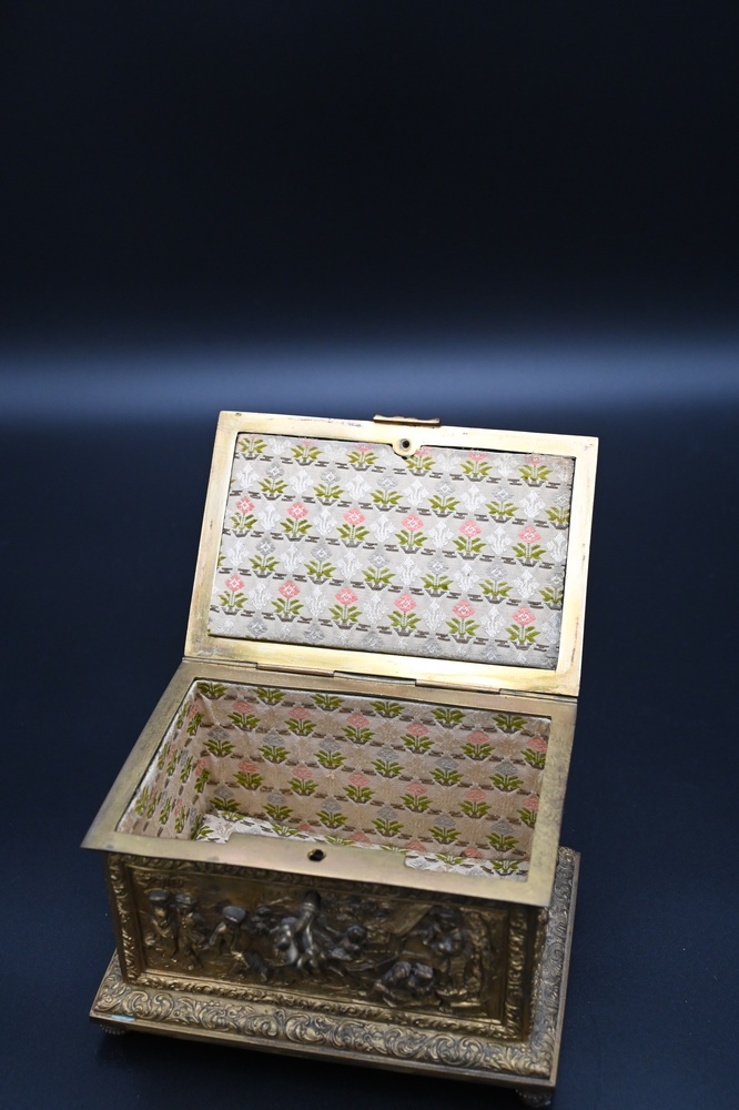 Lot 548: French Gilt Bronze Jewelry Box, having panels depicting figures dancing and eating, marked France, height 3 3/4 inches, top 3 3/4 x …