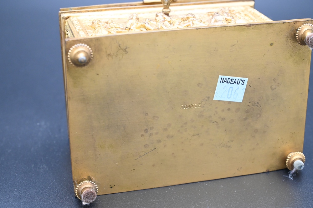 French Gilt Bronze Jewelry Box, having panels depicting figures dancing and eating, marked France, height 3 3/4 inches, top 3 3/4 x 5 1/2 inches.
