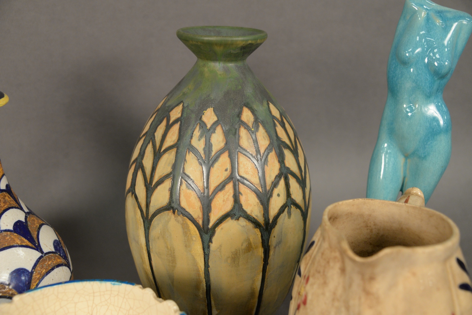 Group of Seven French Ceramic Vessels to include one red glazed vase, marked Marcel Guillard to the underside one vase with green decoration, marked Keramis to the underside four other vases, each unmarked along with a female nude blue glazed figure, tallest 13 inches.