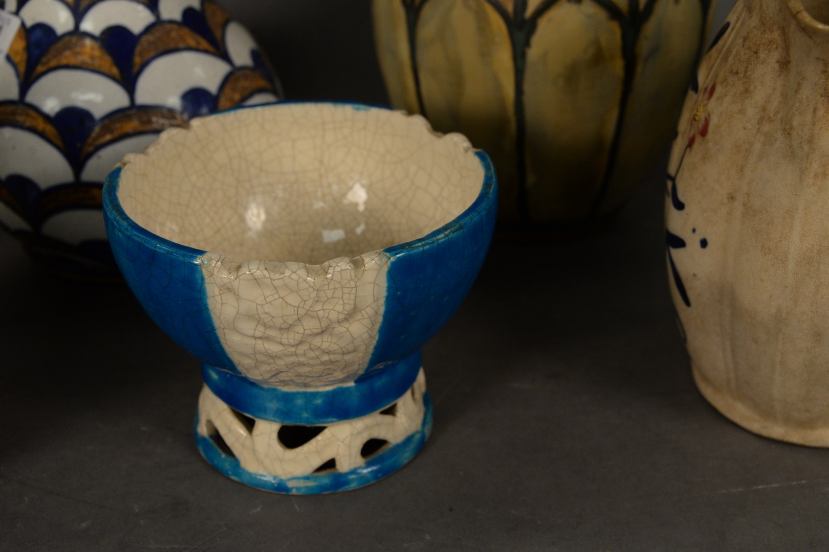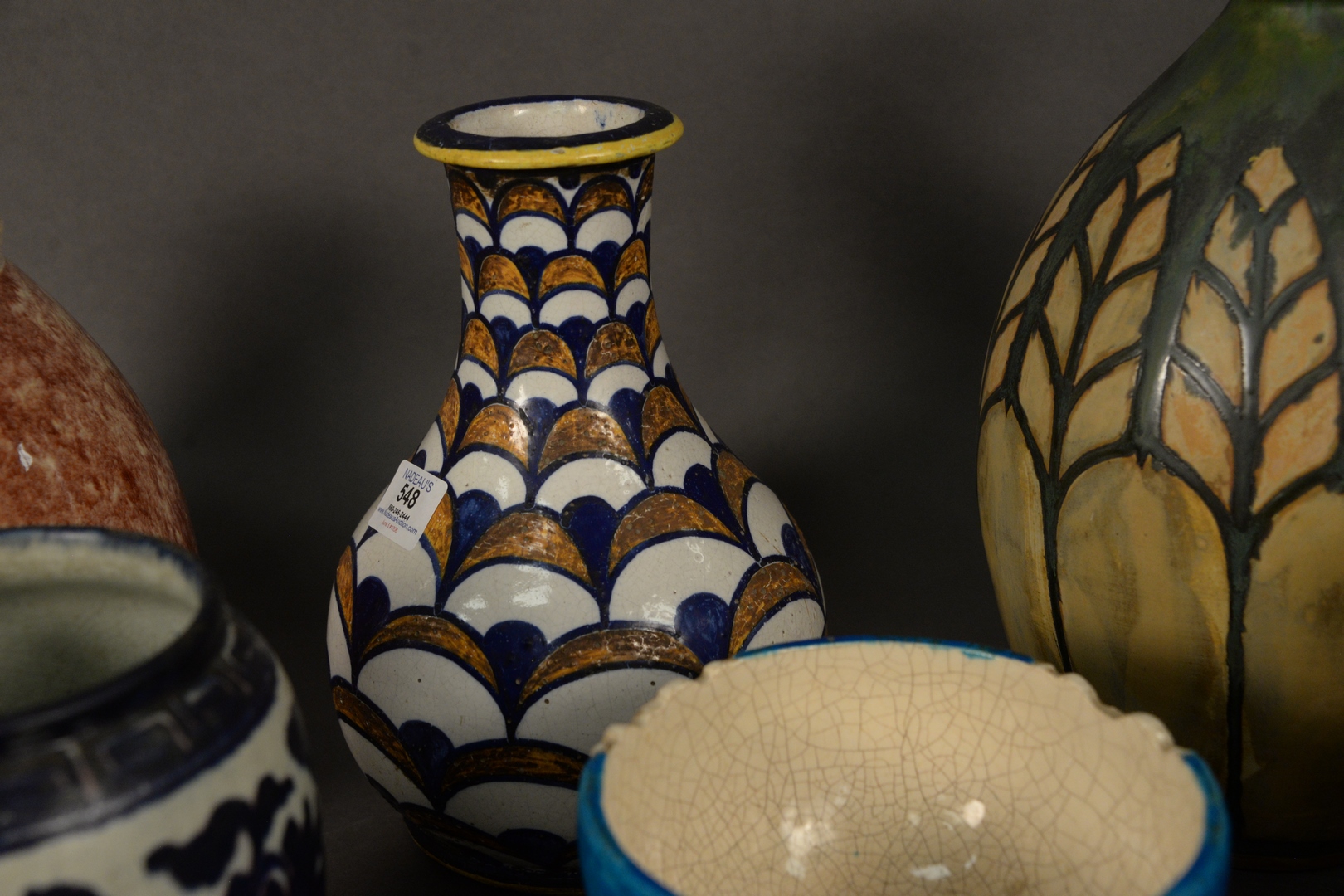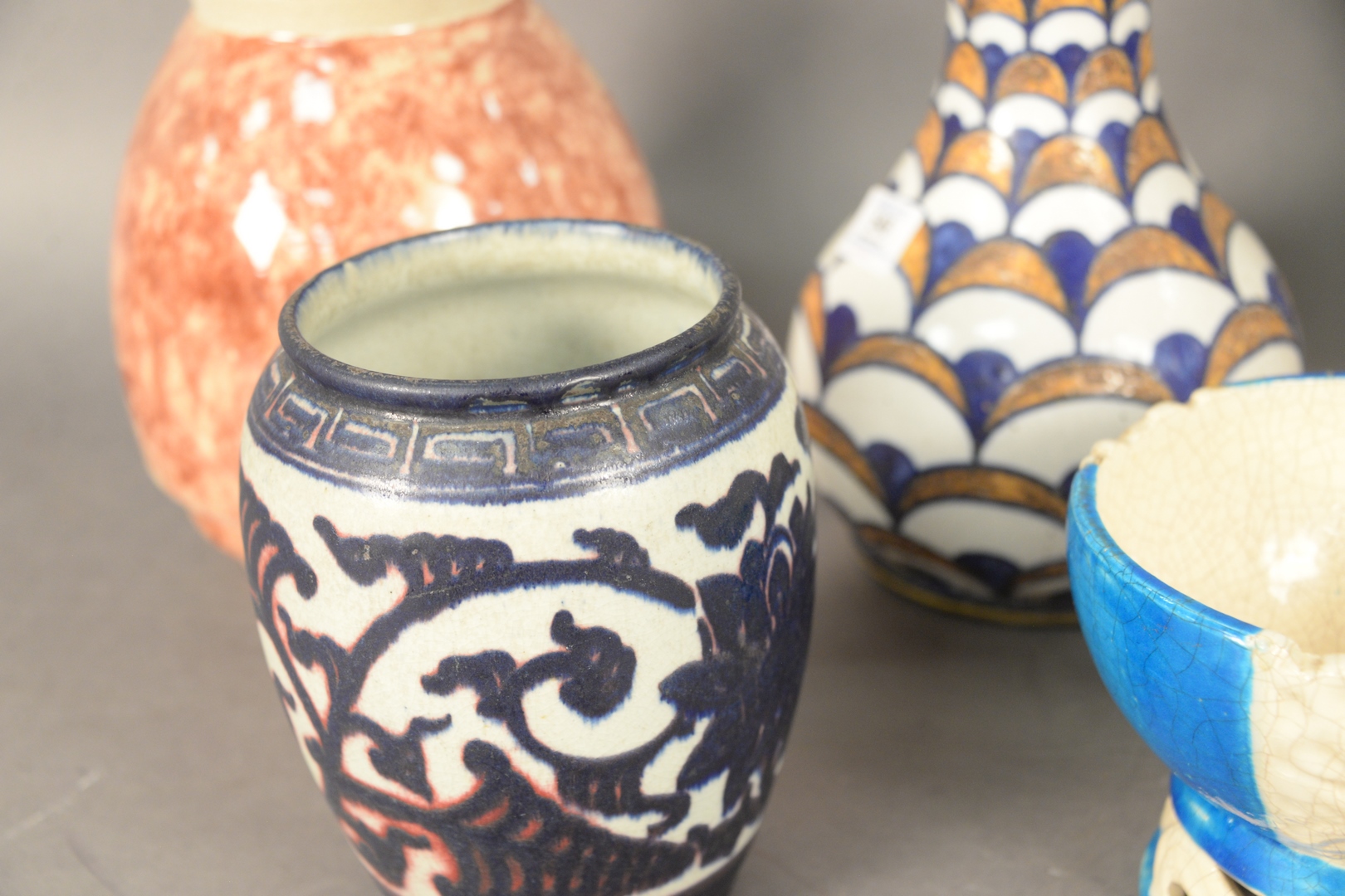 Lot 548: Group of Seven French Ceramic Vessels to include one red glazed vase, marked Marcel Guillard to the underside one vase with green d…