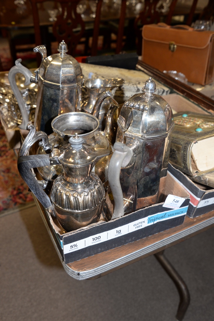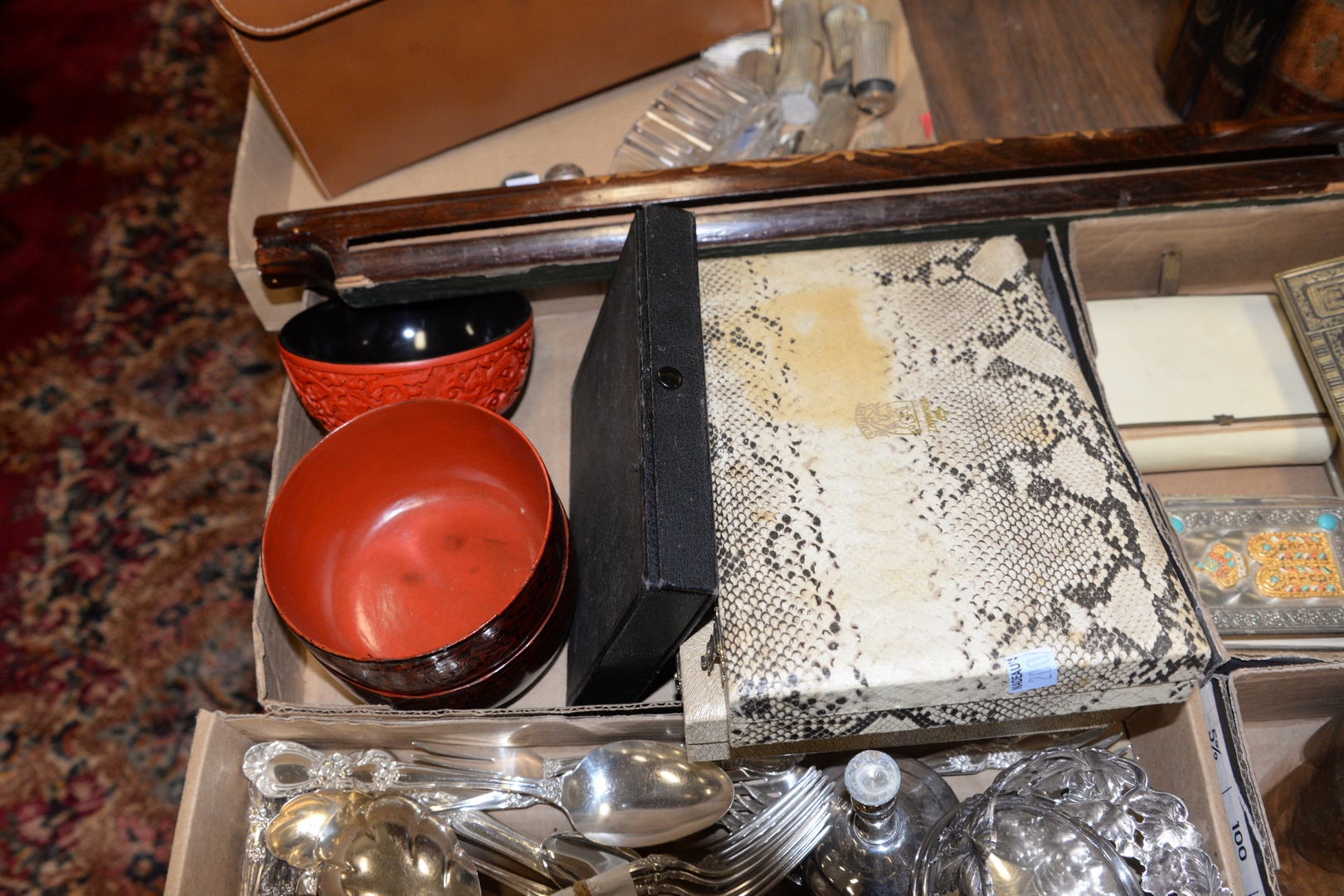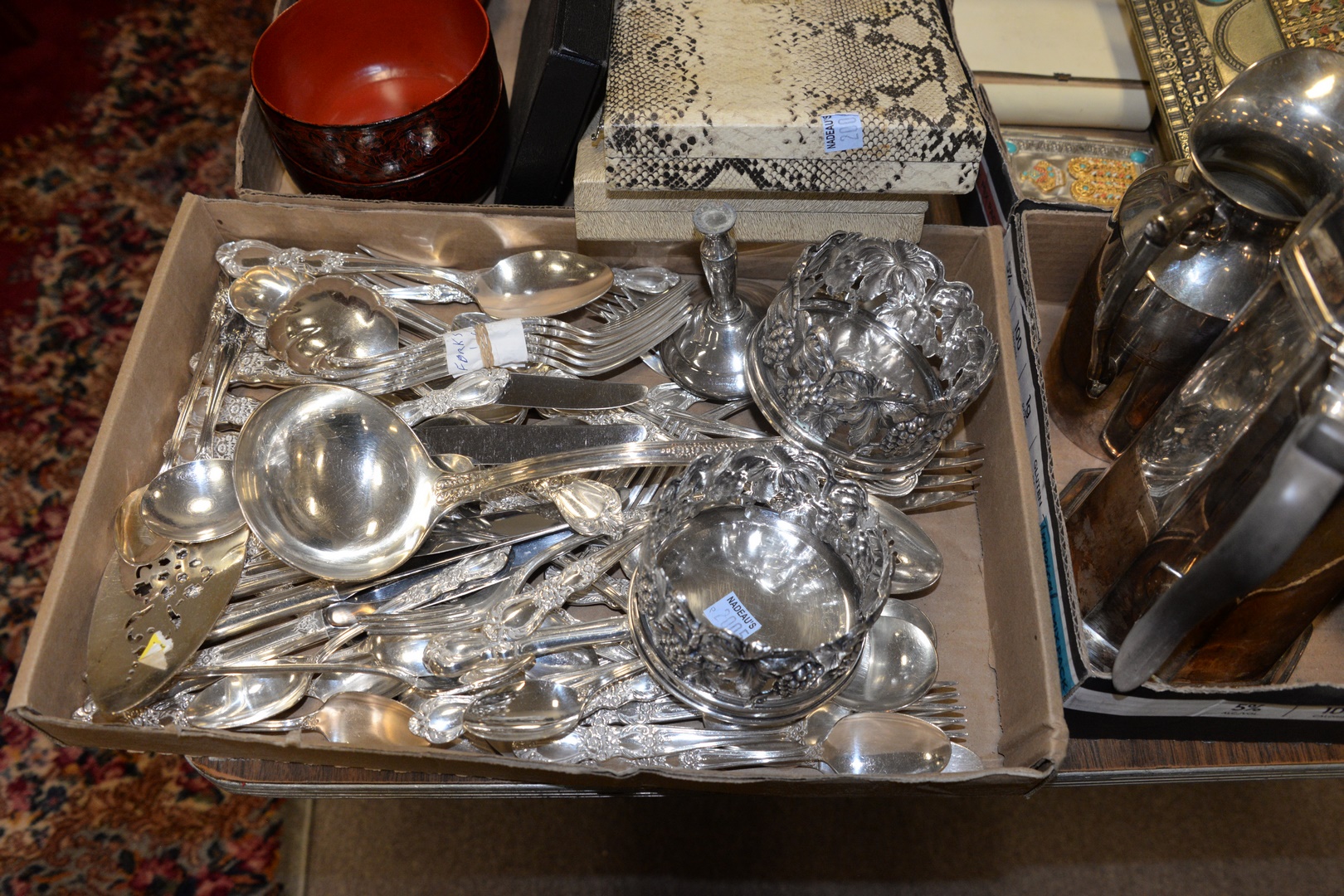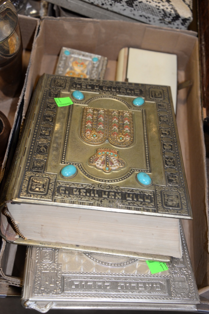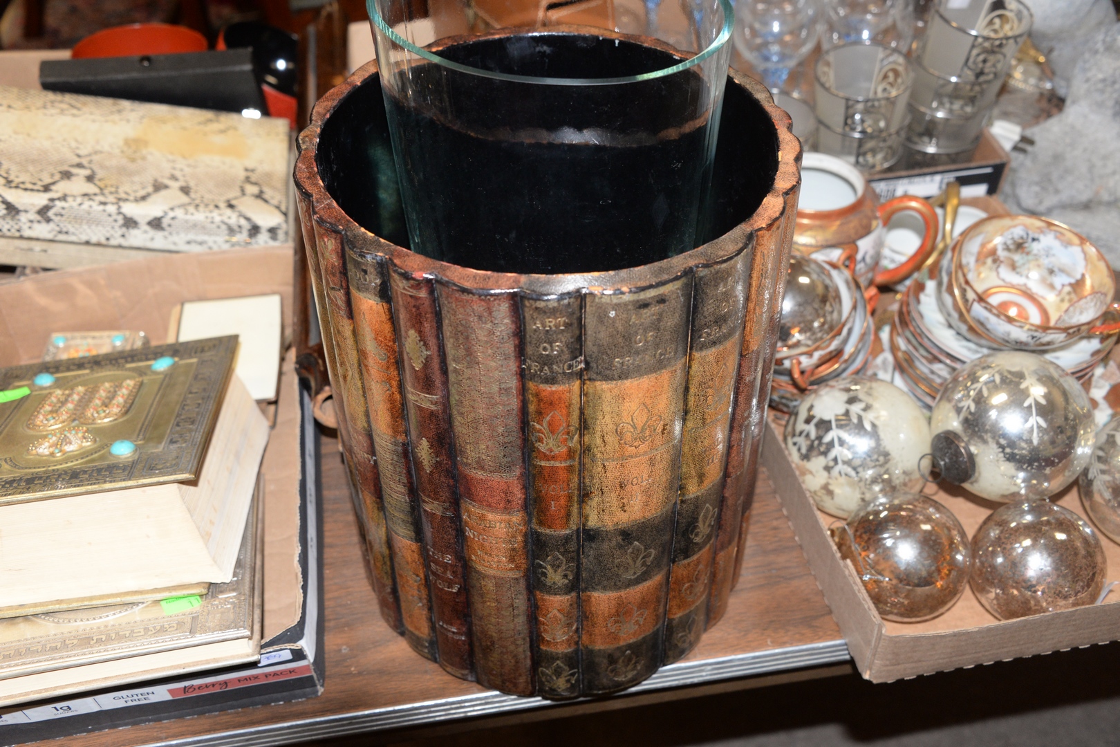 Lot 548: Large Group of Assorted Items to include leather book binder waste paper basket silvered books silverplate, etc.