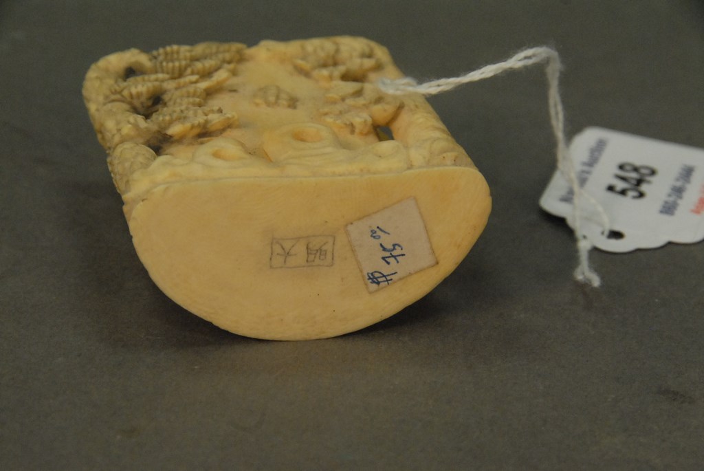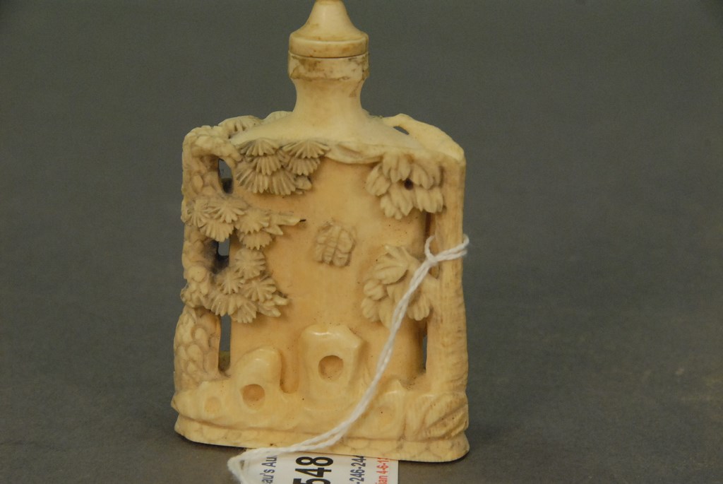 Lot 548: Large ivory snuff bottle with carved tree on each side and two Guanyin figures on front. ht. 3 1/2in.