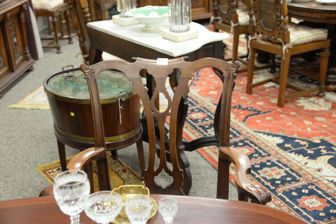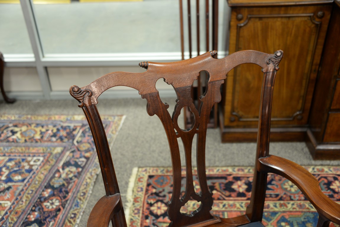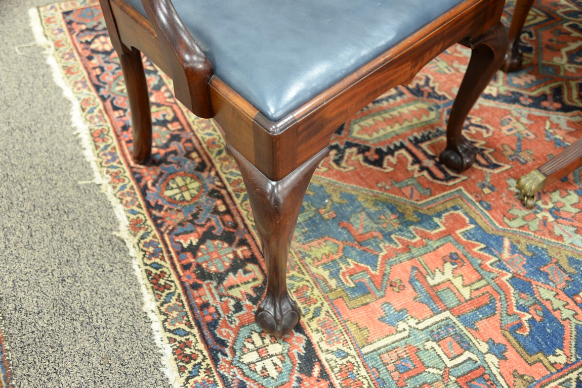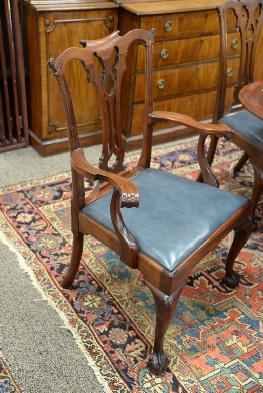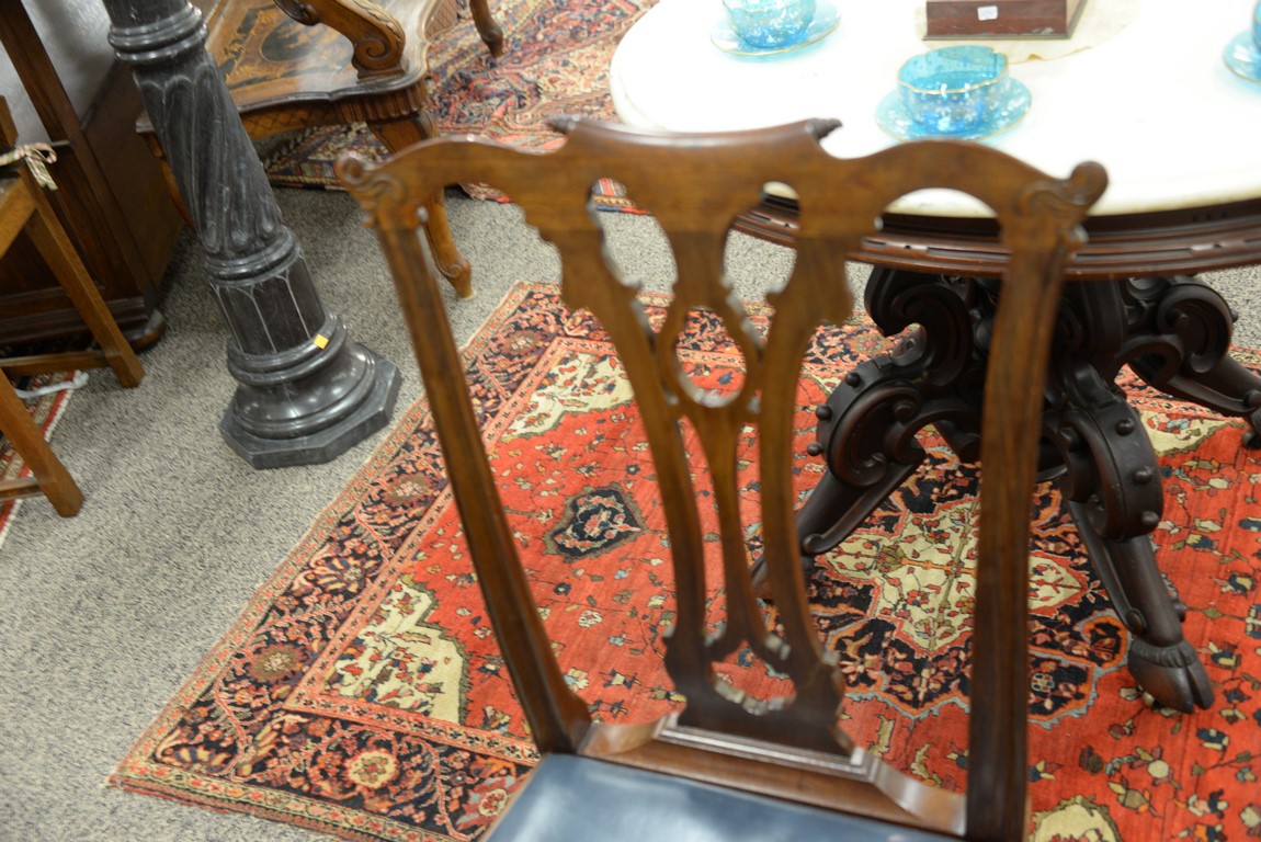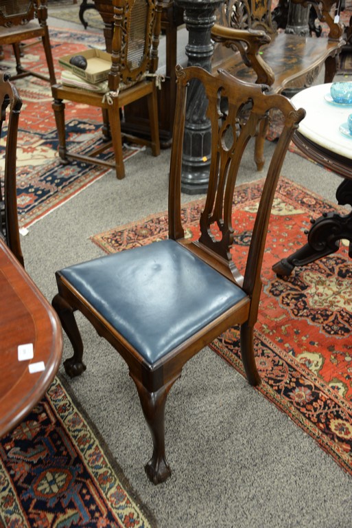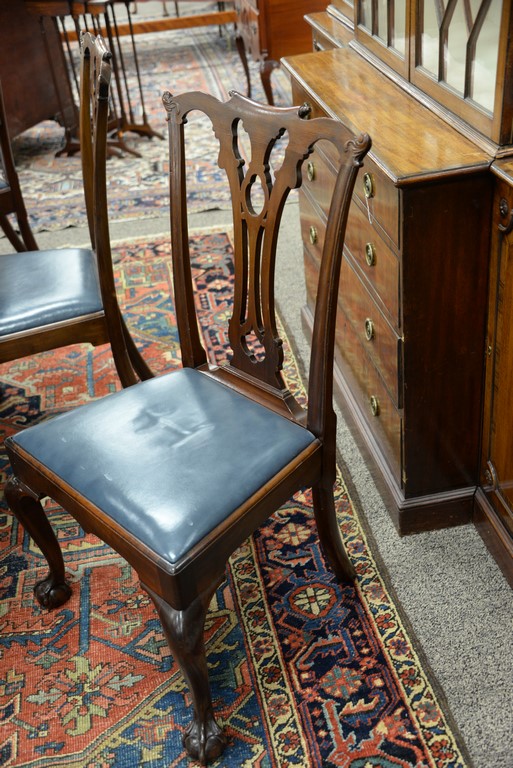 Lot 548: Margolis set of six Chippendale style mahogany chairs with open work back and blue leather slip seats, all set on cabriole legs endi…