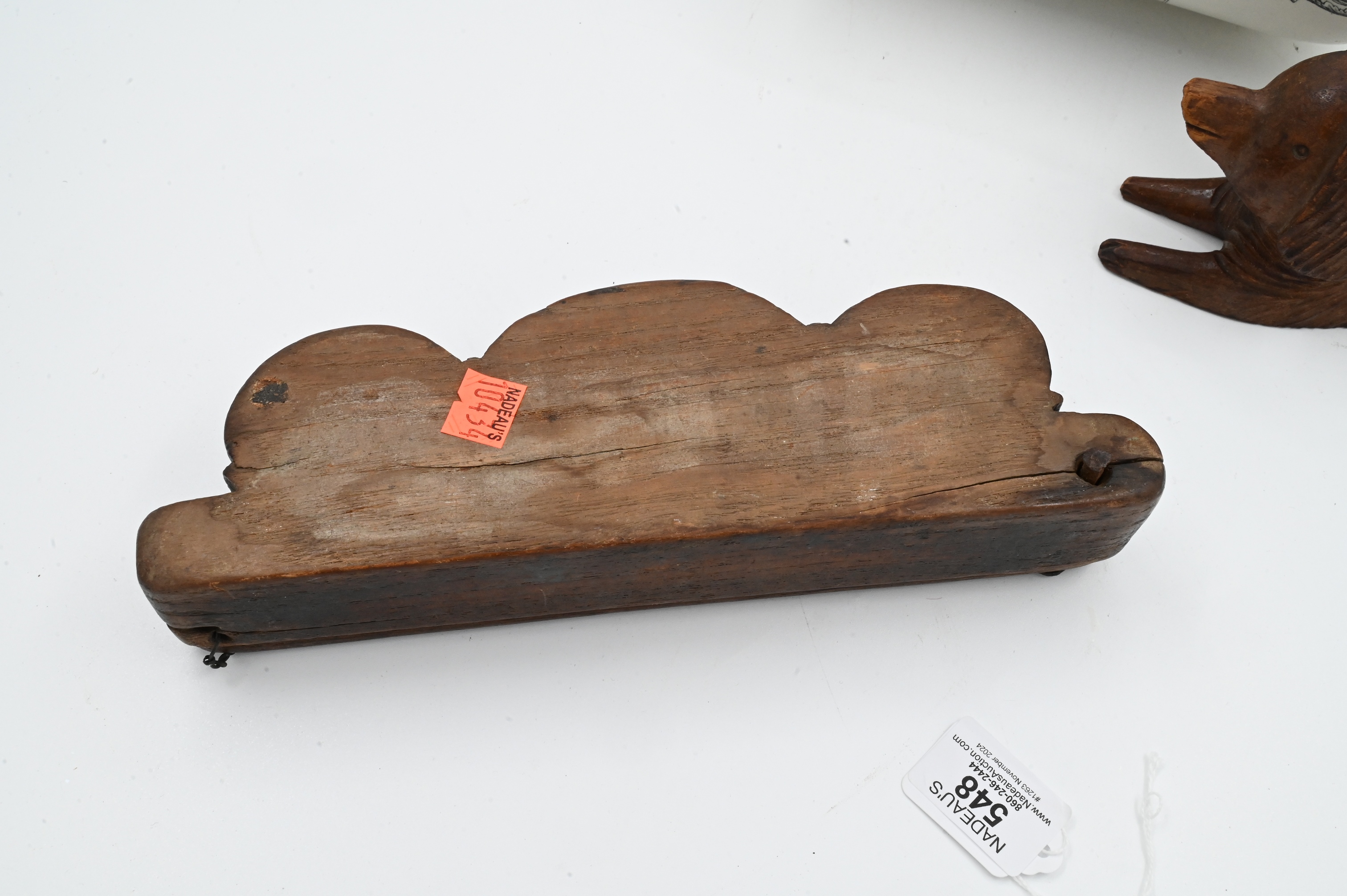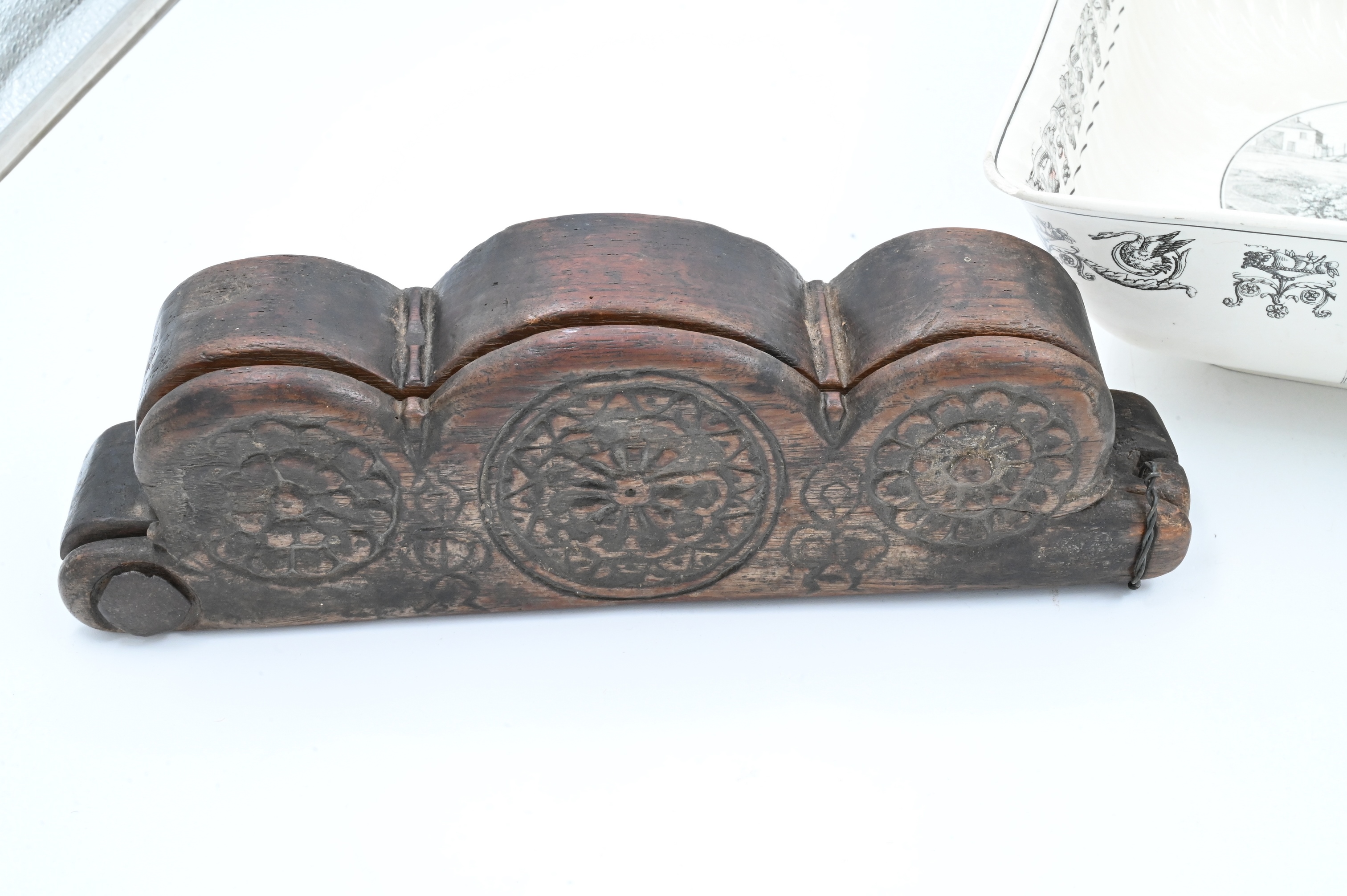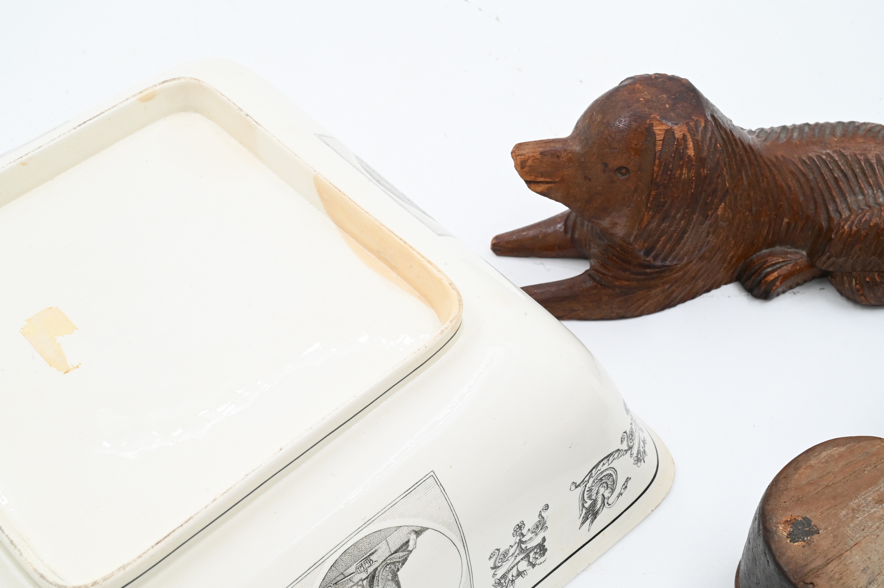 to include carved dog pediment, carved opium scale/weight box, along with an English ironstone bowl
