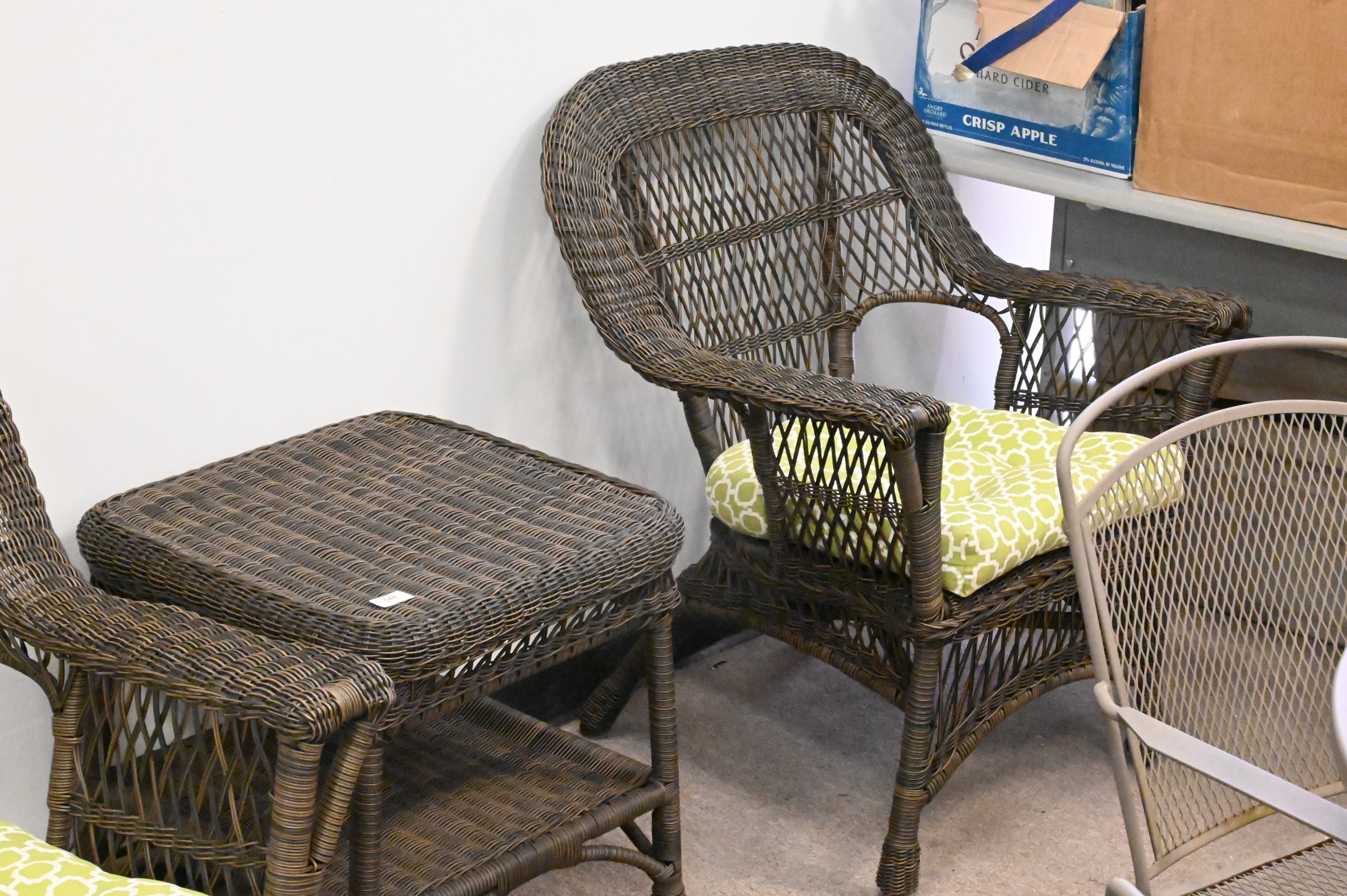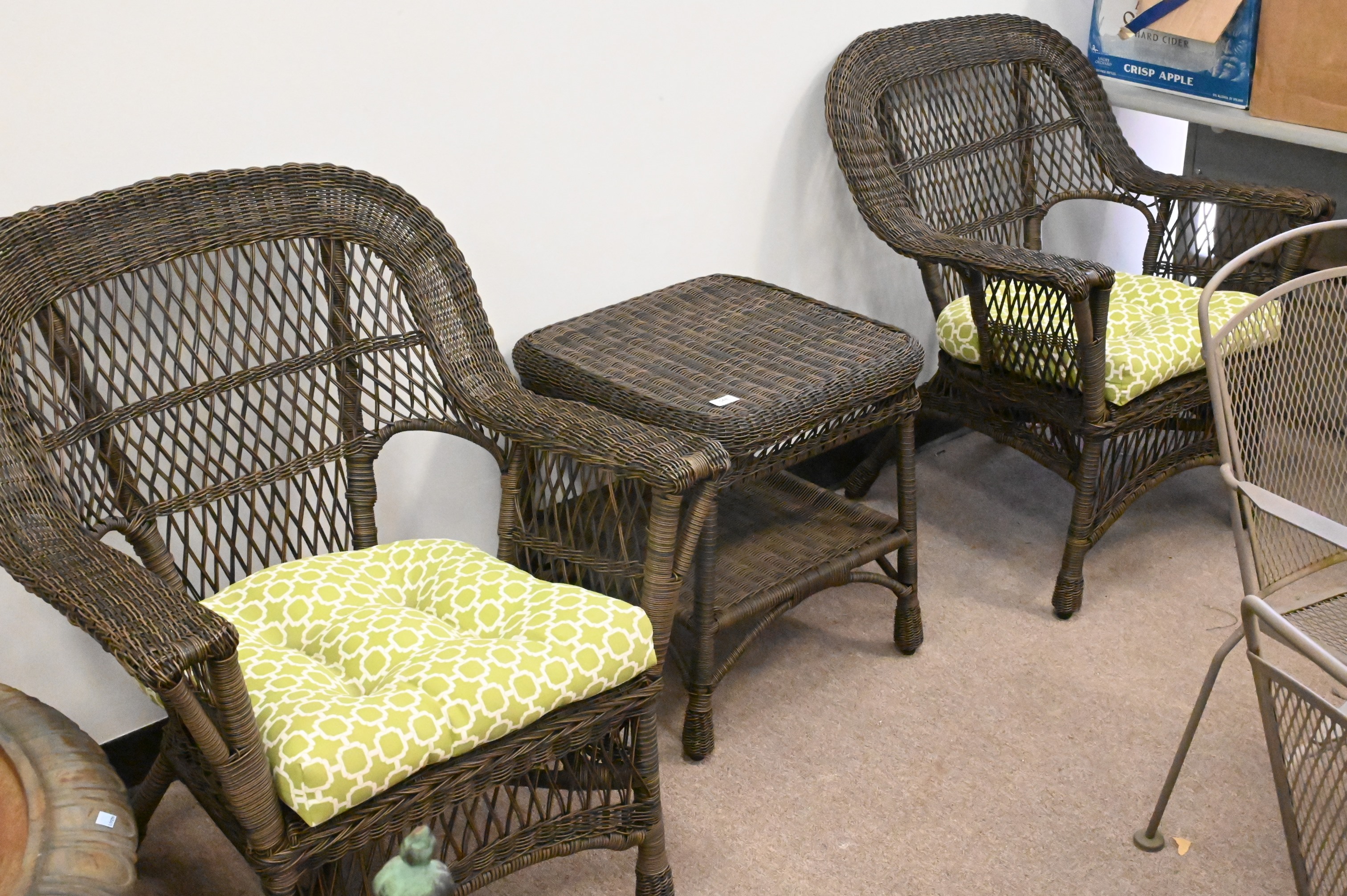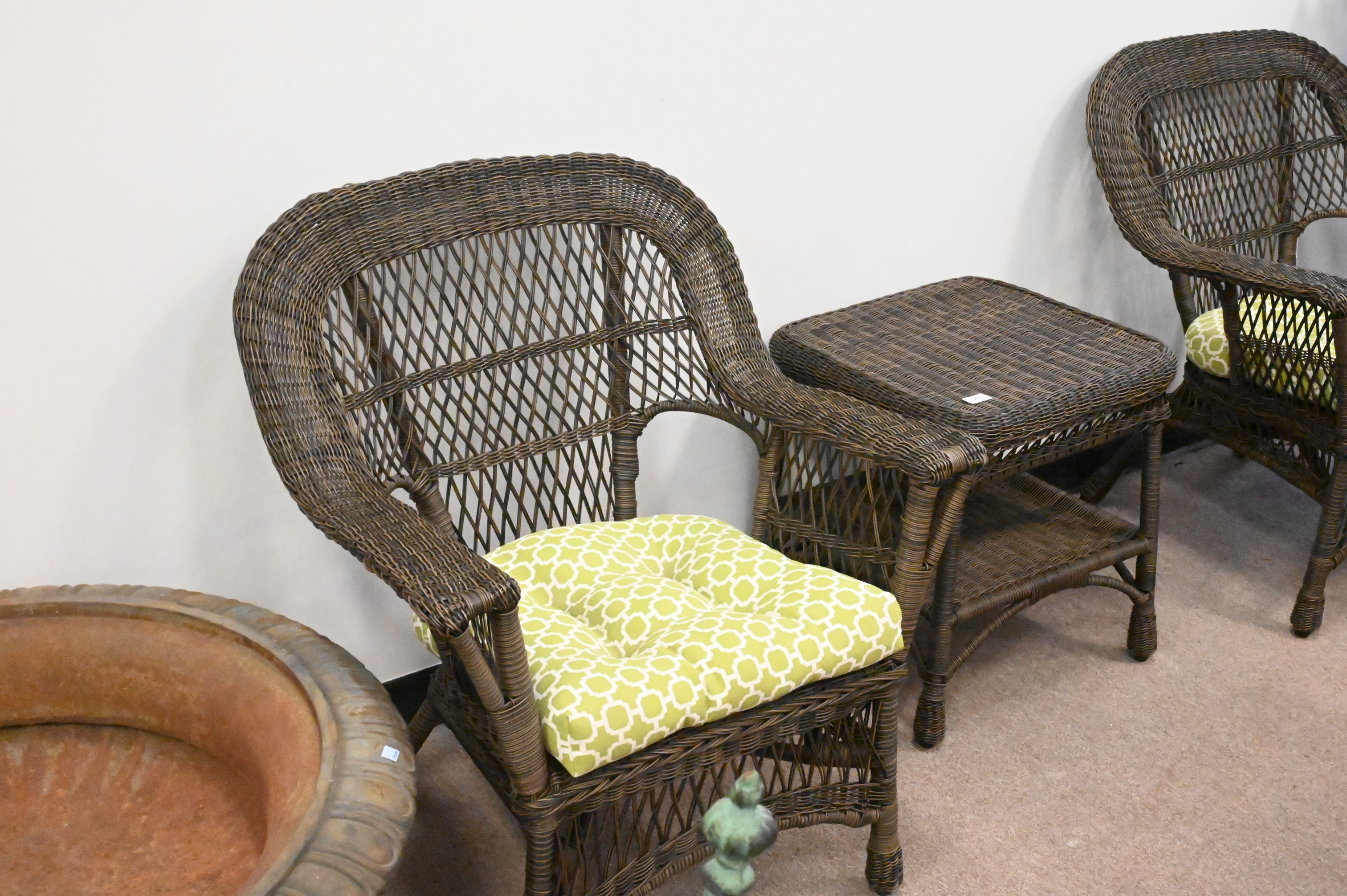 Three Piece Wickers Set, to include two arm chairs (height 37 inches, width 29 inches), each with seat cushion, along with a side table (height 22 inches, top 19″ x 19″)