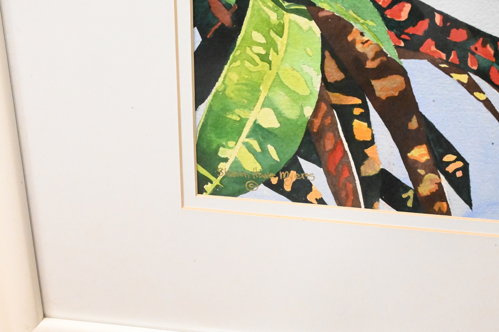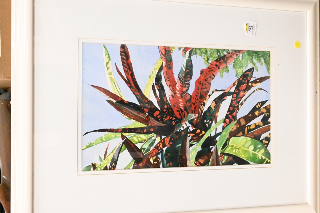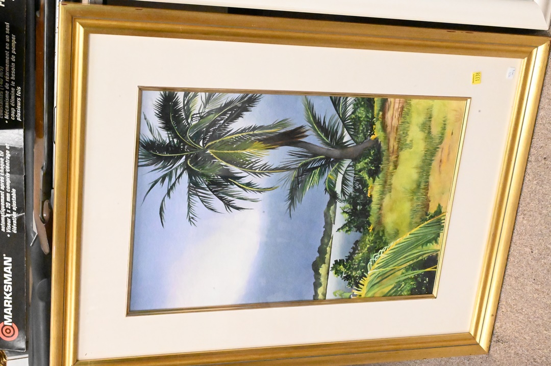 Two Sharon Howe Myers Watercolors, one depicting palm trees on coast, the other having colorful tree, each signed lower left Sharon Howe Myers, each 19 1/2″ x 11 1/2″.