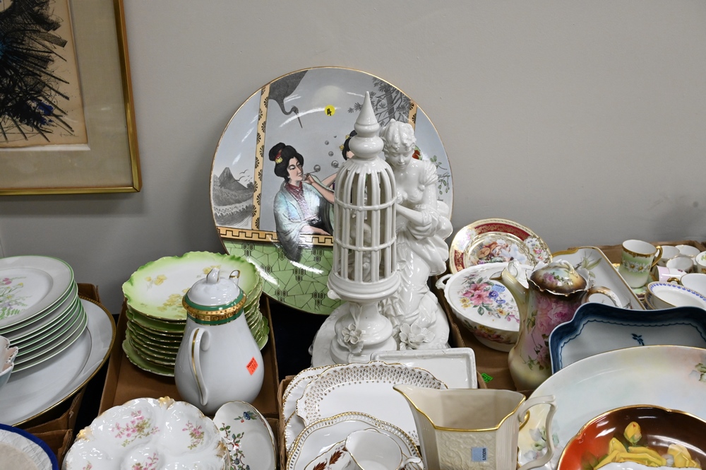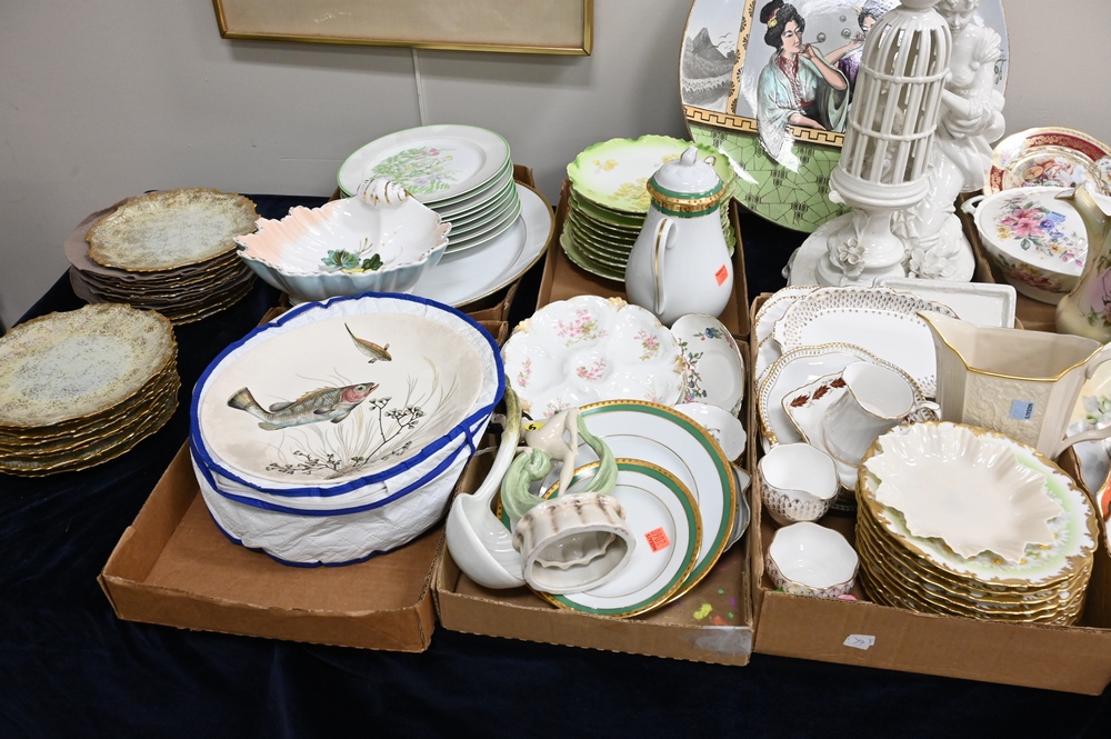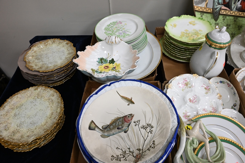 Lot 549: Large Group of Assorted Porcelain, to include hand painted Limoge, oyster plate, Bavarian luncheon set, Johnson Brothers fish plates, design number 2, Villeroy and Boch charger with two Japanese ladies.