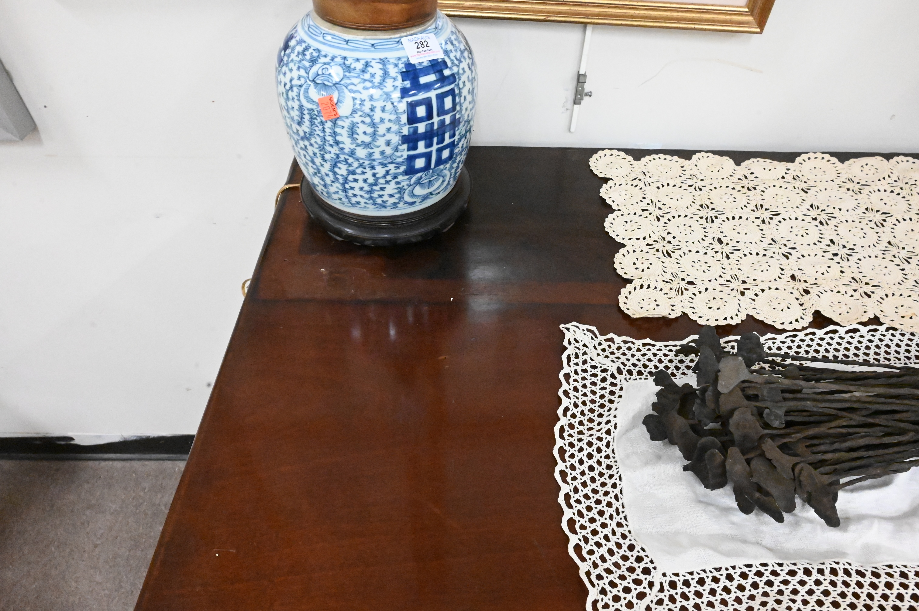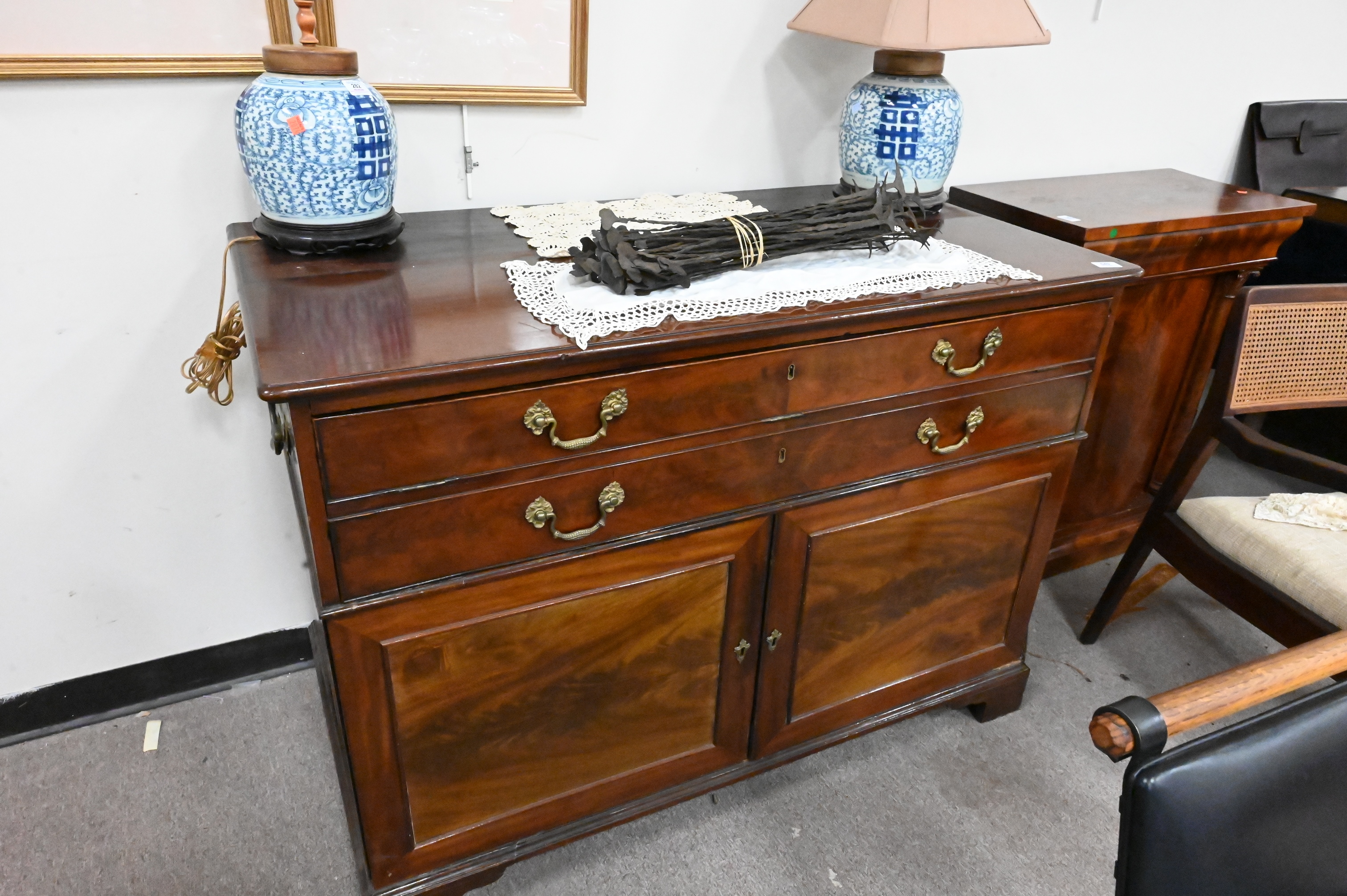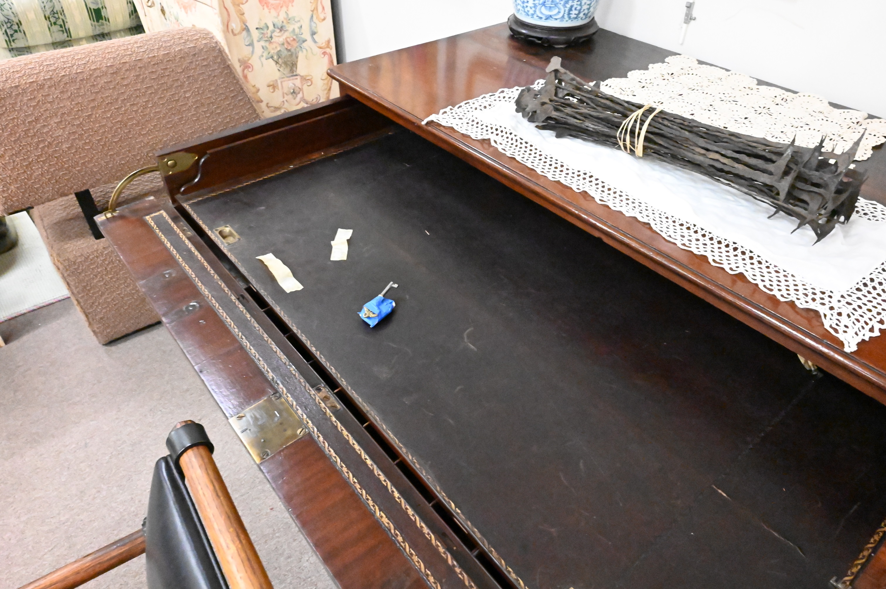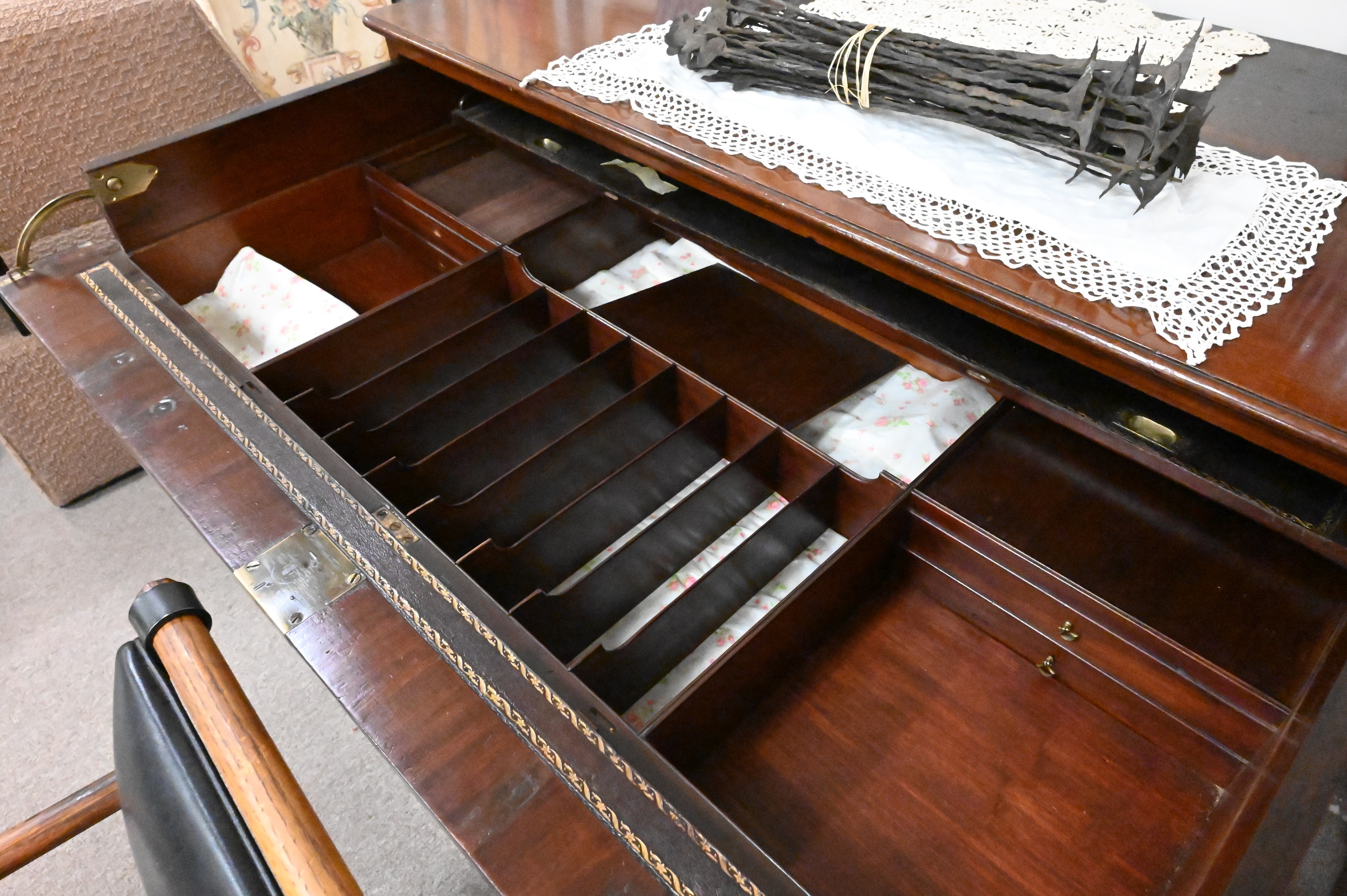 Mahogany Secretary Desk, (base only) having drop front desk over two doors, no top section, height 35 inches, top 25 1/2″ x 49″. Provenance: Property from a private New York collection sold to benefit charitable foundations.