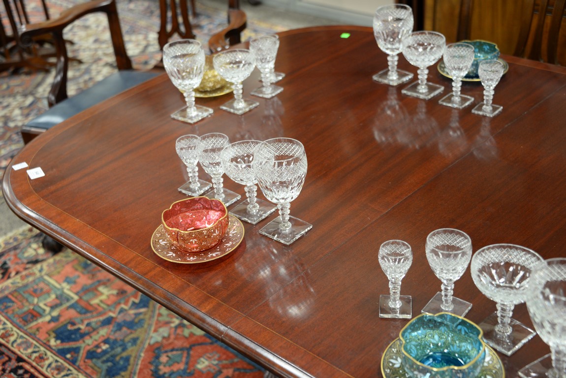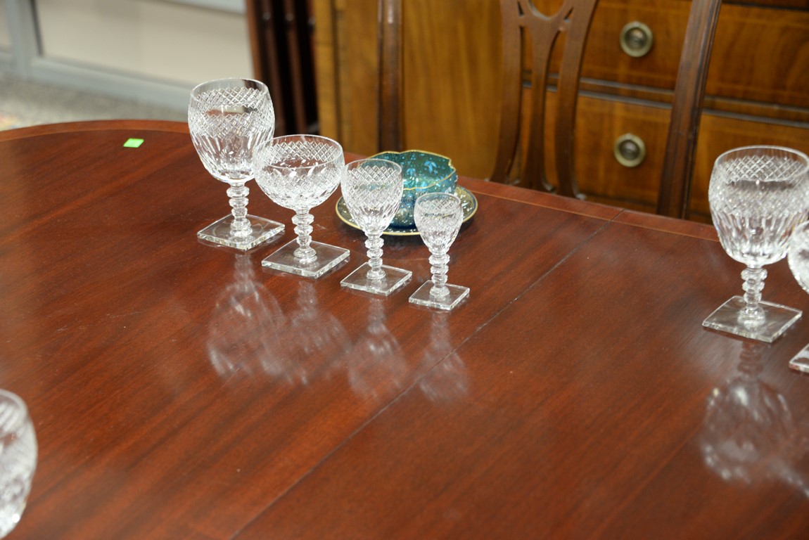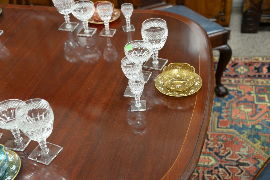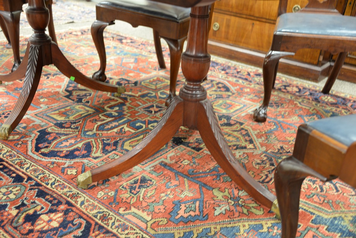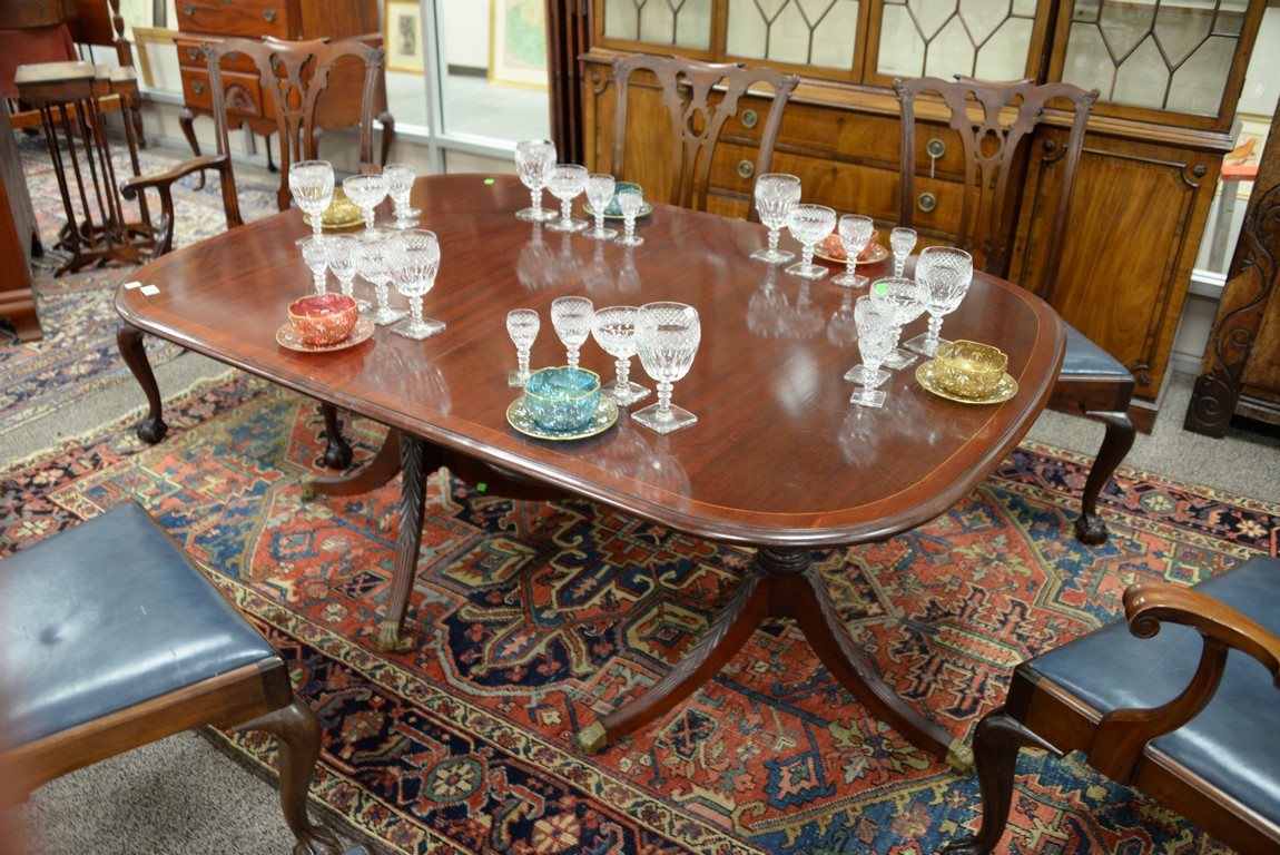 Lot 549: Margolis mahogany dining table having carved double pedestal base, table with banded inlaid top and leaves