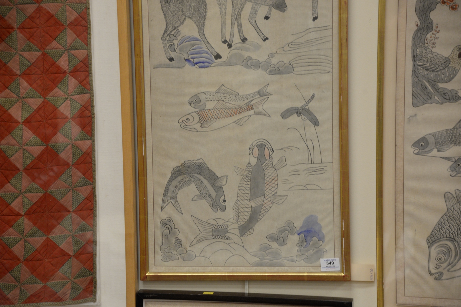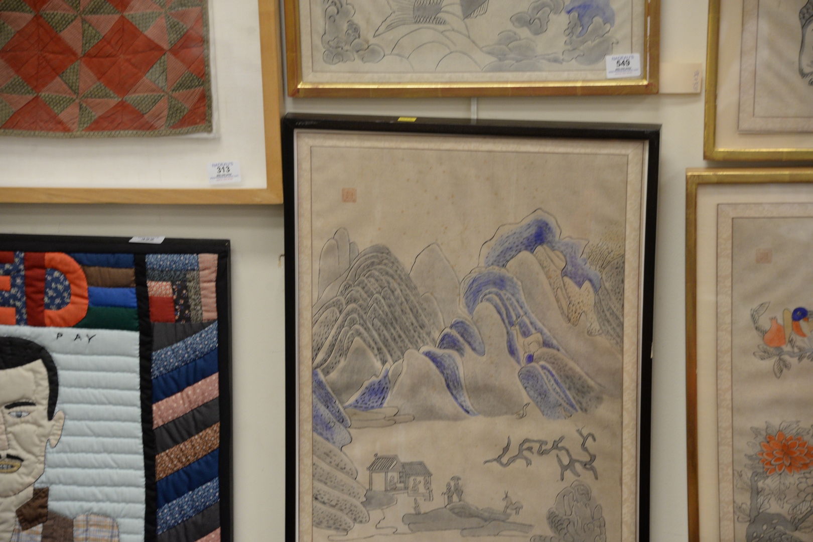 Lot 549: Two Korean Oil on Linen Wedding Scrolls, one with a mountainous landscape the other having two deer, image of each: 35 x 14 1/2.