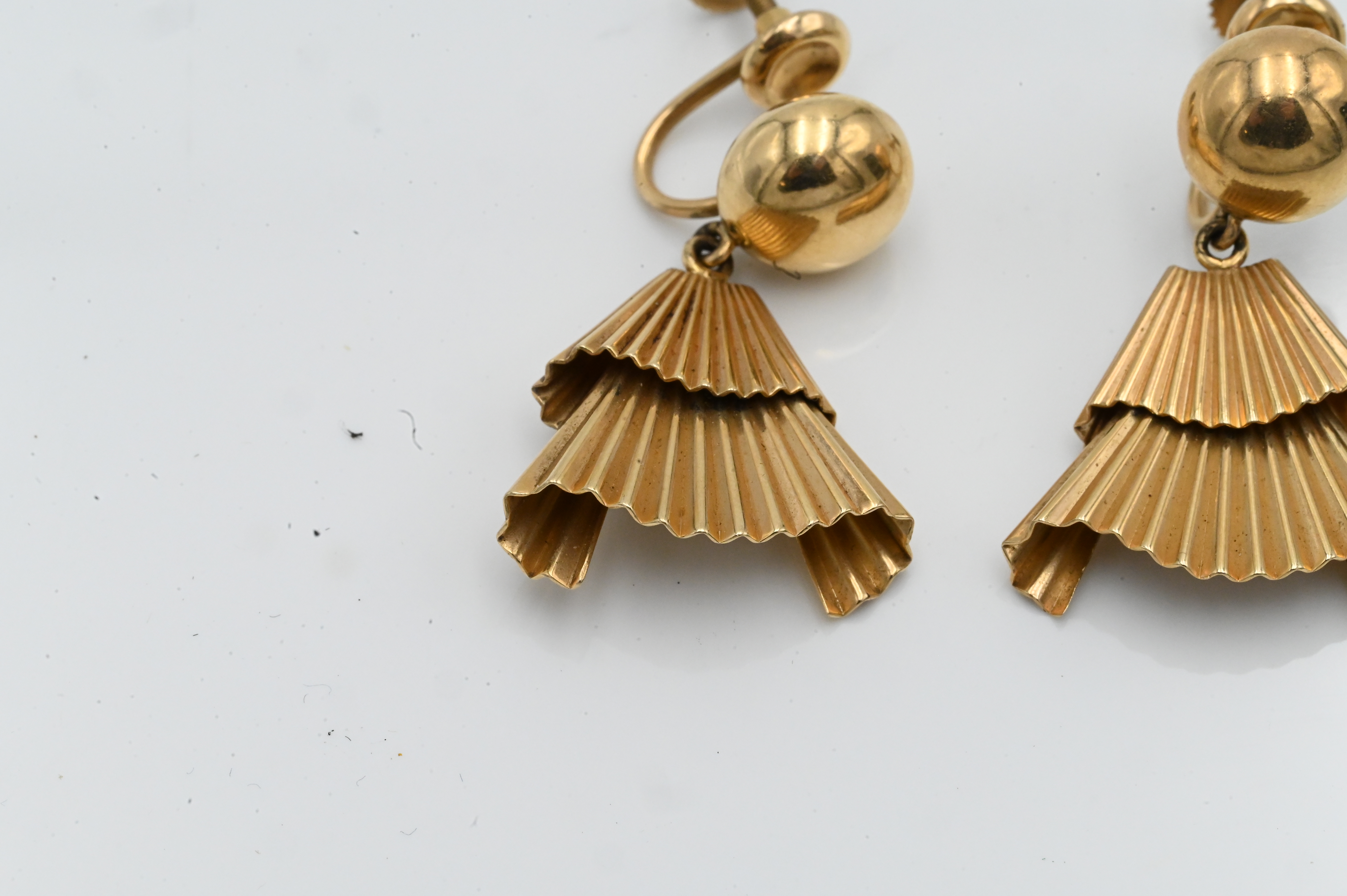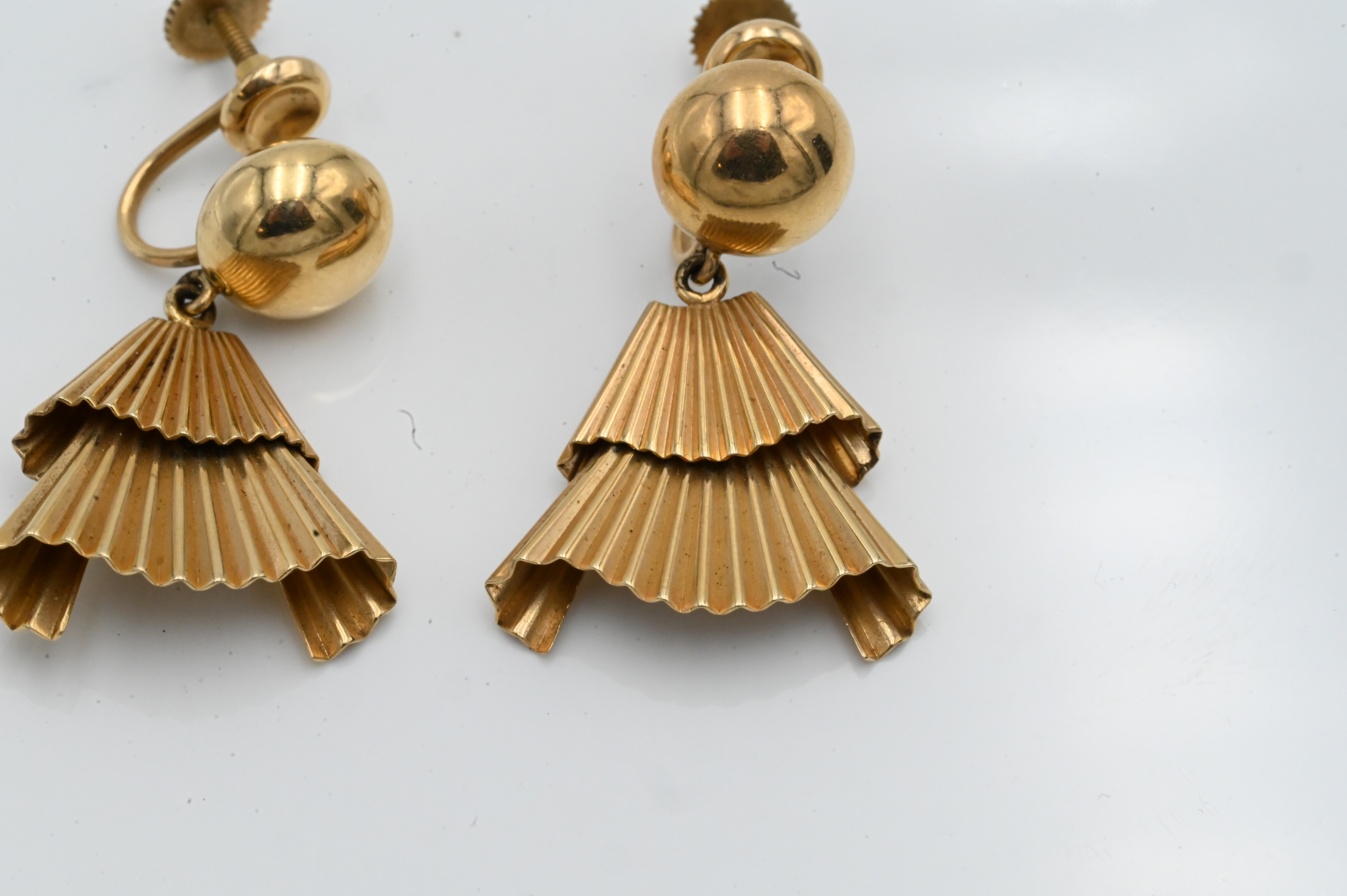 A Pair of 14 Karat Yellow Gold Tiffany & Company Earrings, having ball and double fan design, screw backs, 9.4 grams.